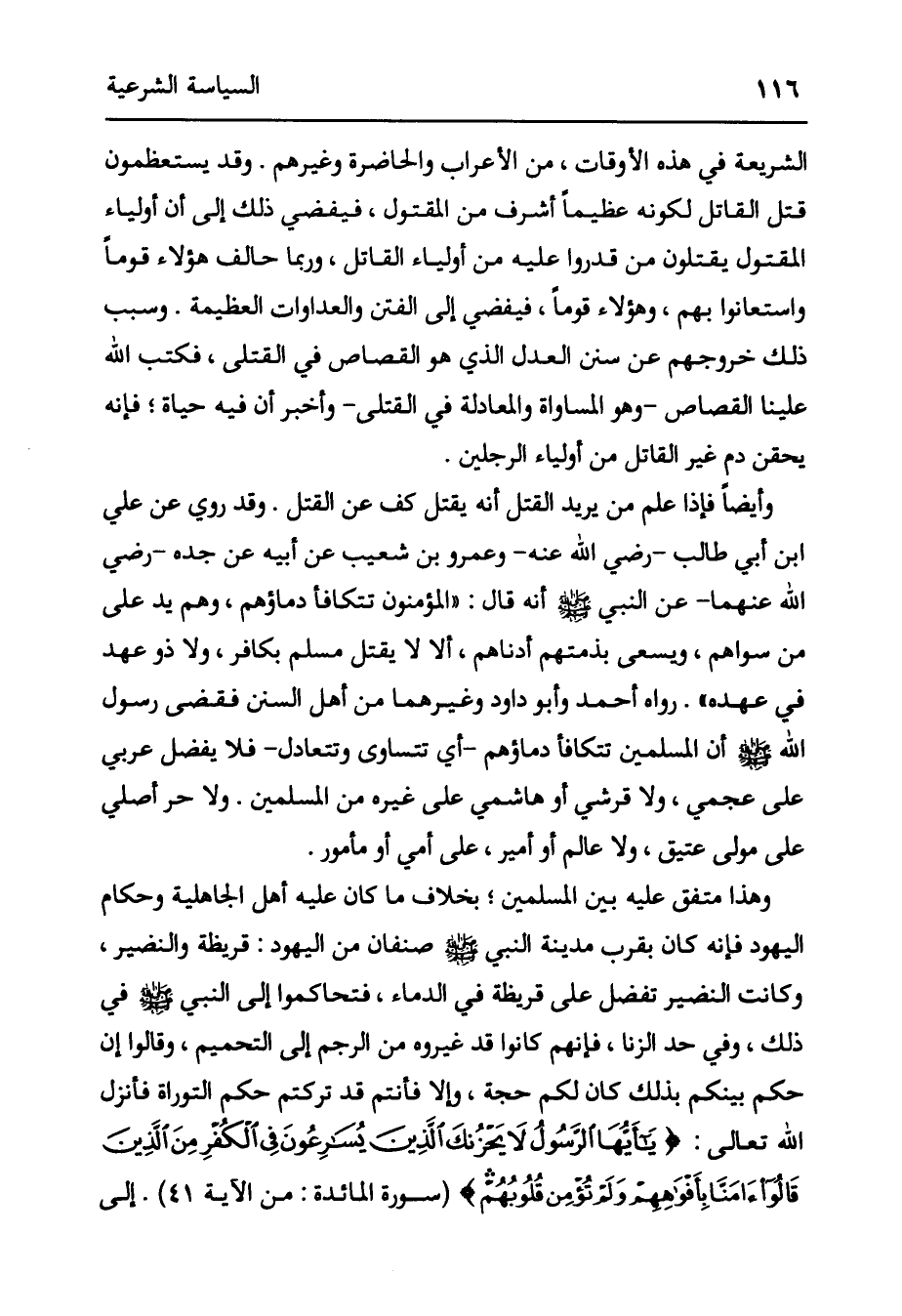 الشَّرِيعَةِ فِي هَذِهِ الْأَوْقَاتِ، مِنْ الْأَعْرَابِ وَالْحَاضِرَةِ وَغَيْرِهِمْ. وَقَدْ يَسْتَعْظِمُونَ قَتْلَ الْقَاتِلَ لِكَوْنِهِ عَظِيمًا أشرف من المقتول، فيفضي ذلك إلى أن أَوْلِيَاءِ الْمَقْتُولِ يَقْتُلُونَ مَنْ قَدَرُوا عَلَيْهِ مِنْ أَوْلِيَاءِ الْقَاتِلِ، وَرُبَمَا حَالَفَ هَؤُلَاءِ قَوْمًا وَاسْتَعَانُوا بِهِمْ، وَهَؤُلَاءِ قَوْمًا، فَيُفْضِي إلَى الْفِتَنِ وَالْعَدَاوَاتِ الْعَظِيمَةِ. وَسَبَبُ ذَلِكَ خُرُوجُهُمْ عَنْ سُنَنِ الْعَدْلِ الَّذِي هُوَ الْقِصَاصُ فِي الْقَتْلَى، فَكَتَبَ اللَّهُ عَلَيْنَا الْقِصَاصَ -وَهُوَ الْمُسَاوَاةُ وَالْمُعَادَلَةُ فِي الْقَتْلَى- وَأَخْبَرَ أَنَّ فِيهِ حَيَاةً؛ فَإِنَّهُ يَحْقِنُ دَمَ غير القاتل من أولياء الرجلين. وأيضاً فإذا عِلْمُ مَنْ يُرِيدُ الْقَتْلَ أَنَّهُ يُقْتَلُ كَفٌّ عن القتل. وقد روي عن علي ابن أَبِي طَالِبٍ -رَضِيَ اللَّهُ عَنْهُ- وَعَمْرِو بْنِ شُعَيْبٍ عَنْ أَبِيهِ عَنْ جَدِّهِ -رَضِيَ اللَّهُ عَنْهُمَا- عَنْ النَّبِيِّ صَلَّى اللَّهُ عَلَيْهِ وَسَلَّمَ أَنَّهُ قَالَ: «الْمُؤْمِنُونَ تَتَكَافَأُ دِمَاؤُهُمْ، وَهُمْ يَدٌ عَلَى مَنْ سُوَاهُمْ، وَيَسْعَى بِذِمَّتِهِمْ أَدْنَاهُمْ، أَلَا لَا يُقْتَلُ مُسْلِمٌ بِكَافِرٍ، وَلَا ذُو عَهْدٍ فِي عَهْدِهِ» . رَوَاهُ أَحْمَدُ وَأَبُو دَاوُد وَغَيْرُهُمَا مِنْ أَهْلِ السُّنَنِ فَقَضَى رَسُولُ اللَّهِ صَلَّى اللَّهُ عَلَيْهِ وَسَلَّمَ أَنَّ الْمُسْلِمِينَ تَتَكَافَأُ دِمَاؤُهُمْ -أَيْ تَتَسَاوَى وَتَتَعَادَلُ- فَلَا يُفَضَّلُ عَرَبِيٌّ عَلَى عَجَمِيٍّ، وَلَا قُرَشِيٌّ أَوْ هَاشِمِيٌّ عَلَى غَيْرِهِ مِنْ الْمُسْلِمِينَ. وَلَا حُرٌّ أَصْلِيٌّ عَلَى مَوْلًى عَتِيقٍ، وَلَا عَالِمٌ أَوْ أَمِيرٌ، عَلَى أُمِّيٍّ أَوْ مَأْمُورٍ. وَهَذَا مُتَّفَقٌ عَلَيْهِ بَيْنَ الْمُسْلِمِينَ؛ بِخِلَافِ مَا كَانَ عَلَيْهِ أَهْلُ الْجَاهِلِيَّةِ وَحُكَّامُ الْيَهُودِ فَإِنَّهُ كَانَ بِقُرْبِ مَدِينَةِ النَّبِيِّ صَلَّى اللَّهُ عَلَيْهِ وَسَلَّمَ صِنْفَانِ مِنْ الْيَهُودِ: قُرَيْظَةَ والنضير، وكانت النضير تفضل عَلَى قُرَيْظَةَ فِي الدِّمَاءِ، فَتَحَاكَمُوا إلَى النَّبِيِّ صَلَّى اللَّهُ عَلَيْهِ وَسَلَّمَ فِي ذَلِكَ، وَفِي حَدِّ الزِّنَا، فَإِنَّهُمْ كَانُوا قَدْ غَيَّرُوهُ مِنْ الرجم إلى التحميم، وقالوا إن حكم بينكم بِذَلِكَ كَانَ لَكُمْ حُجَّةٌ، وَإِلَّا فَأَنْتُمْ قَدْ تَرَكْتُمْ حُكْمَ التَّوْرَاةِ فَأَنْزَلَ اللَّهُ تَعَالَى: {يَا أَيُّهَا الرَّسُولُ لَا يَحْزُنْكَ الَّذِينَ يُسَارِعُونَ فِي الْكُفْرِ مِنَ الَّذِينَ قَالُوا آمَنَّا بِأَفْوَاهِهِمْ وَلَمْ تُؤْمِنْ قُلُوبُهُمْ} [المائدة: 41] (سورة المائدة: من الآية 41) . إلى