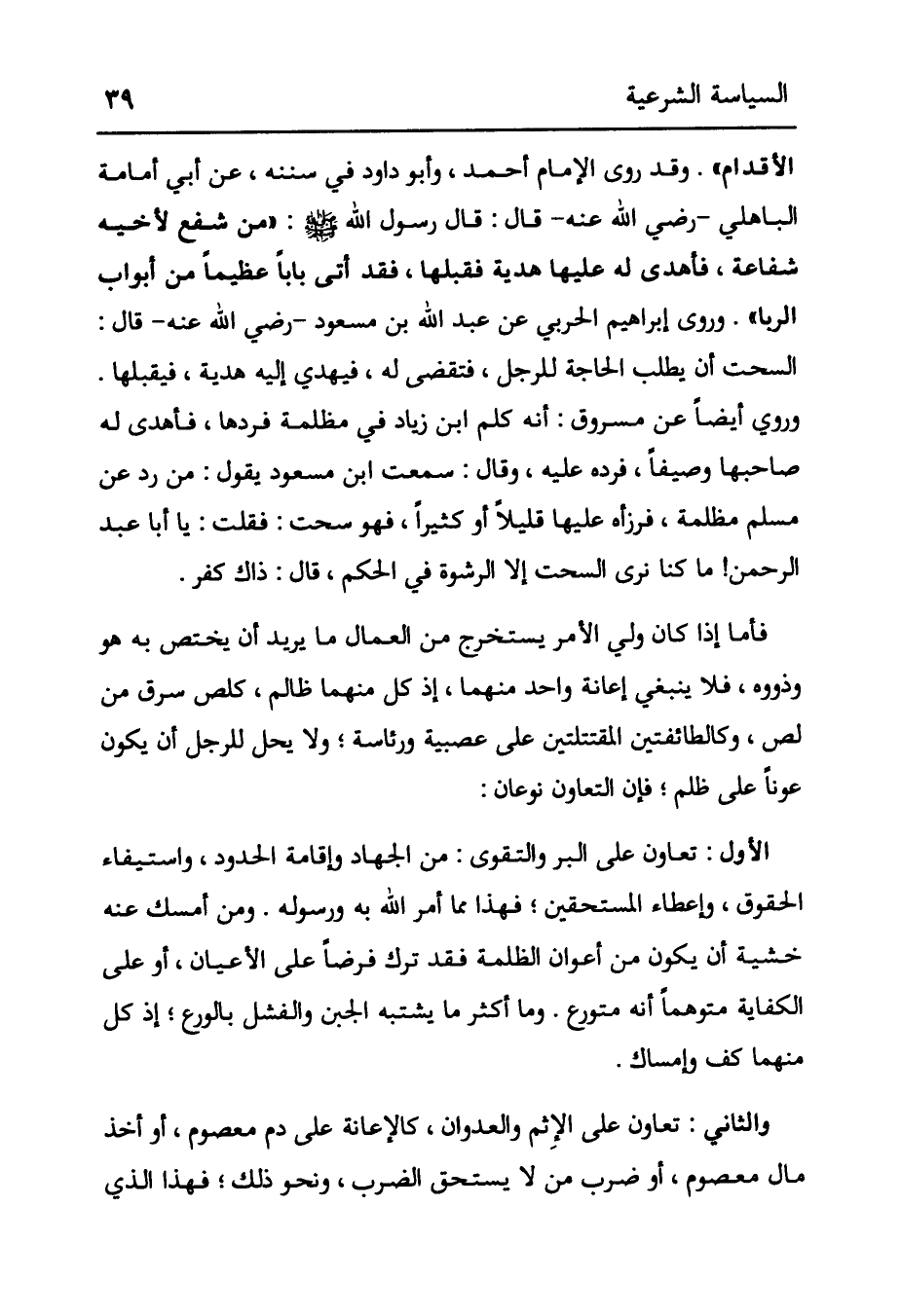 الْأَقْدَامُ» . وَقَدْ رَوَى الْإِمَامُ أَحْمَدُ، وَأَبُو دَاوُد فِي سُنَنِهِ، عَنْ أَبِي أُمَامَةَ الْبَاهِلِيِّ -رَضِيَ اللَّهُ عَنْهُ- قَالَ: قَالَ رَسُولُ اللَّهِ صَلَّى اللَّهُ عَلَيْهِ وَسَلَّمَ: «مَنْ شَفَعَ لِأَخِيهِ شَفَاعَةً، فَأَهْدَى لَهُ عَلَيْهَا هَدِيَّةً فَقَبِلَهَا، فَقَدْ أَتَى باباً غيماً مِنْ أَبْوَابِ الرِّبَا» . وَرَوَى إبْرَاهِيمُ الْحَرْبِيُّ عَنْ عبد الله بن مسعود -رضي الله عنه- قال: السحت أن يطلب الحاجة للرجل، فتقضى له، فيهدي إليه هدية، فَيَقْبَلَهَا. وَرُوِيَ أَيْضًا عَنْ مَسْرُوقٍ: أَنَّهُ كَلَّمَ ابْنَ زِيَادٍ فِي مَظْلِمَةٍ فَرَدَّهَا، فَأَهْدَى لَهُ صَاحِبُهَا وَصَيْفًا، فَرَدَّهُ عَلَيْهِ، وَقَالَ: سَمِعْتُ ابْنَ مَسْعُودٍ يَقُولُ: مَنْ رَدَّ عَنْ مُسْلِمٍ مَظْلِمَةً، فَرَزَأَهُ عَلَيْهَا قَلِيلًا أَوْ كَثِيرًا، فَهُوَ سُحْتٌ: فَقُلْتُ: يَا أَبَا عَبْدِ الرَّحْمَنِ! مَا كُنَّا نَرَى السُّحْتَ إلَّا الرِّشْوَةَ فِي الْحُكْمِ، قَالَ: ذَاكَ كُفْرٌ. فَأَمَّا إذَا كَانَ وَلِيُّ الْأَمْرِ يَسْتَخْرِجُ مِنْ الْعُمَّالِ مَا يُرِيدُ أَنْ يَخْتَصَّ بِهِ هُوَ وَذَوُوه، فَلَا يَنْبَغِي إعَانَةُ وَاحِدٍ مِنْهُمَا، إذْ كُلٌّ مِنْهُمَا ظَالِمٌ، كَلِصٍّ سَرَقَ مِنْ لِصٍّ، وَكَالطَّائِفَتَيْنِ الْمُقْتَتِلَتَيْنِ عَلَى عَصَبِيَّةٍ وَرِئَاسَةٍ؛ وَلَا يَحِلُّ لِلرَّجُلِ أَنْ يَكُونَ عَوْنًا عَلَى ظُلْمٍ؛ فَإِنَّ التَّعَاوُنَ نَوْعَانِ: الْأَوَّلُ: تَعَاوُنٌ عَلَى الْبِرِّ وَالتَّقْوَى: مِنْ الْجِهَادِ وَإِقَامَةِ الْحُدُودِ، وَاسْتِيفَاءِ الْحُقُوقِ، وَإِعْطَاءِ الْمُسْتَحَقِّينَ؛ فَهَذَا مِمَّا أَمَرَ اللَّهُ بِهِ وَرَسُولُهُ. وَمَنْ أَمْسَكَ عَنْهُ خَشْيَةَ أَنْ يَكُونَ مِنْ أَعْوَانِ الظَّلَمَةِ فَقَدْ تَرَكَ فَرْضًا عَلَى الْأَعْيَانِ، أَوْ عَلَى الْكِفَايَةِ مُتَوَهِّمًا أَنَّهُ مُتَوَرِّعٌ. وَمَا أَكْثَرَ مَا يَشْتَبِهُ الْجُبْنُ وَالْفَشَلُ بِالْوَرَعِ؛ إذْ كُلٌّ مِنْهُمَا كَفٌّ وَإِمْسَاكٌ. وَالثَّانِي: تَعَاوُنٌ عَلَى الإِثم وَالْعُدْوَانِ، كَالْإِعَانَةِ عَلَى دَمٍ مَعْصُومٍ، أَوْ أَخْذِ مَالِ مَعْصُومٍ، أَوْ ضَرْبِ مَنْ لَا يَسْتَحِقُّ الضَّرْبَ، وَنَحْوِ ذَلِكَ؛ فَهَذَا الذي