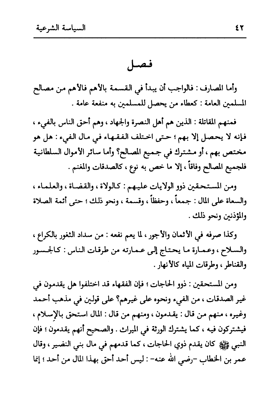 فصل وأما المصارف: فالواجب أن يبدأ فِي الْقِسْمَةِ بِالْأَهَمِّ فَالْأَهَمِّ مِنْ مَصَالِحِ الْمُسْلِمِينَ العامة: كَعَطَاءِ مَنْ يُحَصِّلُ لِلْمُسْلِمِينَ بِهِ مَنْفَعَةً عَامَّةً. فَمِنْهُمْ الْمُقَاتِلَةُ: الَّذِينَ هُمْ أَهْلُ النُّصْرَةِ وَالْجِهَادِ، وَهُمْ أَحَقُّ النَّاسِ بِالْفَيْءِ، فَإِنَّهُ لَا يَحْصُلُ إلَّا بِهِمْ؛ حَتَّى اخْتَلَفَ الْفُقَهَاءُ فِي مَالِ الْفَيْءِ: هَلْ هُوَ مُخْتَصٌّ بِهِمْ، أَوْ مُشْتَرَكٌ فِي جَمِيعِ الْمَصَالِحِ؟ وَأَمَّا سَائِرُ الْأَمْوَالِ السُّلْطَانِيَّةِ فَلِجَمِيعِ الْمَصَالِحِ وِفَاقًا، إلَّا مَا خَصَّ بِهِ نوع، كَالصَّدَقَاتِ وَالْمَغْنَمِ. وَمِنْ الْمُسْتَحِقِّينَ ذَوُو الْوِلَايَاتِ عَلَيْهِمْ: كَالْوُلَاةِ، وَالْقُضَاةِ، وَالْعُلَمَاءِ، وَالسُّعَاةِ عَلَى الْمَالِ: جَمْعًا، وَحِفْظًا، وَقِسْمَةً، وَنَحْوَ ذَلِكَ؛ حَتَّى أَئِمَّةِ الصَّلَاةِ والمؤذنين ونحو ذلك. وكذا صرفه فِي الْأَثْمَانِ وَالْأُجُورِ، لِمَا يَعُمُّ نَفْعُهُ: مِنْ سَدَادِ الثُّغُورِ بِالْكُرَاعِ، وَالسِّلَاحِ، وَعِمَارَةُ مَا يُحْتَاجُ إلَى عِمَارَتِهِ مِنْ طُرُقَاتِ النَّاسِ: كَالْجُسُورِ وَالْقَنَاطِرِ، وَطُرُقَاتِ الْمِيَاهِ كَالْأَنْهَارِ. وَمِنْ الْمُسْتَحِقِّينَ: ذَوُو الْحَاجَاتِ؛ فَإِنَّ الْفُقَهَاءَ قَدْ اخْتَلَفُوا هَلْ يُقَدَّمُونَ فِي غَيْرِ الصَّدَقَاتِ، مِنْ الْفَيْءِ وَنَحْوِهِ عَلَى غَيْرِهِمْ؛ عَلَى قَوْلَيْنِ فِي مَذْهَبِ أَحْمَدَ وَغَيْرِهِ، مِنْهُمْ مَنْ قَالَ: يُقَدَّمُونَ، وَمِنْهُمْ مَنْ قَالَ: الْمَالُ اُسْتُحِقَّ بالإِسلام، فَيَشْتَرِكُونَ فِيهِ، كَمَا يَشْتَرِكُ الْوَرَثَةُ فِي الْمِيرَاثِ. وَالصَّحِيحُ أَنَّهُمْ يُقَدَّمُونَ؛ فَإِنَّ النَّبِيَّ صَلَّى اللَّهُ عَلَيْهِ وَسَلَّمَ كَانَ يُقَدِّمُ ذَوِي الْحَاجَاتِ، كَمَا قَدَّمَهُمْ فِي مَالِ بَنِي النَّضِيرِ، وَقَالَ عُمَرُ بْنُ الْخَطَّابِ -رَضِيَ اللَّهُ عَنْهُ-: لَيْسَ أَحَدٌ أَحَقَّ بِهَذَا الْمَالِ مِنْ أَحَدٍ؛ إنما