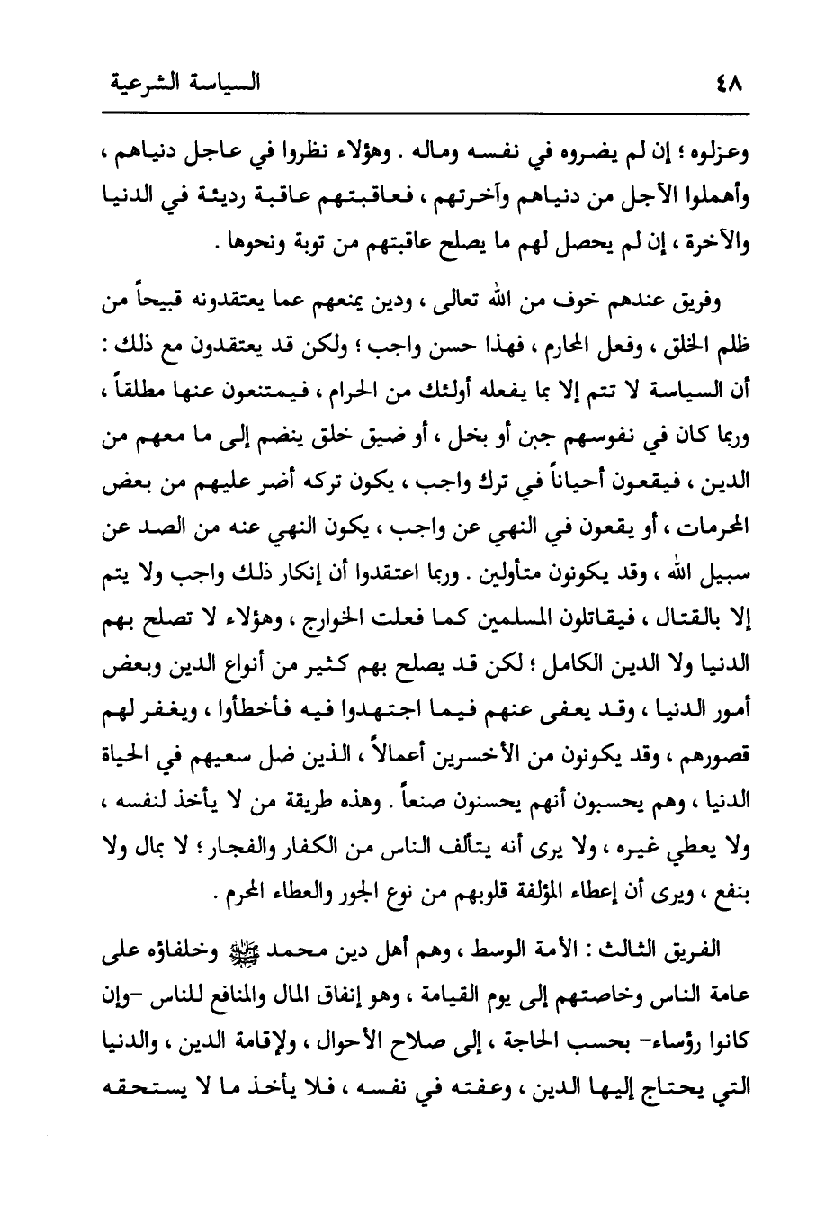 وَعَزَلُوهُ؛ إنْ لَمْ يَضُرُّوهُ فِي نَفْسِهِ وَمَالِهِ. وَهَؤُلَاءِ نَظَرُوا فِي، عَاجِلِ دُنْيَاهُمْ، وَأَهْمَلُوا الْآجِلَ مِنْ دُنْيَاهُمْ وَآخِرَتِهِمْ، فَعَاقِبَتُهُمْ عَاقِبَةٌ رَدِيئَةٌ فِي الدُّنْيَا وَالْآخِرَةِ، إنْ لَمْ يَحْصُلْ لَهُمْ مَا يُصْلِحُ عَاقِبَتَهُمْ مِنْ تَوْبَةٍ وَنَحْوِهَا. وَفَرِيقٌ عِنْدَهُمْ خَوْفٌ مِنْ اللَّهِ تَعَالَى، وَدِينٌ يَمْنَعُهُمْ عَمَّا يَعْتَقِدُونَهُ قَبِيحًا مِنْ ظُلْمِ الْخَلْقِ، وَفِعْلِ الْمَحَارِمِ، فَهَذَا حَسَنٌ وَاجِبٌ؛ وَلَكِنْ قَدْ يَعْتَقِدُونَ مَعَ ذَلِكَ: أَنَّ السِّيَاسَةَ لَا تَتِمُّ إلَّا بِمَا يفعله أولئك من الحرام، فيمتنعون عَنْهَا مُطْلَقًا، وَرُبَّمَا كَانَ فِي نُفُوسِهِمْ جُبْنٌ أَوْ بُخْلٌ، أَوْ ضِيقُ خُلُقٍ يَنْضَمُّ إلَى مَا مَعَهُمْ مِنْ الدِّينِ، فَيَقَعُونَ أَحْيَانًا فِي تَرْكِ وَاجِبٍ، يَكُونُ تَرْكُهُ أَضَرَّ عَلَيْهِمْ مِنْ بَعْضِ الْمُحَرَّمَاتِ، أَوْ يَقَعُونَ فِي النَّهْيِ عَنْ وَاجِبٍ، يَكُونُ النَّهْيُ عَنْهُ مِنْ الصَّدِّ عَنْ سَبِيلِ اللَّهِ، وَقَدْ يَكُونُونَ مُتَأَوِّلِينَ. وَرُبَّمَا اعْتَقَدُوا أَنَّ إنْكَارَ ذَلِكَ وَاجِبٌ وَلَا يَتِمُّ إلَّا بِالْقِتَالِ، فَيُقَاتِلُونَ الْمُسْلِمِينَ كَمَا فَعَلَتْ الْخَوَارِجُ، وَهَؤُلَاءِ لَا تَصْلُحُ بِهِمْ الدُّنْيَا وَلَا الدِّينُ الْكَامِلُ؛ لَكِنْ قَدْ يَصْلُحُ بِهِمْ كَثِيرٌ مِنْ أَنْوَاعِ الدِّينِ وَبَعْضُ أُمُورِ الدُّنْيَا، وَقَدْ يُعْفَى عَنْهُمْ فيما اجتهدوا فيه فأخطأوا، وَيُغْفَرُ لَهُمْ قُصُورُهُمْ، وَقَدْ يَكُونُونَ مِنْ الْأَخْسَرِينَ أَعْمَالًا، الَّذِينَ ضَلَّ سَعْيُهُمْ فِي الْحَيَاةِ الدُّنْيَا، وَهُمْ يَحْسَبُونَ أَنَّهُمْ يُحْسِنُونَ صُنْعًا. وَهَذِهِ طَرِيقَةُ مَنْ لَا يَأْخُذُ لِنَفْسِهِ، وَلَا يُعْطِي غَيْرَهُ، ولا يرى أنه يتألف الناس من الكفار وَالْفُجَّارِ؛ لَا بِمَالٍ وَلَا بِنَفْعٍ، وَيَرَى أَنَّ إعْطَاءَ الْمُؤَلَّفَةِ قُلُوبُهُمْ مِنْ نَوْعِ الْجَوْرِ وَالْعَطَاءِ الْمُحَرَّمِ. الْفَرِيقُ الثَّالِثُ: الْأَمَةُ الْوَسَطُ، وَهُمْ أَهْلُ دِينِ مُحَمَّدٍ صَلَّى اللَّهُ عَلَيْهِ وَسَلَّمَ وَخُلَفَاؤُهُ عَلَى عَامَّةِ النَّاسِ وَخَاصَّتِهِمْ إلَى يَوْمِ الْقِيَامَةِ، وَهُوَ إنْفَاقُ الْمَالِ وَالْمَنَافِعِ لِلنَّاسِ -وَإِنْ كَانُوا رُؤَسَاءَ- بِحَسَبِ الْحَاجَةِ، إلَى صَلَاحِ الْأَحْوَالِ، وَلِإِقَامَةِ الدِّينِ، وَالدُّنْيَا الَّتِي يَحْتَاجُ إلَيْهَا الدِّينُ، وَعِفَّتُهُ فِي نَفْسِهِ، فَلَا يَأْخُذُ مَا لَا يَسْتَحِقُّهُ