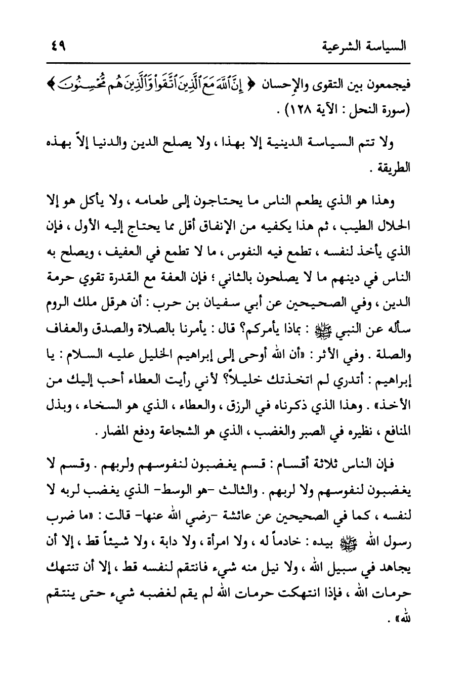 فَيَجْمَعُونَ بَيْنَ التَّقْوَى والإِحسان {إِنَّ اللَّهَ مَعَ الَّذِينَ اتَّقَوْا وَالَّذِينَ هُمْ مُحْسِنُونَ} [النحل: 128] (سورة النحل: الآية 128) . وَلَا تَتِمُّ السِّيَاسَةُ الدِّينِيَّةُ إلَّا بِهَذَا، وَلَا يَصْلُحُ الدِّينُ وَالدُّنْيَا إلَّا بِهَذِهِ الطَّرِيقَةِ. وَهَذَا هو الذي يطعم الناس ما يحتاجون إلى طَعَامِهِ، وَلَا يَأْكُلُ هُوَ إلَّا الْحَلَالَ الطَّيِّبَ، ثم هذا يكفيه من الإنفاق أقل مما يحتاج إليه الأول، فَإِنَّ الَّذِي يَأْخُذُ لِنَفْسِهِ، تَطْمَعُ فِيهِ النُّفُوسُ، ما لا تطمع في العفيف، ويصلح به الناس في ديتهم مَا لَا يَصْلُحُونَ بِالثَّانِي؛ فَإِنَّ الْعِفَّةَ مَعَ الْقُدْرَةِ تُقَوِّي حُرْمَةَ الدِّينِ، وَفِي الصَّحِيحَيْنِ عَنْ أَبِي سُفْيَانَ بْنِ حَرْبٍ: «أَنَّ هِرَقْلَ مِلْكَ الروم سأله عَنْ النَّبِيِّ صَلَّى اللَّهُ عَلَيْهِ وَسَلَّمَ: بِمَاذَا يَأْمُرُكُمْ؟ قَالَ: يَأْمُرُنَا بِالصَّلَاةِ وَالصِّدْقِ وَالْعَفَافِ وَالصِّلَةِ» . وَفِي الْأَثَرِ: " أَنَّ اللَّه أَوْحَى إلَى إبْرَاهِيمَ الخليل عليه السلام: يَا إبْرَاهِيمُ: أَتَدْرِي لِمَ اتَّخَذْتُكَ خَلِيلًا؟ لِأَنِّي رأيت العطاء أحب إليك من الأخذة. وهذا الَّذِي ذَكَرْنَاهُ فِي الرِّزْقِ، وَالْعَطَاءِ، الَّذِي هُوَ السَّخَاءُ، وَبَذْلُ الْمَنَافِعِ، نَظِيرُهُ فِي الصَّبْرِ وَالْغَضَبِ، الذي هو الشجاعة ودفع المضار. فإن النَّاسَ ثَلَاثَةُ أَقْسَامٍ: قِسْمٌ يَغْضَبُونَ لِنُفُوسِهِمْ وَلِرَبِّهِمْ. وَقِسْمٌ لَا يِغضبون لِنُفُوسِهِمْ وَلَا لِرَبِّهِمْ. وَالثَّالِثُ -هو الوسط- الذي يغضب لربه لَا لِنَفْسِهِ، كَمَا فِي الصَّحِيحَيْنِ عَنْ عَائِشَةَ -رَضِيَ اللَّهُ عَنْهَا- قَالَتْ: «مَا ضَرَبَ رَسُولُ اللَّهِ صَلَّى اللَّهُ عَلَيْهِ وَسَلَّمَ بِيَدِهِ: خَادِمًا لَهُ، وَلَا امْرَأَةً، وَلَا دَابَّةً، وَلَا شَيْئًا قَطُّ، إلَّا أَنْ يُجَاهِدَ فِي سَبِيلِ اللَّهِ، وَلَا نِيلَ مِنْهُ شَيْءٌ فَانْتَقَمَ لِنَفْسِهِ قَطُّ، إلَّا أَنْ تُنْتَهَكَ حُرُمَاتِ اللَّهِ، فَإِذَا اُنْتُهِكَتْ حُرُمَاتُ اللَّهِ لَمْ يَقُمْ لِغَضَبِهِ شَيْءٌ حَتَّى ينتقم لله» .