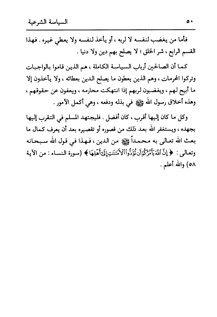 فأما من يغضبه لِنَفْسِهِ لَا لِرَبِّهِ، أَوْ يَأْخُذُ لِنَفْسِهِ وَلَا يُعْطِي غَيْرَهُ. فَهَذَا الْقِسْمُ الرَّابِعُ، شَرُّ الْخَلْقِ؛ لَا يَصْلُحُ بِهِمْ دِينٌ وَلَا دُنْيَا. كَمَا أَنَّ الصَّالِحِينَ أَرْبَابَ السِّيَاسَةِ الْكَامِلَةِ، هُمْ الَّذِينَ قَامُوا بِالْوَاجِبَاتِ وَتَرَكُوا الْمُحَرَّمَاتِ، وَهُمْ الَّذِينَ يُعْطُونَ مَا يُصْلِحُ الدِّينَ بِعَطَائِهِ، وَلَا يَأْخُذُونَ إلَّا مَا أُبِيحَ لَهُمْ، وَيَغْضَبُونَ لِرَبِّهِمْ إذَا اُنْتُهِكَتْ محارمه، ويعفون عن حقوقهم، وهذه أَخْلَاقُ رَسُولِ اللَّهِ صَلَّى اللَّهُ عَلَيْهِ وَسَلَّمَ في بذله ودفعه، وهي أكمل الأمور. وكل ما كَانَ إلَيْهَا أَقْرَبَ، كَانَ أَفْضَلَ. فَلْيَجْتَهِدْ الْمُسْلِمُ في التقرب إليها بجهده، وَيَسْتَغْفِرْ اللَّهَ بَعْدَ ذَلِكَ مِنْ قُصُورِهِ أَوْ تَقْصِيرِهِ بَعْدَ أَنْ يَعْرِفَ كَمَالَ مَا بَعَثَ اللَّهُ تَعَالَى بِهِ مُحَمَّدًا صَلَّى اللَّهُ عَلَيْهِ وَسَلَّمَ مِنْ الدِّينِ، فَهَذَا فِي قَوْلِ اللَّهِ سُبْحَانَهُ وَتَعَالَى: {إِنَّ اللَّهَ يَأْمُرُكُمْ أَنْ تُؤَدُّوا الْأَمَانَاتِ إِلَى أَهْلِهَا} [النساء: 58] (سورة النساء: من الآية 58) والله أعلم.