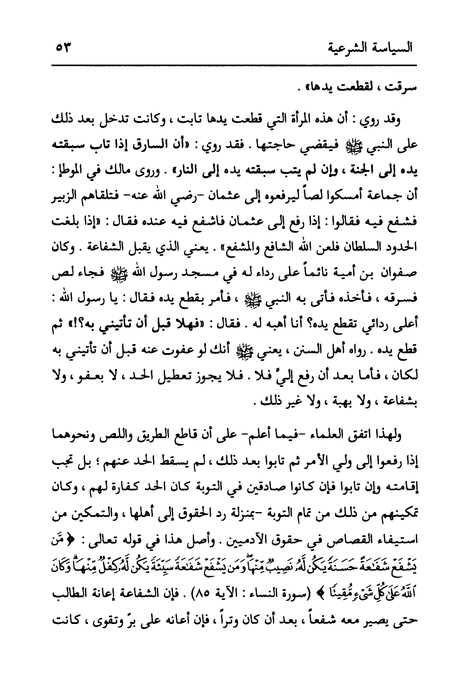 وَقَدْ رُوِيَ: «أَنَّ هَذِهِ الْمَرْأَةَ الَّتِي قُطِعَتْ يَدُهَا تَابَتْ، وَكَانَتْ تَدْخُلُ بَعْدَ ذَلِكَ عَلَى النَّبِيِّ صَلَّى اللَّهُ عَلَيْهِ وَسَلَّمَ فَيَقْضِي حَاجَتَهَا» . فَقَدْ رُوِيَ: «أَنَّ السَّارِقَ إذَا تَابَ سَبَقَتْهُ يَدُهُ إلَى الْجَنَّةِ، وَإِنْ لَمْ يَتُبْ سَبَقَتْهُ يَدُهُ إلَى النَّارِ» . وَرَوَى مَالِكٌ فِي الْمُوَطَّإِ: أَنَّ جَمَاعَةً أَمْسَكُوا لِصًّا لِيَرْفَعُوهُ إلَى عُثْمَانَ -رَضِيَ اللَّهُ عَنْهُ- فَتَلَقَّاهُمْ الزُّبَيْرُ فَشَفَعَ فِيهِ فَقَالُوا: إذَا رُفِعَ إلَى عُثْمَانَ فَاشْفَعْ فِيهِ عِنْدَهُ فَقَالَ: " إذَا بَلَغَتْ الْحُدُودُ السُّلْطَانَ فَلَعَنَ اللَّهُ الشَّافِعَ وَالْمُشَفِّعَ ". يَعْنِي الَّذِي يَقْبَلُ الشَّفَاعَةَ. «وَكَانَ صَفْوَانُ بْنُ أُمَيَّةَ نَائِمًا عَلَى رِدَاءٍ لَهُ فِي مَسْجِدِ رَسُولِ اللَّهِ صَلَّى اللَّهُ عَلَيْهِ وَسَلَّمَ فَجَاءَ لِصٌّ فَسَرَقَهُ، فَأَخَذَهُ فَأَتَى بِهِ النَّبِيَّ صَلَّى اللَّهُ عَلَيْهِ وَسَلَّمَ، فَأَمَرَ بِقَطْعِ يَدِهِ فَقَالَ: يَا رَسُولَ اللَّهِ: أَعْلَى رِدَائِي تُقْطَعُ يَدُهُ؟ أَنَا أَهَبُهُ لَهُ. فَقَالَ: " فَهَلَّا قَبْلَ أَنْ تَأْتِيَنِي بِهِ؟ ! " ثُمَّ قَطَعَ يَدَهُ» . رَوَاهُ أَهْلُ السُّنَنِ، يَعْنِي صَلَّى اللَّهُ عَلَيْهِ وَسَلَّمَ أَنَّكَ لَوْ عَفَوْتُ عَنْهُ قَبْلَ أَنْ تَأْتِيَنِي بِهِ لَكَانَ، فَأَمَّا بَعْدَ أَنْ رفع إلي فلا. فَلَا يَجُوزُ تَعْطِيلُ الْحَدِّ، لَا بِعَفْوٍ، وَلَا بِشَفَاعَةٍ، وَلَا بِهِبَةٍ، وَلَا غَيْرِ ذَلِكَ. وَلِهَذَا اتفق العلماء -فيما أعلم- على أَنَّ قَاطِعَ الطَّرِيقِ وَاللِّصَّ وَنَحْوَهُمَا إذَا رُفِعُوا إلَى وَلِيِّ الْأَمْرِ ثُمَّ تَابُوا بَعْدَ ذَلِكَ، لَمْ يَسْقُطْ الْحَدُّ عَنْهُمْ؛ بَلْ تَجِبُ إقَامَتُهُ وإن تابوا فإن كَانُوا صَادِقِينَ فِي التَّوْبَةِ كَانَ الْحَدُّ كَفَّارَةً لهم، وكان تمكينهم من ذلك من تَمَامُ التَّوْبَةِ -بِمَنْزِلَةِ رَدِّ الْحُقُوقِ إلَى أَهْلِهَا، والتمكين مِنْ اسْتِيفَاءِ الْقِصَاصِ فِي حُقُوقِ الْآدَمِيِّينَ. وَأَصْلُ هَذَا فِي قَوْله تَعَالَى: {مَنْ يَشْفَعْ شَفَاعَةً حَسَنَةً يَكُنْ لَهُ نَصِيبٌ مِنْهَا وَمَنْ يَشْفَعْ شَفَاعَةً سَيِّئَةً يَكُنْ لَهُ كِفْلٌ مِنْهَا وَكَانَ اللَّهُ عَلَى كُلِّ شَيْءٍ مُقِيتًا} [النساء: 85] (سورة النساء: الآية 85) . فإن الشفاعة إعانة الطالب حتى يصير مَعَهُ شَفْعًا، بَعْدَ أَنْ كَانَ وِتْرًا، فَإِنْ أَعَانَهُ عَلَى بِرٍّ وَتَقْوَى، كَانَتْ