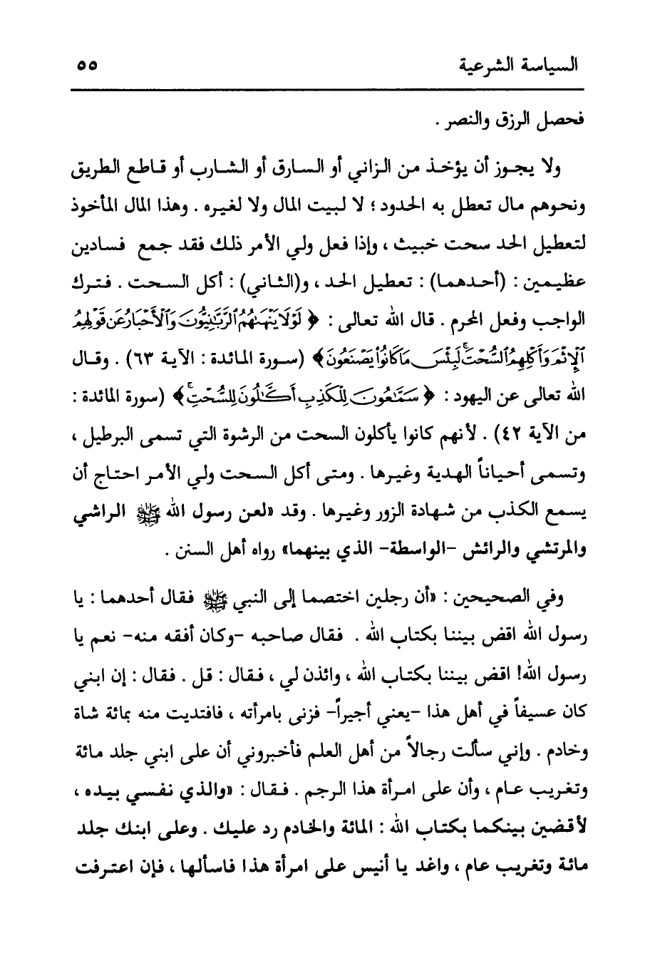 فَحَصَلَ الرِّزْقُ وَالنَّصْرُ. وَلَا يَجُوزُ أَنْ يُؤْخَذَ مِنْ الزَّانِي أَوْ السَّارِقِ أَوْ الشَّارِبِ أَوْ قاطع الطريق ونحوهم مَالٌ تُعَطَّلُ بِهِ الْحُدُودُ؛ لَا لِبَيْتِ الْمَالِ وَلَا لِغَيْرِهِ. وَهَذَا الْمَالُ الْمَأْخُوذُ لِتَعْطِيلِ الْحَدِّ سُحْتٌ خَبِيثٌ، وَإِذَا فَعَلَ وَلِيُّ الْأَمْرِ ذَلِكَ فَقَدْ جَمَعَ فَسَادَيْنِ عَظِيمَيْنِ: (أَحَدُهُمَا) : تَعْطِيلُ الْحَدِّ، و (الثاني) : أَكْلُ السُّحْتِ. فَتَرَكَ الْوَاجِبَ وَفَعَلَ الْمُحَرَّمَ. قَالَ الله تَعَالَى: {لَوْلَا يَنْهَاهُمُ الرَّبَّانِيُّونَ وَالْأَحْبَارُ عَنْ قَوْلِهِمُ الْإِثْمَ وَأَكْلِهِمُ السُّحْتَ لَبِئْسَ مَا كَانُوا يَصْنَعُونَ} [المائدة: 63] (سورة المائدة: الآية 63) . وقال الله تَعَالَى عَنْ الْيَهُودِ: {سَمَّاعُونَ لِلْكَذِبِ أَكَّالُونَ لِلسُّحْتِ} [المائدة: 42] (سورة المائدة: من الآية 42) . لِأَنَّهُمْ كَانُوا يَأْكُلُونَ السُّحْتَ مِنْ الرِّشْوَةِ الَّتِي تُسَمَّى الْبِرْطِيلَ، وَتُسَمَّى أَحْيَانًا الْهَدِيَّةَ وَغَيْرَهَا. وَمَتَى أَكَلَ السُّحْتَ وَلِيُّ الْأَمْرِ احْتَاجَ أَنْ يَسْمَعَ الْكَذِبَ مِنْ شَهَادَةِ الزُّورِ وَغَيْرِهَا. وَقَدْ «لَعَنَ رَسُولُ اللَّهِ صَلَّى اللَّهُ عَلَيْهِ وَسَلَّمَ الرَّاشِيَ والمرتشي والرائش -الواسطة- الذي بَيْنَهُمَا» رَوَاهُ أَهْلُ السُّنَنِ. وَفِي الصَّحِيحَيْنِ: «أَنَّ رَجُلَيْنِ اخْتَصَمَا إلَى النَّبِيِّ صَلَّى اللَّهُ عَلَيْهِ وَسَلَّمَ فَقَالَ أَحَدُهُمَا: يَا رَسُولَ اللَّهِ اقْضِ بَيْنَنَا بِكِتَابِ اللَّهِ. فَقَالَ صَاحِبُهُ -وَكَانَ أَفْقَهُ مِنْهُ- نَعَمْ يَا رَسُولَ اللَّهِ! اقْضِ بَيْنَنَا بكتاب الله، وائذن لي، فقال: قل. فَقَالَ: إنَّ ابْنِي كَانَ عَسِيفًا فِي أَهْلِ هَذَا -يَعْنِي أَجِيرًا- فَزَنَى بِامْرَأَتِهِ، فَافْتَدَيْتُ مِنْهُ بمائة شاة وخادم. وإني سألت رجالاً من أهل العلم فأخبروني أن على ابني جلد مائة وتخريب عَامٍ، وَأَنَّ عَلَى امْرَأَةِ هَذَا الرَّجْمَ. فَقَالَ: " والذي نفسي بيده، لأفضي! ن بَيْنَكُمَا بِكِتَابِ اللَّهِ: الْمِائَةُ وَالْخَادِمُ رَدٌّ عَلَيْكَ. وَعَلَى ابْنِكَ جَلْدُ مِائَةٍ وَتَغْرِيبُ عَامٍ، وَاغْدُ يَا أُنَيْسُ عَلَى امْرَأَةِ هَذَا فَاسْأَلْهَا، فَإِنْ اعترفت