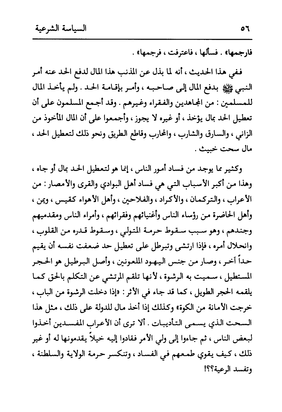 فَارْجُمْهَا ". فَسَأَلَهَا، فَاعْتَرَفَتْ، فَرَجَمَهَا» . فَفِي هَذَا الْحَدِيثِ، أَنَّهُ لَمَّا بَذَلَ عَنْ الْمُذْنِبِ هَذَا الْمَالَ لِدَفْعِ الْحَدِّ عَنْهُ أَمَرَ النَّبِيُّ صَلَّى اللَّهُ عَلَيْهِ وَسَلَّمَ بِدَفْعِ الْمَالِ إلَى صَاحِبِهِ، وَأَمَرَ بِإِقَامَةِ الْحَدِّ. وَلَمْ يَأْخُذْ الْمَالَ لِلْمُسْلِمِينَ: مِنْ الْمُجَاهِدِينَ وَالْفُقَرَاءِ وَغَيْرِهِمْ. وَقَدْ أَجْمَعَ الْمُسْلِمُونَ عَلَى أَنَّ تَعْطِيلَ الْحَدِّ بِمَالٍ يُؤْخَذُ، أَوْ غَيْرِهِ لَا يَجُوزُ، وَأَجْمَعُوا عَلَى أَنَّ الْمَالَ الْمَأْخُوذَ مِنْ الزَّانِي، وَالسَّارِقِ وَالشَّارِبِ، وَالْمُحَارِبِ وَقَاطِعِ الطَّرِيقِ ونحو ذلك لتعطيل الحد، ممال سحت خبيث. وكثير مِمَّا يُوجِدُ مِنْ فَسَادِ أُمُورِ النَّاسِ، إنَّمَا هو لتعطيل الْحَدِّ بِمَالٍ أَوْ جَاهٍ، وَهَذَا مِنْ أَكْبَرِ الْأَسْبَابِ الَّتِي هِيَ فَسَادُ أَهْلِ الْبَوَادِي وَالْقُرَى وَالْأَمْصَارِ: مِنْ الْأَعْرَابِ، وَالتُّرْكُمَانِ، وَالْأَكْرَادِ، وَالْفَلَّاحِينَ، وَأَهْلِ الْأَهْوَاءِ كَقَيْسٍ، وَيَمَنٍ، وَأَهْلِ الْحَاضِرَةِ مِنْ رُؤَسَاءِ الناس وأغنيائهم وَفُقَرَائِهِمْ، وَأُمَرَاءِ النَّاسِ وَمُقَدَّمَيْهِمْ وَجُنْدِهِمْ، وَهُوَ سَبَبُ سُقُوطِ حُرْمَةِ الْمُتَوَلِّي، وَسُقُوطِ قَدْرِهِ مِنْ الْقُلُوبِ، وَانْحِلَالِ أَمْرِهِ، فَإِذَا ارْتَشَى وَتَبَرْطَلَ عَلَى تَعْطِيلِ حَدٍّ ضَعُفَتْ نَفْسُهُ أَنْ يُقِيمَ حَدًّا آخَرَ، وَصَارَ مِنْ جِنْسِ الْيَهُودِ الْمَلْعُونِينَ، وَأَصْلُ الْبِرْطِيلِ هُوَ الْحَجَرُ الْمُسْتَطِيلُ، سُمِّيَتْ بِهِ الرِّشْوَةُ، لِأَنَّهَا تَلْقُمُ الْمُرْتَشِيَ عَنْ التَّكَلُّمِ بِالْحَقِّ كَمَا يُلْقِمُهُ الْحَجَرُ الطَّوِيلُ، كَمَا قَدْ جَاءَ فِي الْأَثَرِ: " إذَا دَخَلَتْ الرِّشْوَةُ مِنْ الْبَابِ، خَرَجَتْ الْأَمَانَةُ من الكوة، وكذلك إذا أخذ مال للدولة على ذلك، مثل هذا السُّحْتِ الَّذِي يُسَمَّى التَّأْدِيبَاتِ. أَلَا تَرَى أَنَّ الْأَعْرَابَ الْمُفْسِدِينَ أَخَذُوا لِبَعْضِ النَّاسِ، ثُمَّ جَاءُوا إلَى وَلِيِّ الْأَمْرِ فَقَادُوا إلَيْهِ خَيْلًا يُقَدِّمُونَهَا لَهُ أَوْ غَيْرَ ذَلِكَ، كَيْفَ يَقْوَى طَمَعُهُمْ فِي الْفَسَادِ، وَتَنْكَسِرُ حُرْمَةُ الْوِلَايَةِ وَالسَّلْطَنَةِ، وَتَفْسُدُ الرعية؟ ؟ !