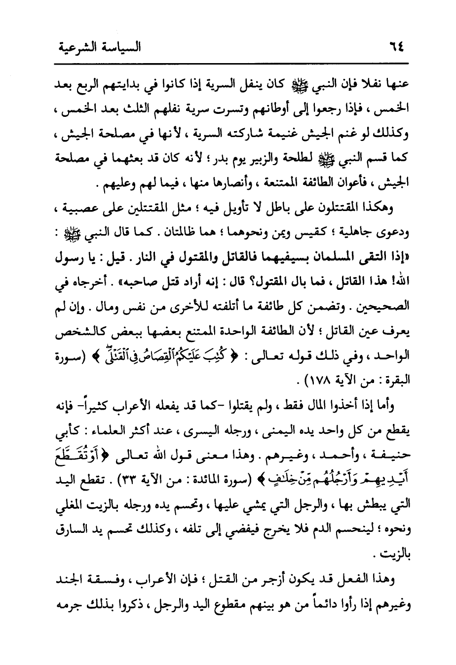 عنها نَفْلًا فَإِنَّ النَّبِيَّ صَلَّى اللَّهُ عَلَيْهِ وَسَلَّمَ كَانَ يُنَفِّلُ السَّرِيَّةَ إذَا كَانُوا فِي بِدَايَتِهِمْ الربع بعد الخمس، فإذا رجعوا إلى أوطانهم وتسرت سرية نفلهم الثلث بَعْدَ الْخُمُسِ، وَكَذَلِكَ لَوْ غَنِمَ الْجَيْشُ غَنِيمَةً شَارَكَتْهُ السَّرِيَّةُ، لِأَنَّهَا فِي مَصْلَحَةِ الْجَيْشِ، كَمَا قَسَمَ النَّبِيُّ صَلَّى اللَّهُ عَلَيْهِ وَسَلَّمَ لِطَلْحَةَ وَالزُّبَيْرِ يَوْمَ بَدْرٍ؛ لِأَنَّهُ كَانَ قَدْ بَعَثَهُمَا في مصلحة الجيش، فأعوان الطائفة الممتنعة، وَأَنْصَارُهَا مِنْهَا، فِيمَا لَهُمْ وَعَلَيْهِمْ. وَهَكَذَا الْمُقْتَتِلُونَ عَلَى بَاطِلٍ لَا تَأْوِيلَ فِيهِ؛ مِثْلُ الْمُقْتَتِلِينَ عَلَى عَصَبِيَّةٍ، وَدَعْوَى جَاهِلِيَّةٍ؛ كَقَيْسٍ وَيَمَنٍ وَنَحْوِهِمَا؛ هُمَا ظَالِمَتَانِ. كَمَا قَالَ النَّبِيُّ صَلَّى اللَّهُ عَلَيْهِ وَسَلَّمَ: «إذَا الْتَقَى الْمُسْلِمَانِ بِسَيْفَيْهِمَا فَالْقَاتِلُ وَالْمَقْتُولُ فِي النَّارِ. قِيلَ: يَا رَسُولَ اللَّهِ! هَذَا الْقَاتِلُ، فَمَا بَالُ الْمَقْتُولِ؟ قَالَ: إنَّهُ أراد قتل صاحبه» . أخرجاه في الصحيحين. ولضمن كل طائفة ما أتلفته للأخرى مِنْ نَفْسٍ وَمَالٍ. وَإِنْ لَمْ يُعْرَفْ عَيْنُ القاتل؛ لأن الطائفة الواحدة الممتنع بعضها ببعض كالشخص الواحد، وفي ذلك قوله تعالى: {كُتِبَ عَلَيْكُمُ الْقِصَاصُ فِي الْقَتْلَى} [البقرة: 178] (سورة البقرة: من الآية 178) . وَأَمَّا إذَا أَخَذُوا الْمَالَ فَقَطْ، وَلَمْ يَقْتُلُوا -كَمَا قَدْ يَفْعَلُهُ الْأَعْرَابُ كَثِيرًا- فَإِنَّهُ يُقْطَعُ مِنْ كُلِّ وَاحِدٍ يَدُهُ الْيُمْنَى، وَرِجْلُهُ الْيُسْرَى، عند أكثر العلماء: كأبي حنيفة، وأحمد، وَغَيْرِهِمْ. وَهَذَا مَعْنَى قَوْلِ اللَّهِ تَعَالَى {أَوْ تُقَطَّعَ أَيْدِيهِمْ وَأَرْجُلُهُمْ مِنْ خِلَافٍ} [المائدة: 33] (سورة المائدة: من الآية 33) . تُقْطَعُ الْيَدُ الَّتِي يَبْطِشُ بِهَا، وَالرِّجْلُ الَّتِي يمشي عليها، وتحسم يده ورجله بِالزَّيْتِ الْمَغْلِيِّ وَنَحْوِهِ؛ لِيَنْحَسِمَ الدَّمُ فَلَا يَخْرُجُ فَيُفْضِي إلَى تَلَفِهِ، وَكَذَلِكَ تُحْسَمُ يَدُ السَّارِقِ بالزيت. وهذا الفعل قد يَكُونُ أَزَجَرَ مِنْ الْقَتْلِ، فَإِنَّ الْأَعْرَابَ، وَفَسَقَةَ الْجُنْدِ وَغَيْرَهُمْ إذَا رَأَوْا دَائِمًا مَنْ هُوَ بَيْنَهُمْ مَقْطُوعَ الْيَدِ وَالرِّجْلِ، ذَكَرُوا بِذَلِكَ جُرْمَهُ