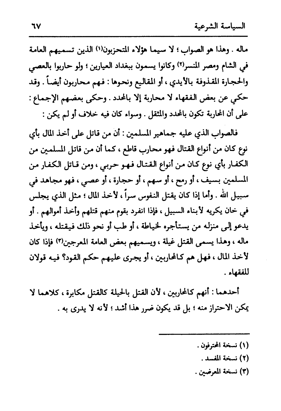 مَالِهِ. وَهَذَا هُوَ الصَّوَابُ؛ لَا سِيَّمَا هَؤُلَاءِ المتحزبون (¬1) الَّذِينَ تُسَمِّيهِمْ الْعَامَّةُ فِي الشَّامِ وَمِصْرَ الْمَنْسَرَ (¬2) وَكَانُوا يُسَمَّوْنَ بِبَغْدَادَ الْعَيَّارِينَ؛ وَلَوْ حَارَبُوا بِالْعِصِيِّ وَالْحِجَارَةِ الْمَقْذُوفَةِ بِالْأَيْدِي، أَوْ الْمَقَالِيعِ وَنَحْوِهَا: فَهُمْ مُحَارِبُونَ أَيْضًا. وَقَدْ حُكِيَ عَنْ بَعْضِ الْفُقَهَاءِ لَا مُحَارَبَةَ إلَّا بِالْمُحَدَّدِ. وَحَكَى بَعْضُهُمْ الْإِجْمَاعَ: عَلَى أَنَّ الْمُحَارَبَةَ تَكُونُ بِالْمُحَدَّدِ وَالْمُثْقَلِ. وَسَوَاءٌ كان فيه خلاف أو لَمْ يَكُنْ: فَالصَّوَابُ الَّذِي عَلَيْهِ جَمَاهِيرُ الْمُسْلِمِينَ: أَنَّ مَنْ قَاتَلَ عَلَى أَخْذِ الْمَالِ بِأَيِّ نوع كان من أنواع القتالة فَهُوَ مُحَارِبٌ قَاطِعٌ، كَمَا أَنَّ مَنْ قَاتَلَ الْمُسْلِمِينَ مِنْ الْكُفَّارِ بِأَيِّ نَوْعٍ كَانَ مِنْ أَنْوَاعِ الْقِتَالِ فَهُوَ حَرْبِيٌّ، وَمَنْ قَاتَلَ الْكُفَّارَ مِنْ الْمُسْلِمِينَ بِسَيْفٍ، أَوْ رُمْحٍ، أَوْ سَهْمٍ، أَوْ حِجَارَةٍ، أَوْ عِصِيٍّ، فَهُوَ مُجَاهِدٌ فِي سَبِيلِ اللَّهِ. وَأَمَّا إذَا كَانَ يَقْتُلُ النُّفُوسَ سِرًّا، لِأَخْذِ الْمَالِ؛ مِثْلَ الَّذِي يَجْلِسُ فِي خَانٍ يُكْرِيهِ لِأَبْنَاءِ السَّبِيلِ، فَإِذَا انْفَرَدَ بِقَوْمٍ مِنْهُمْ قَتَلَهُمْ وَأَخَذَ أَمْوَالَهُمْ. أَوْ يَدْعُو إلَى منزله من يستأجره لخياطة، أو طب أَوْ نَحْوَ ذَلِكَ فَيَقْتُلُهُ، وَيَأْخُذُ مَالَهُ، وَهَذَا يُسَمَّى الْقَتْلَ غِيلَةً، وَيُسَمِّيهِمْ بَعْضُ الْعَامَّةِ الْمُعَرِّجِينَ (¬3) فإذا كان لأخذ المال، فهل هم كالمحاربين، أو يجرى عليهم حُكْمُ الْقَوَدِ؟ فِيهِ قَوْلَانِ لِلْفُقَهَاءِ. أَحَدُهُمَا: أَنَّهُمْ كَالْمُحَارِبِينَ، لِأَنَّ الْقَتْلَ بِالْحِيلَةِ كَالْقَتْلِ مُكَابَرَةٍ، كِلَاهُمَا لَا يُمْكِنُ الِاحْتِرَازُ مِنْهُ؛ بَلْ قَدْ يَكُونُ ضَرَرُ هَذَا أَشَدَّ؛ لِأَنَّهُ لَا يَدْرِي بِهِ.