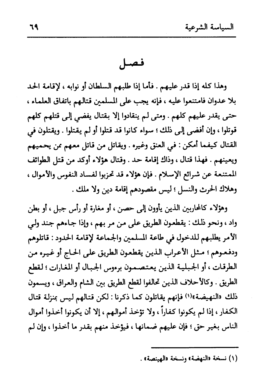 فصل وَهَذَا كُلُّهُ إذَا قَدَرَ عَلَيْهِمْ. فَأَمَّا إذَا طَلَبَهُمْ السُّلْطَانُ أَوْ نُوَّابُهُ، لِإِقَامَةِ الْحَدِّ بِلَا عُدْوَانٍ فَامْتَنَعُوا عَلَيْهِ، فَإِنَّهُ يَجِبُ عَلَى الْمُسْلِمِينَ قِتَالُهُمْ بِاتِّفَاقِ الْعُلَمَاءِ، حَتَّى يَقْدِرَ عَلَيْهِمْ كُلِّهِمْ. وَمَتَى لَمْ يَنْقَادُوا إلَّا بِقِتَالٍ يُفْضِي إلَى قَتْلِهِمْ كُلِّهِمْ قُوتِلُوا، وَإِنْ أَفْضَى إلَى ذَلِكَ؛ سَوَاءٌ كَانُوا قَدْ قَتَلُوا أَوْ لَمْ يَقْتُلُوا. وَيُقْتَلُونَ فِي الْقِتَالِ كَيْفَمَا أَمْكَنَ: فِي الْعُنُقِ وغيره. ويقاتل من قاتل معهم بن يَحْمِيهِمْ وَيُعِينُهُمْ. فَهَذَا قِتَالٌ، وَذَاكَ إقَامَةُ حَدٍّ. وَقِتَالُ هَؤُلَاءِ أَوْكَدُ مِنْ قَتْلِ الطَّوَائِفِ الْمُمْتَنِعَةِ عَنْ شَرَائِعِ الْإِسْلَامِ. فَإِنَّ هَؤُلَاءِ قَدْ تَحَزَّبُوا لِفَسَادِ النُّفُوسِ وَالْأَمْوَالِ، وَهَلَاكِ الْحَرْثِ وَالنَّسْلِ؛ لَيْسَ مقصودهم إقامة دِينٍ وَلَا مُلْكٍ. وَهَؤُلَاءِ كَالْمُحَارِبِينَ الَّذِينَ يَأْوُونَ إلَى حِصْنٍ، أَوْ مَغَارَةٍ أَوْ رَأْسِ جَبَلٍ، أَوْ بَطْنِ وَادٍ، وَنَحْوِ ذَلِكَ: يَقْطَعُونَ الطَّرِيقَ عَلَى مَنْ مَرَّ بِهِمْ، وَإِذَا جَاءَهُمْ جُنْدُ ولي الأمر يطلبهم لِلدُّخُولِ فِي طَاعَةِ الْمُسْلِمِينَ والجماعةَ لِإِقَامَةِ الْحُدُودِ: قَاتَلُوهُمْ وَدَفَعُوهُمْ؛ مِثْلَ الْأَعْرَابِ الَّذِينَ يَقْطَعُونَ الطَّرِيقَ عَلَى الْحَاجِّ أَوْ غَيْرِهِ مِنْ الطُّرُقَاتِ، أَوْ الجبلية الَّذِينَ يَعْتَصِمُونَ بِرُءُوسِ الْجِبَالِ أَوْ الْمَغَارَاتِ؛ لِقَطْعِ الطريق. وكالأحلاف الَّذِينَ تَحَالَفُوا لِقَطْعِ الطَّرِيقِ بَيْنَ الشَّامِ وَالْعِرَاقِ، وَيُسَمُّونَ ذَلِكَ " النَّهِيضَةَ " (¬1) فَإِنَّهُمْ يُقَاتَلُونَ كَمَا ذَكَرْنَا: لَكِنَّ قِتَالَهُمْ لَيْسَ بِمَنْزِلَةِ قِتَالِ الْكُفَّارِ، إذَا لَمْ يَكُونُوا كُفَّارًا، وَلَا تُؤْخَذُ أَمْوَالُهُمْ، إلَّا أَنْ يَكُونُوا أَخَذُوا أَمْوَالَ النَّاسِ بِغَيْرِ حَقٍّ؛ فَإِنَّ عَلَيْهِمْ ضَمَانَهَا، فَيُؤْخَذُ مِنْهُمْ بِقَدْرِ مَا أخذوا، وإن لم