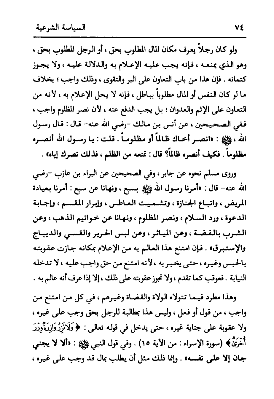 وَلَوْ كَانَ رَجُلًا يَعْرِفُ مَكَانَ الْمَالِ الْمَطْلُوبِ بِحَقٍّ، أَوْ الرَّجُلَ الْمَطْلُوبَ بِحَقٍّ، وَهُوَ الَّذِي يمنعه، فتنة يَجِبُ عَلَيْهِ الْإِعْلَامُ بِهِ وَالدَّلَالَةُ عَلَيْهِ، وَلَا يَجُوزُ كِتْمَانُهُ. فَإِنَّ هَذَا مِنْ بَابِ التَّعَاوُنِ عَلَى الْبِرِّ وَالتَّقْوَى، وَذَلِكَ وَاجِبٌ؛ بِخِلَافِ مَا لَوْ كَانَ النَّفْسُ أَوْ الْمَالُ مَطْلُوبًا بِبَاطِلٍ، فإنه لا يحل الْإِعْلَامُ بِهِ، لِأَنَّهُ مِنْ التَّعَاوُنِ عَلَى الْإِثْمِ وَالْعُدْوَانِ؛ بَلْ يَجِبُ الدَّفْعُ عَنْهُ، لِأَنَّ نَصْرَ الْمَظْلُومِ وَاجِبٌ، فَفِي الصَّحِيحَيْنِ، عَنْ أَنَسِ بْنِ مَالِكٍ -رَضِيَ اللَّهُ عَنْهُ- قَالَ: قَالَ رَسُولُ اللَّهِ، صَلَّى اللَّهُ عَلَيْهِ وَسَلَّمَ: «اُنْصُرْ أَخَاكَ ظَالِمًا أَوْ مَظْلُومًا. قُلْتُ: يَا رَسُولَ اللَّهِ أَنْصُرُهُ مَظْلُومًا. فَكَيْفَ أَنْصُرُهُ ظَالِمًا؟ قَالَ: تَمْنَعُهُ مِنْ الظُّلْمِ، فَذَلِكَ نَصْرُكَ إيَّاهُ» . وَرَوَى مُسْلِمٌ نَحْوَهُ عَنْ جَابِرٍ، وَفِي الصَّحِيحَيْنِ عَنْ الْبَرَاءِ بْنِ عَازِبٍ -رَضِيَ اللَّهُ عَنْهُ- قَالَ: «أَمَرَنَا رسول الله ولا بِسَبْعٍ، وَنَهَانَا عَنْ سَبْعٍ: أَمَرَنَا بِعِيَادَةِ الْمَرِيضِ، واتباع الجنازة، وتشميت العاطس، وإبرار المقسم، وإجابة الدعوة ورد السلام، وَنَصْرِ الْمَظْلُومِ، وَنَهَانَا عَنْ خَوَاتِيمِ الذَّهَبِ، وَعَنْ الشُّرْبِ بِالْفِضَّةِ، وَعَنْ الْمَيَاثِرِ، وَعَنْ لُبْسِ الْحَرِيرِ وَالْقَسِّيِّ وَالدِّيبَاجِ وَالْإِسْتَبْرَقِ» . فَإِنْ امْتَنَعَ هَذَا الْعَالِمُ بِهِ مِنْ الْإِعْلَامِ بِمَكَانِهِ جَازَتْ عُقُوبَتُهُ بِالْحَبْسِ وَغَيْرِهِ، حَتَّى يُخْبِرَ بِهِ، لِأَنَّهُ امْتَنَعَ مِنْ حَقٍّ وَاجِبٍ عَلَيْهِ، لَا تَدْخُلُهُ النِّيَابَةُ. فَعُوقِبَ كَمَا تَقَدَّمَ، وَلَا تَجُوزُ عُقُوبَتُهُ عَلَى ذَلِكَ، إلَّا إذَا عُرِفَ أَنَّهُ عَالِمٌ بِهِ. وَهَذَا مطرد فيما تَتَوَلَّاهُ الْوُلَاةُ وَالْقُضَاةُ وَغَيْرُهُمْ، فِي كُلِّ مَنْ امْتَنَعَ مِنْ وَاجِبٍ، مِنْ قَوْلٍ أَوْ فِعْلٍ، وليس هذا بمطالبة لِلرَّجُلِ بِحَقٍّ وَجَبَ عَلَى غَيْرِهِ، وَلَا عُقُوبَةً عَلَى جِنَايَةِ غَيْرِهِ، حَتَّى يَدْخُلَ فِي قَوْله تعالى: {وَلَا تَزِرُ وَازِرَةٌ وِزْرَ} [الإسراء: 15] (سورة الإسراء: من الآية 15) . وَفِي قَوْلِ النَّبِيِّ صَلَّى اللَّهُ عَلَيْهِ وَسَلَّمَ: «أَلَا لَا يَجْنِي جَانٍ إلَّا عَلَى نَفْسِهِ» . وَإِنَّمَا ذَلِكَ مِثْلُ أَنْ يُطْلَبَ بِمَالٍ قَدْ وَجَبَ عَلَى غَيْرِهِ،