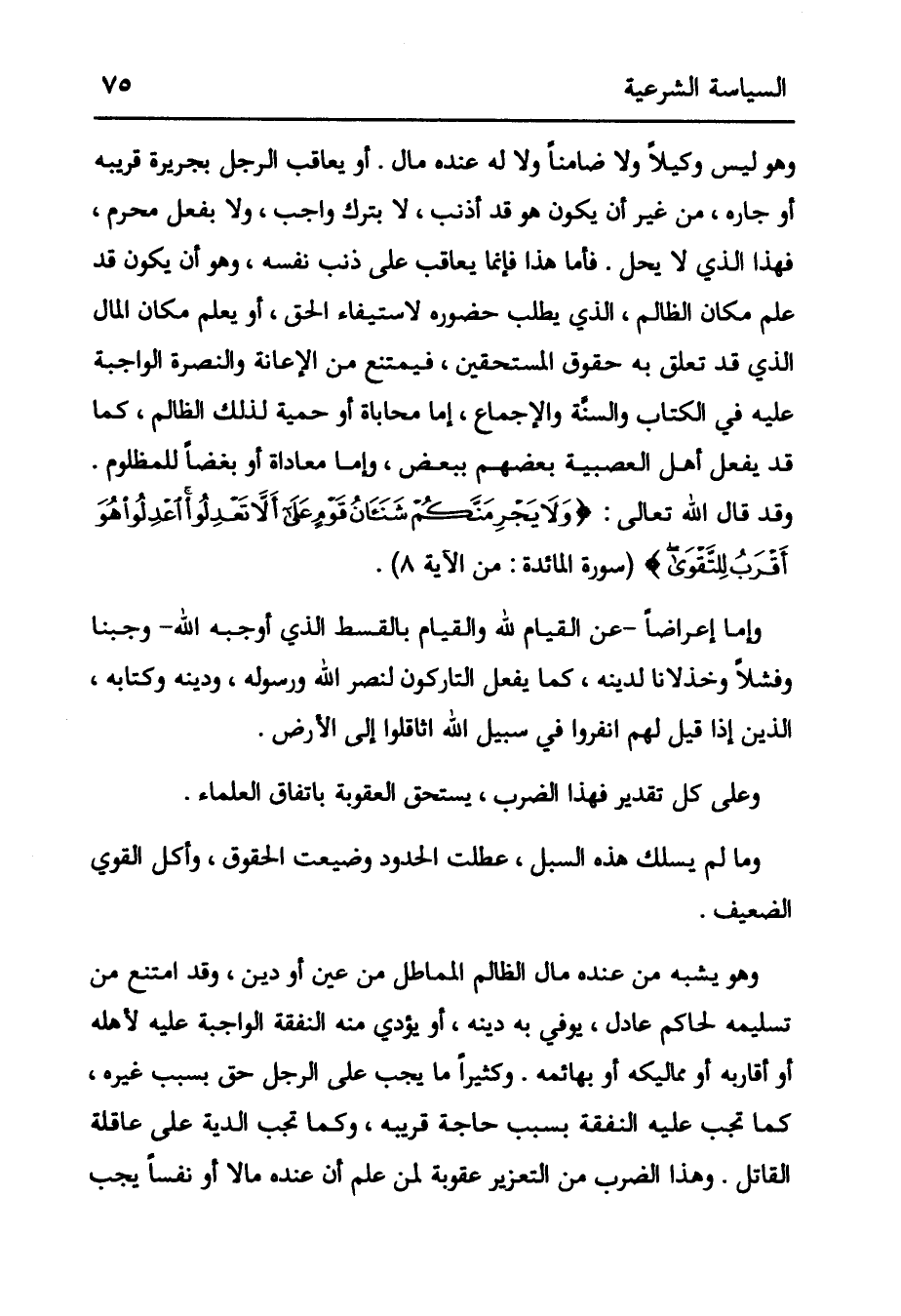 وهو ليس وكيلاً ولا ضامنا وَلَا لَهُ عِنْدَهُ مَالٌ. أَوْ يُعَاقَبَ الرَّجُلُ جريرة قَرِيبِهِ أَوْ جَارِهِ، مِنْ غَيْرِ أَنْ يَكُونَ هو قَدْ أَذْنَبَ، لَا بِتَرْكِ وَاجِبٍ، وَلَا بِفِعْلٍ مُحَرَّمٍ، فَهَذَا الَّذِي لَا يَحِلُّ. فَأَمَّا هَذَا فَإِنَّمَا يُعَاقَبُ عَلَى ذَنْبِ نَفْسِهِ، وَهُوَ أَنْ يَكُونَ قَدْ عَلِمَ مَكَانَ الظَّالِمِ، الَّذِي يُطْلَبُ حُضُورُهُ لِاسْتِيفَاءِ الْحَقِّ، أَوْ يَعْلَمُ مَكَانَ الْمَالِ الَّذِي قَدْ تَعَلَّقَ بِهِ حُقُوقُ الْمُسْتَحِقِّينَ، فَيَمْتَنِعُ مِنْ الْإِعَانَةِ وَالنُّصْرَةِ الْوَاجِبَةِ عَلَيْهِ فِي الْكِتَابِ والسنة والإجماع، إما محاباة أو حمية لذلك الظالم، كما قد يفعل أهل العصبية بَعْضُهُمْ بِبَعْضٍ، وَإِمَّا مُعَادَاةً أَوْ بُغْضًا لِلْمَظْلُومِ. وَقَدْ قَالَ اللَّهُ تَعَالَى: {وَلَا يَجْرِمَنَّكُمْ شَنَآنُ قَوْمٍ عَلَى أَلَّا تَعْدِلُوا اعْدِلُوا هُوَ أَقْرَبُ لِلتَّقْوَى} [المائدة: 8] (سورة المائدة: من الآية 8) . وإما إعراضا -عن القيام لله والقيام بِالْقِسْطِ الَّذِي أَوْجَبَهُ اللهَ وَجُبْنًا وَفَشَلًا وَخِذْلَانًا لِدِينِهِ، كَمَا يَفْعَلُ التَّارِكُونَ لِنَصْرِ اللَّهِ وَرَسُولِهِ، وَدِينِهِ وَكِتَابِهِ، الَّذِينَ إذَا قِيلَ لَهُمْ انْفِرُوا فِي سَبِيلِ اللَّهِ اثَّاقَلُوا إلَى الْأَرْضِ. وَعَلَى كُلِّ تَقْدِيرٍ فَهَذَا الضَّرْبُ، يَسْتَحِقُّ الْعُقُوبَةَ بِاتِّفَاقِ العلماء. وما لم يسلك هذه السبل، عطلت الحدود وضيعت الحقوق، وأكل القوى الضعيف. وَهُوَ يُشْبِهُ مَنْ عِنْدَهُ مَالُ الظَّالِمِ الْمُمَاطِلِ مِنْ عَيْنٍ أَوْ دَيْنٍ، وَقَدْ امْتَنَعَ مِنْ تَسْلِيمِهِ لِحَاكِمٍ عَادِلٍ، يُوفِي بِهِ دَيْنَهُ، أَوْ يُؤَدِّي مِنْهُ النَّفَقَةَ الْوَاجِبَةَ عَلَيْهِ لِأَهْلِهِ أَوْ أَقَارِبِهِ أَوْ مَمَالِيكِهِ أَوْ بَهَائِمِهِ. وَكَثِيرًا مَا يجب على الرجل حق بسبب غيره، كلما تَجِبُ عَلَيْهِ النَّفَقَةُ بِسَبَبِ حَاجَةِ قَرِيبِهِ، وَكَمَا تجب الدية عَلَى عَاقِلَةِ الْقَاتِلِ. وَهَذَا الضَّرْبُ مِنْ التَّعْزِيرِ عُقُوبَةٌ لِمَنْ عُلِمَ أَنَّ عِنْدَهُ مَالًا أَوْ نفساً يجب