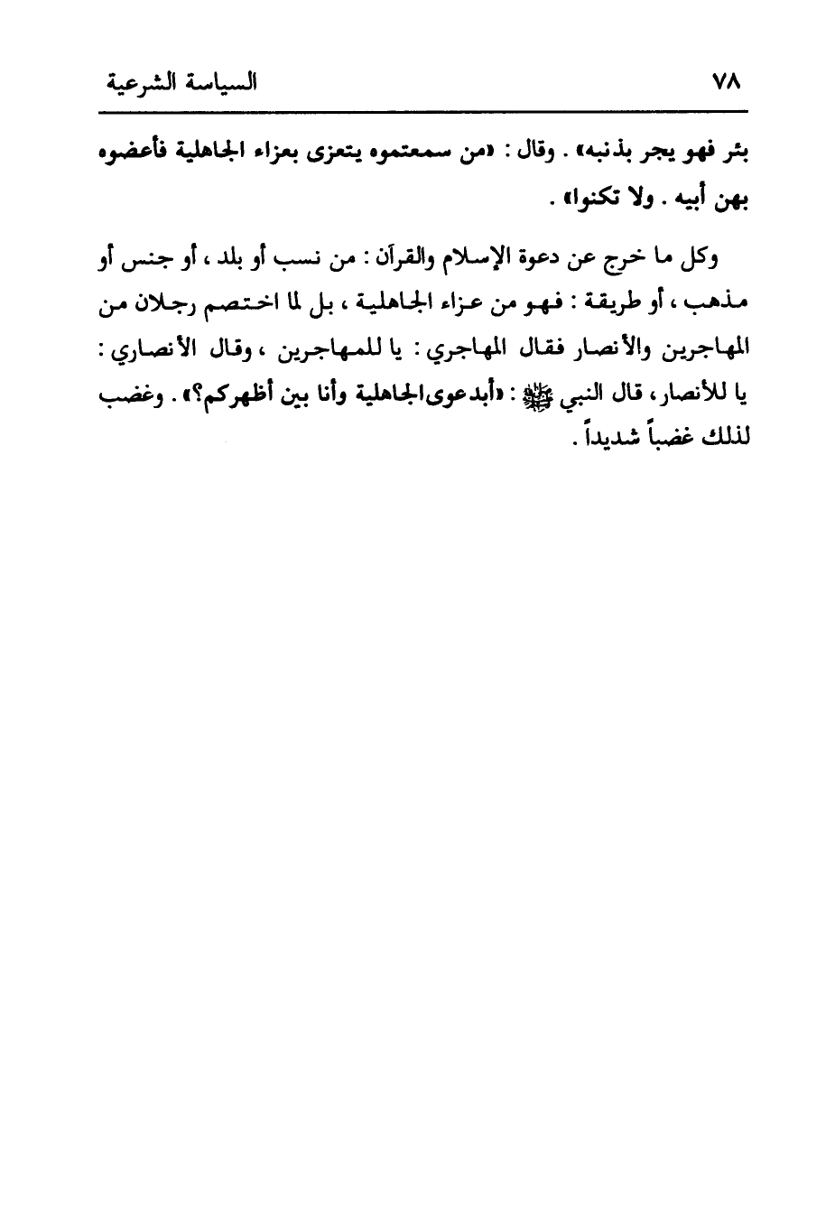 بِئْرٍ فَهُوَ يَجُرُّ بِذَنَبِهِ» . وَقَالَ: «مَنْ سَمِعْتُمُوهُ يَتَعَزَّى بِعَزَاءِ الْجَاهِلِيَّةِ فَأَعِضُّوهُ بِهَنِّ أَبِيهِ. وَلَا تُكَنُّوا» . وَكُلُّ مَا خَرَجَ عَنْ دَعْوَةِ الْإِسْلَامِ وَالْقُرْآنِ: مِنْ نَسَبٍ أَوْ بَلَدٍ، أَوْ جِنْسٍ أَوْ مَذْهَبٍ، أَوْ طَرِيقَةٍ: فَهُوَ مِنْ عَزَاءِ الْجَاهِلِيَّةِ، بَلْ «لَمَّا اخْتَصَمَ رَجُلَانِ مِنْ الْمُهَاجِرِينَ والأنصار فقال الْمُهَاجِرِيُّ: يَا لَلْمُهَاجِرِينَ، وَقَالَ الْأَنْصَارِيُّ: يَا لَلْأَنْصَارِ، قَالَ النَّبِيُّ صَلَّى اللَّهُ عَلَيْهِ وَسَلَّمَ: " أَبِدَعْوَى الْجَاهِلِيَّةِ وَأَنَا بَيْنَ أَظْهُرِكُمْ» . وَغَضِبَ لِذَلِكَ غَضَبًا شديدا.