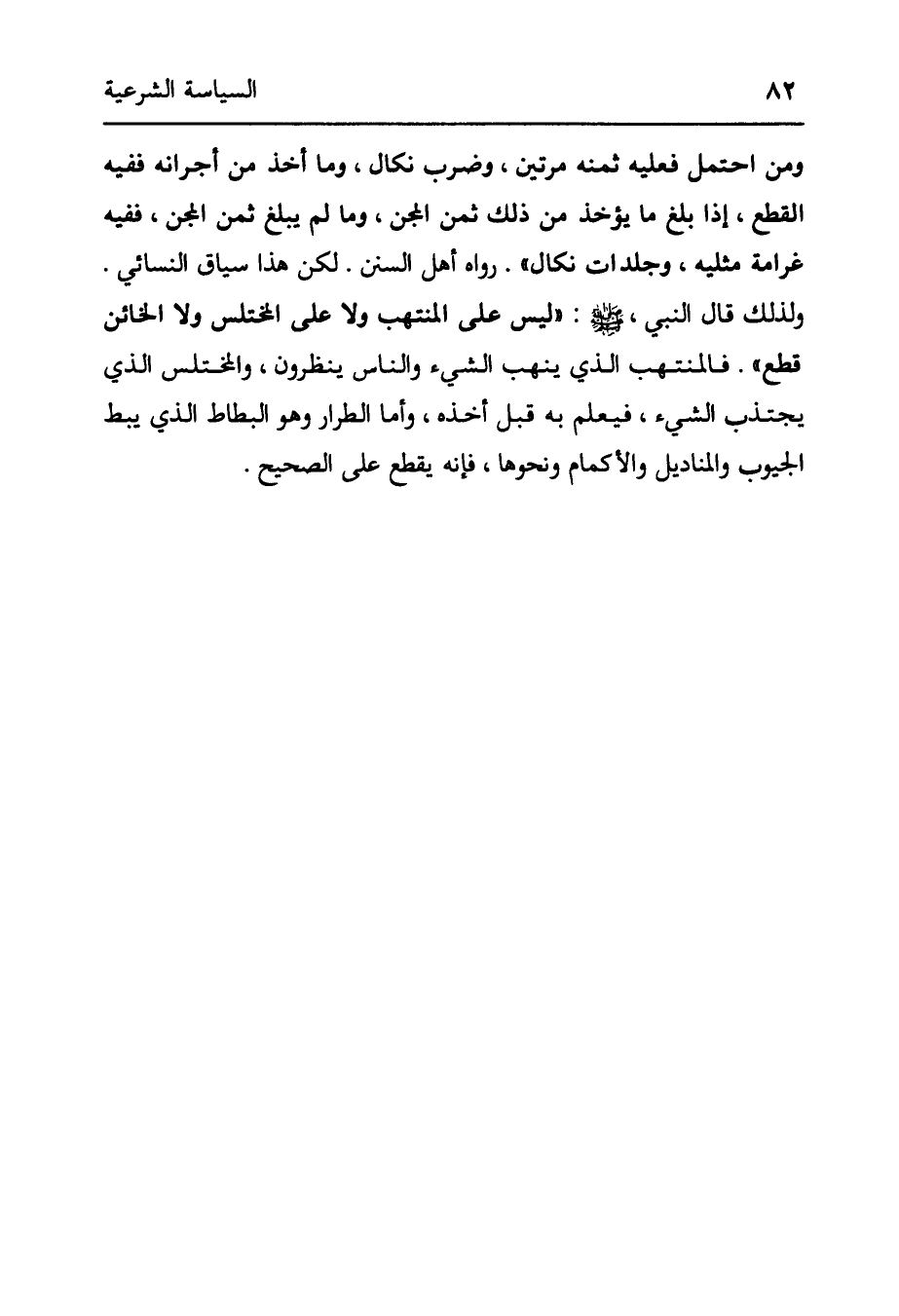 وَمَنْ احْتَمَلَ فَعَلَيْهِ ثَمَنُهُ مَرَّتَيْنِ، وَضَرْبَ نَكَالٍ، وَمَا أَخَذَ مِنْ أَجْرَانِهِ فَفِيهِ الْقَطْعُ، إذَا بَلَغَ مَا يُؤْخَذُ مِنْ ذَلِكَ ثَمَنَ الْمِجَنِّ، وما لم يبلغ ثمن المجن، ففيه كرامة مِثْلِيَّةٌ، وَجَلَدَاتُ نَكَالٍ» . رَوَاهُ أَهْلُ السُّنَنِ. لَكِنَّ هذا سياق النسائي. ولذلك قال النبي صلى الله عليه وسلم: «لَيْسَ عَلَى الْمُنْتَهِبِ وَلَا عَلَى الْمُخْتَلِسِ وَلَا الخائن قطع» . فالمنتهب الذي يَنْهَبُ الشَّيْءَ وَالنَّاسُ يَنْظُرُونَ، وَالْمُخْتَلِسُ الَّذِي يَجْتَذِبُ الشَّيْءَ، فَيُعْلَمُ بِهِ قَبْلَ أَخْذِهِ، وَأَمَّا الطَّرَّارُ وَهُوَ الْبَطَّاطُ الَّذِي يَبُطُّ الْجُيُوبَ وَالْمَنَادِيلَ وَالْأَكْمَامَ ونحوها، فإنه يقطع على الصحيح.