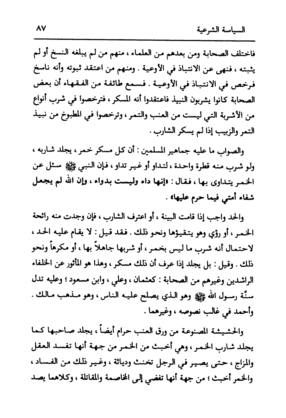 فَاخْتَلَفَ الصَّحَابَةُ وَمَنْ بَعْدَهُمْ مِنْ الْعُلَمَاءِ، مِنْهُمْ مَنْ لَمْ يَبْلُغْهُ النَّسْخُ أَوْ لَمْ يُثْبِتْهُ، فَنَهَى عَنْ الِانْتِبَاذِ فِي الْأَوْعِيَةِ. وَمِنْهُمْ مِنْ اعْتَقَدَ ثُبُوتَهُ وَأَنَّهُ نَاسِخٌ فَرَخَّصَ فِي الِانْتِبَاذِ فِي الْأَوْعِيَةِ. فَسَمِعَ طَائِفَةٌ مِنْ الْفُقَهَاءِ أَنَّ بَعْضَ الصَّحَابَةِ كَانُوا يَشْرَبُونَ النَّبِيذَ فَاعْتَقَدُوا أَنَّهُ الْمُسْكِرُ، فَتَرَخَّصُوا فِي شُرْبِ أَنْوَاعٍ مِنْ الْأَشْرِبَةِ الَّتِي لَيْسَتْ مِنْ الْعِنَبِ وَالتَّمْرِ، وَتَرَخَّصُوا فِي الْمَطْبُوخِ مِنْ نَبِيذِ التَّمْرِ وَالزَّبِيبِ إذَا لَمْ يُسْكِرْ الشَّارِبَ. وَالصَّوَابُ مَا عَلَيْهِ جَمَاهِيرُ الْمُسْلِمِينَ: أَنَّ كُلَّ مُسْكِرٍ خَمْرٌ، يُجْلَدُ شَارِبُهُ، وَلَوْ شَرِبَ مِنْهُ قَطْرَةً وَاحِدَةً، لِتَدَاوٍ أَوْ غَيْرِ تَدَاوٍ، «فَإِنَّ النَّبِيَّ صَلَّى اللَّهُ عَلَيْهِ وَسَلَّمَ سُئِلَ عَنْ الْخَمْرِ يُتَدَاوَى بِهَا، فَقَالَ: " إنَّهَا دَاءٌ وَلَيْسَتْ بِدَوَاءٍ، وَإِنَّ اللَّهَ لَمْ يَجْعَلْ شِفَاءَ أُمَّتِي فِيمَا حَرَّمَ عَلَيْهَا» . وَالْحَدُّ وَاجِبٌ إذَا قَامَتْ الْبَيِّنَةُ، أَوْ اعْتَرَفَ الشَّارِبُ، فَإِنْ وجدت منه رائحة الخمر، أو رؤي وهو يتقيؤها ونحو ذلك. فقد ميل: لَا يُقَامُ عَلَيْهِ الْحَدُّ، لِاحْتِمَالِ أَنَّهُ شَرِبَ مَا لَيْسَ بِخَمْرٍ، أَوْ شَرِبَهَا جَاهِلًا بِهَا، أو مكرهاً ونحو ذلك. وقيل: بل يُجْلَدُ إذَا عَرَفَ أَنَّ ذَلِكَ مُسْكِرٌ، وَهَذَا هُوَ الْمَأْثُورُ عَنْ الْخُلَفَاءِ الرَّاشِدِينَ وَغَيْرِهِمْ مِنْ الصَّحَابَةِ: كَعُثْمَانَ، وَعَلِيٍّ، وَابْنِ مَسْعُودٍ؛ وَعَلَيْهِ تَدُلُّ سنة رسول الله صلى الله عليه وسلم وهو الذي يصلح عَلَيْهِ النَّاسُ، وَهُوَ مَذْهَبُ مَالِكٍ. وَأَحْمَدَ فِي غَالِبِ نُصُوصِهِ، وَغَيْرِهِمَا. وَالْحَشِيشَةُ الْمَصْنُوعَةُ مِنْ وَرَقِ الْعِنَبِ حَرَامٌ أَيْضًا، يُجْلَدُ صَاحِبُهَا كَمَا يُجْلَدُ ضارب الْخَمْرِ، وَهِيَ أَخْبَثُ مِنْ الْخَمْرِ مِنْ جِهَةِ أَنَّهَا تُفْسِدُ الْعَقْلَ وَالْمِزَاجَ، حَتَّى يَصِيرَ فِي الرَّجُلِ تَخَنُّثٌ وَدِيَاثَةٌ، وَغَيْرُ ذَلِكَ مِنْ الْفَسَادِ، وَالْخَمْرُ أَخْبَثُ مِنْ جِهَةِ أَنَّهَا تُفْضِي إلَى الْمُخَاصَمَةِ وَالْمُقَاتَلَةِ، وَكِلَاهُمَا يَصُدُّ