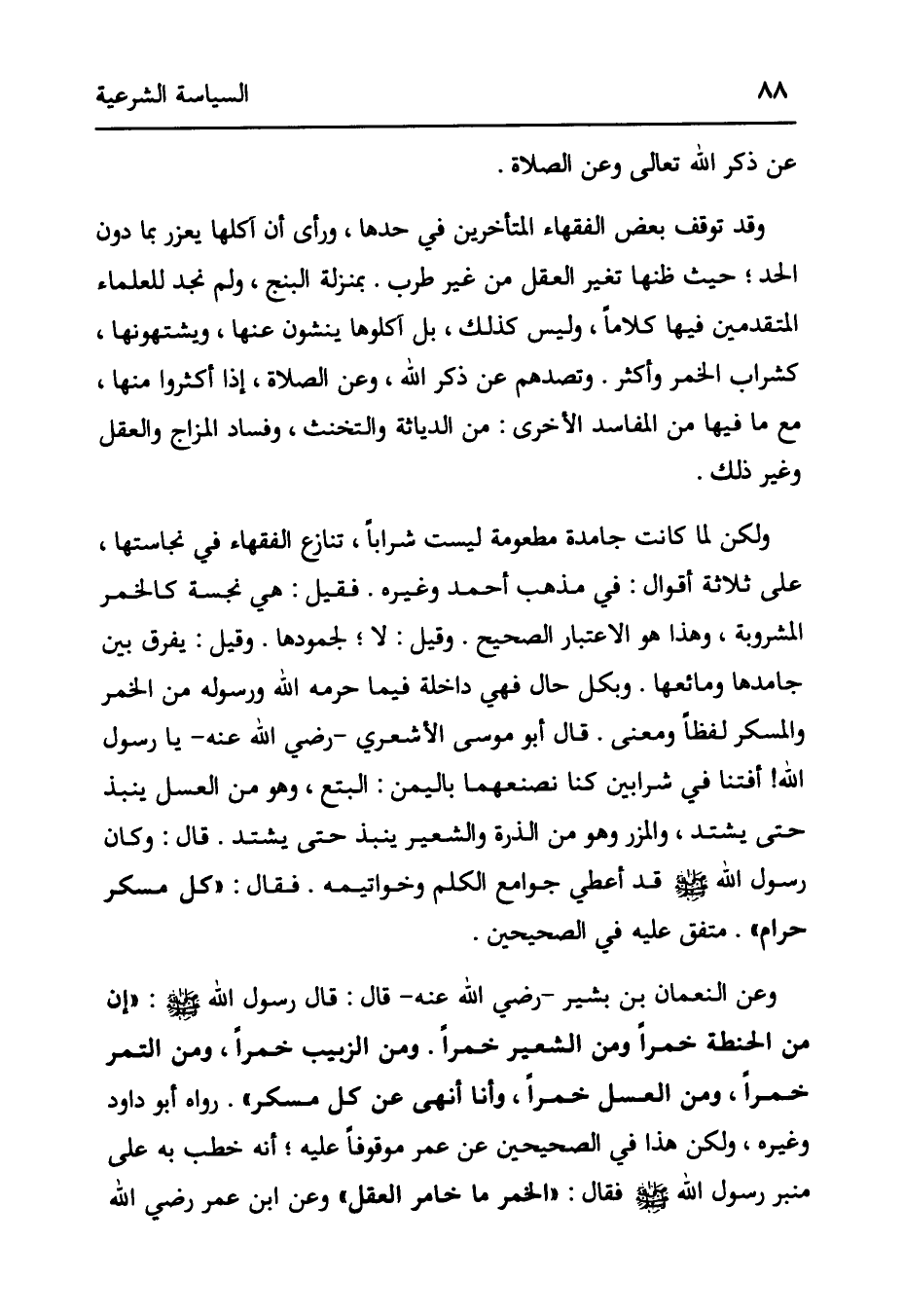 عَنْ ذِكْرِ اللَّهِ تَعَالَى وَعَنْ الصَّلَاةِ. وَقَدْ تَوَقَّفَ بَعْضُ الْفُقَهَاءِ الْمُتَأَخِّرِينَ فِي حَدِّهَا، وَرَأَى أَنَّ آكِلَهَا يُعَزَّرُ بِمَا دُونَ الْحَدِّ؛ حَيْثُ ظَنَّهَا تُغَيِّرُ الْعَقْلَ مِنْ غَيْرِ طَرَبٍ. بِمَنْزِلَةِ البنج، ولم نجد لِلْعُلَمَاءِ الْمُتَقَدِّمِينَ فِيهَا كَلَامًا، وَلَيْسَ كَذَلِكَ، بَلْ آكِلُوهَا يَنْشَوْنَ عَنْهَا، وَيَشْتَهُونَهَا، كَشَرَابِ الْخَمْرِ وَأَكْثَرَ. وَتَصُدُّهُمْ عَنْ ذِكْرِ اللَّهِ، وَعَنْ الصَّلَاةِ، إذَا أَكْثَرُوا مِنْهَا، مَعَ مَا فِيهَا مِنْ الْمَفَاسِدِ الْأُخْرَى: مِنْ الدِّيَاثَةِ وَالتَّخَنُّثِ، وَفَسَادِ الْمِزَاجِ وَالْعَقْلِ وَغَيْرِ ذَلِكَ. وَلَكِنْ لَمَّا كَانَتْ جَامِدَةً مَطْعُومَةً لَيْسَتْ شَرَابًا، تَنَازَعَ الْفُقَهَاءُ فِي نَجَاسَتِهَا، عَلَى ثَلَاثَةِ أَقْوَالٍ: فِي مَذْهَبِ أَحْمَدَ وَغَيْرِهِ. فَقِيلَ: هِيَ نَجِسَةٌ كَالْخَمْرِ الْمَشْرُوبَةِ، وَهَذَا هُوَ الِاعْتِبَارُ الصَّحِيحُ. وَقِيلَ: لَا؛ لِجُمُودِهَا. وَقِيلَ: يُفَرَّقُ بَيْنَ جَامِدِهَا وَمَائِعِهَا. وَبِكُلِّ حَالٍ فَهِيَ دَاخِلَةٌ فِيمَا حَرَّمَهُ اللَّهُ وَرَسُولُهُ مِنْ الْخَمْرِ وَالْمُسْكِرِ لَفْظًا ومعنى. «قَالَ أَبُو مُوسَى الْأَشْعَرِيُّ -رَضِيَ اللَّهُ عَنْهُ- يا رسول الله! أفتنا في شرابين كُنَّا نَصْنَعُهُمَا بِالْيَمَنِ: الْبِتْعُ، وَهُوَ مِنْ الْعَسَلِ يُنْبَذُ حَتَّى يَشْتَدَّ، وَالْمِزْرُ وَهُوَ مِنْ الذُّرَةِ وَالشَّعِيرِ يُنْبَذُ حَتَّى يَشْتَدَّ. قَالَ: وَكَانَ رَسُولُ اللَّهِ صَلَّى اللَّهُ عَلَيْهِ وَسَلَّمَ قَدْ أُعْطِي جوامع الكلم وخواتيمه. فَقَالَ: " كُلُّ مُسْكِرٍ حَرَامٌ» . مُتَّفَقٌ عَلَيْهِ فِي الصَّحِيحَيْنِ. وَعَنْ النُّعْمَانِ بْنِ بَشِيرٍ -رَضِيَ اللَّهُ عَنْهُ- قَالَ: قَالَ رَسُولُ اللَّهِ صَلَّى اللَّهُ عَلَيْهِ وَسَلَّمَ: «إنَّ مِنْ الْحِنْطَةِ خَمْرًا وَمِنْ الشَّعِيرِ خَمْرًا. وَمِنْ الزَّبِيبِ خَمْرًا، وَمِنْ التَّمْرِ خَمْرًا، وَمِنْ الْعَسَلِ خَمْرًا، وَأَنَا أَنْهَى عَنْ كُلِّ مُسْكِرٍ» . رَوَاهُ أَبُو دَاوُد وَغَيْرُهُ، وَلَكِنَّ هَذَا فِي الصَّحِيحَيْنِ عَنْ عُمَرَ مَوْقُوفًا عَلَيْهِ؛ أَنَّهُ خَطَبَ بِهِ عَلَى مِنْبَرِ رَسُولِ اللَّهِ صَلَّى اللَّهُ عَلَيْهِ وَسَلَّمَ فَقَالَ: «الْخَمْرُ مَا خَامَرَ الْعَقْلَ» وَعَنْ ابْنِ عُمَرَ رَضِيَ اللَّهُ