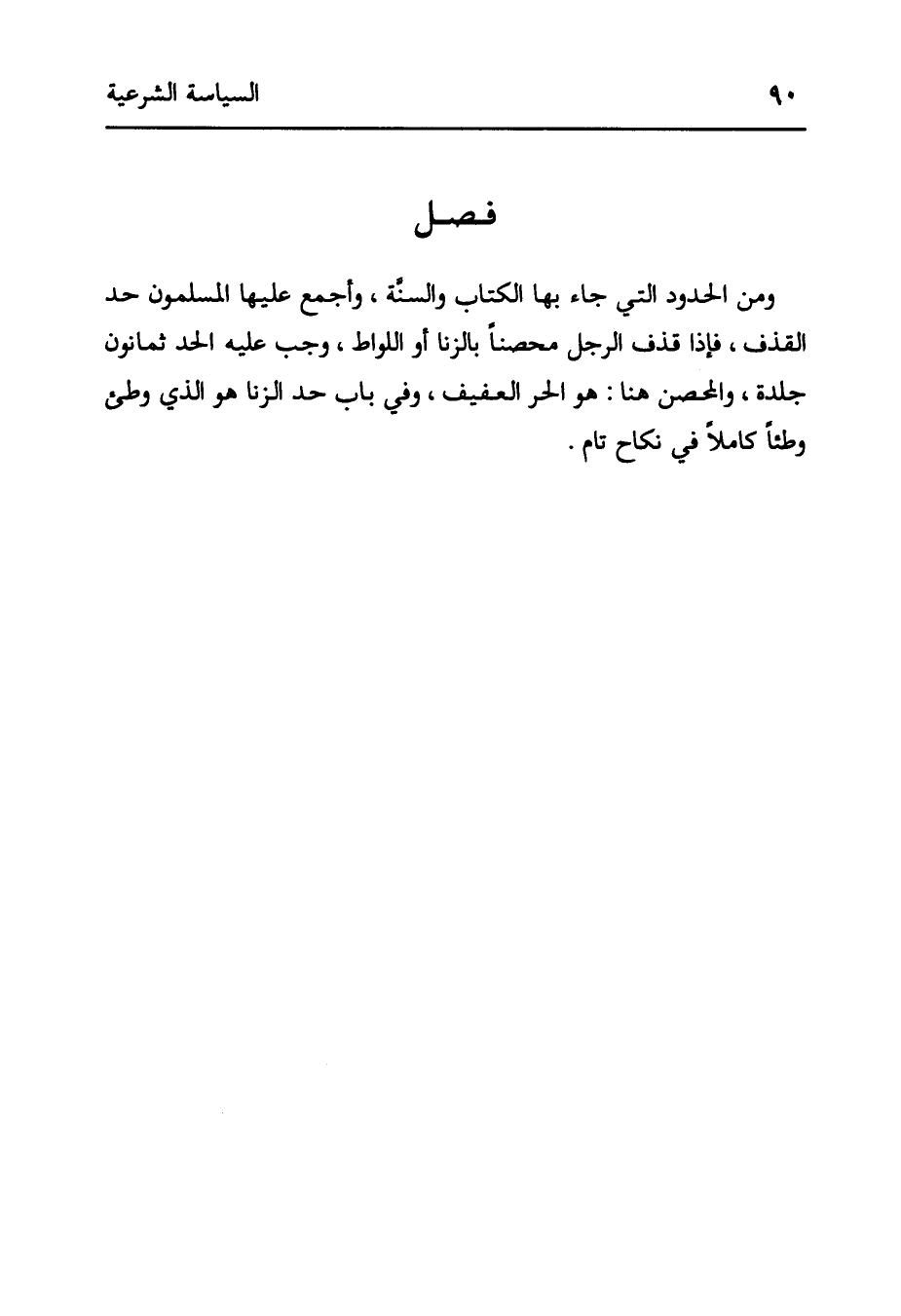فصل وَمِنْ الْحُدُودِ الَّتِي جَاءَ بِهَا الْكِتَابُ وَالسُّنَّةُ، وَأَجْمَعَ عَلَيْهَا الْمُسْلِمُونَ حَدُّ الْقَذْفِ، فَإِذَا قَذَفَ الرجل محصنا بالزنا أو اللواط، وَجَبَ عَلَيْهِ الْحَدُّ ثَمَانُونَ جَلْدَةً، وَالْمُحْصَنُ هُنَا: هُوَ الْحُرُّ الْعَفِيفُ، وَفِي بَابِ حَدِّ الزِّنَا هو الذي وطن وطئاً كاملا في نكاح تام.