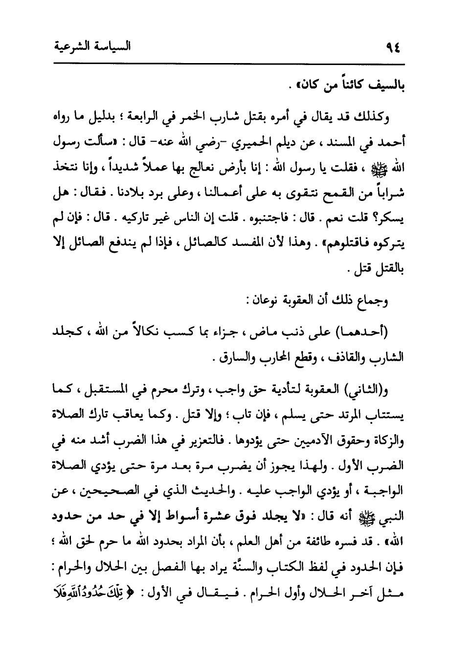 بِالسَّيْفِ كَائِنًا مَنْ كَانَ» . وَكَذَلِكَ قَدْ يُقَالُ في أمره بقتل شَارِبُ الْخَمْرِ فِي الرَّابِعَةِ؛ بِدَلِيلِ مَا رَوَاهُ أَحْمَدُ فِي الْمُسْنَدِ، عَنْ دَيْلَمَ الْحِمْيَرِيِّ -رَضِيَ الله عنه- قال: «سأل رَسُولَ اللَّهِ صَلَّى اللَّهُ عَلَيْهِ وَسَلَّمَ، فَقُلْتُ يَا رَسُولَ اللَّهِ: إنَّا بِأَرْضٍ نُعَالِجُ بِهَا عَمَلًا شَدِيدًا، وَإِنَّا نَتَّخِذُ شراباٌ مِنْ الْقَمْحِ نَتَقَوَّى بِهِ عَلَى أَعْمَالِنَا، وَعَلَى بَرْدِ بِلَادِنَا. فَقَالَ: هَلْ يُسْكِرُ؛ قُلْتُ نَعَمْ. قَالَ: فَاجْتَنِبُوهُ. قُلْتُ إنَّ النَّاسَ غَيْرُ تَارِكِيهِ. قَالَ: فَإِنْ لَمْ يَتْرُكُوهُ فَاقْتُلُوهُمْ» . وَهَذَا لِأَنَّ الْمُفْسِدَ كَالصَّائِلِ، فَإِذَا لَمْ يَنْدَفِعْ الصَّائِلُ إلَّا بِالْقَتْلِ قُتِلَ. وَجِمَاعُ ذَلِكَ أَنَّ الْعُقُوبَةَ نَوْعَانِ: (أَحَدُهُمَا) عَلَى ذَنْبٍ مَاضٍ، جَزَاءً بِمَا كَسَبَ نَكَالًا مِنْ اللَّهِ، كَجَلْدِ الشَّارِبِ وَالْقَاذِفِ، وَقَطْعِ الْمُحَارِبِ وَالسَّارِقِ. و (الثاني) الْعُقُوبَةُ لِتَأْدِيَةِ حَقٍّ وَاجِبٍ، وَتَرْكِ مُحَرَّمٍ فِي الْمُسْتَقْبَلِ، كَمَا يُسْتَتَابُ الْمُرْتَدُّ حَتَّى يُسْلِمَ، فَإِنْ تاب؛ وإلا قتل. وَكَمَا يُعَاقَبُ تَارِكُ الصَّلَاةِ وَالزَّكَاةِ وَحُقُوقِ الْآدَمِيِّينَ حَتَّى يُؤَدُّوهَا. فَالتَّعْزِيرُ فِي هَذَا الضَّرْبِ أَشَدُّ مِنْهُ فِي الضَّرْبِ الْأَوَّلِ. وَلِهَذَا يَجُوزُ أَنْ يُضْرَبَ مَرَّةً بَعْدَ مَرَّةٍ حَتَّى يُؤَدِّيَ الصَّلَاةَ الْوَاجِبَةَ، أَوْ يُؤَدِّيَ الْوَاجِبَ عَلَيْهِ. وَالْحَدِيثُ الَّذِي فِي الصَّحِيحَيْنِ، عَنْ النَّبِيِّ صَلَّى اللَّهُ عَلَيْهِ وَسَلَّمَ أَنَّهُ قَالَ: «لَا يُجْلَدُ فَوْقَ عَشْرَةِ أَسْوَاطٍ إلَّا فِي حَدٍّ مِنْ حُدُودِ اللَّهِ» . قَدْ فَسَّرَهُ طَائِفَةٌ مِنْ أَهْلِ الْعِلْمِ، بِأَنَّ الْمُرَادَ بِحُدُودِ اللَّهِ مَا حَرُمَ لِحَقِّ اللَّهِ، فَإِنَّ الْحُدُودَ فِي لَفْظِ الْكِتَابِ وَالسُّنَّةِ يُرَادُ بِهَا الْفَصْلُ بَيْنَ الْحَلَالِ وَالْحَرَامِ: مِثْلُ آخِرِ الْحَلَالِ وَأَوَّلِ الْحَرَامِ. فَيُقَالُ فِي الْأَوَّلِ: {تِلْكَ حُدُودُ اللَّهِ فَلَا تَعْتَدُوهَا} [البقرة: 229] (سورة البقرة من الآية 229) .
