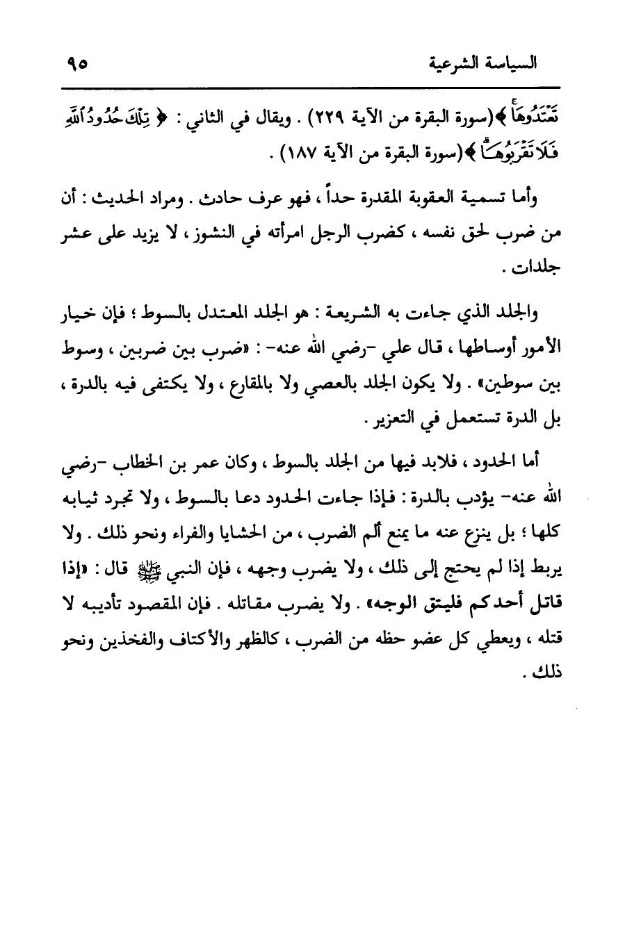 وَيُقَالُ فِي الثَّانِي: {تِلْكَ حُدُودُ اللَّهِ فَلَا تَقْرَبُوهَا} [البقرة: 187] (سورة البقرة من الآية 187) . وأما تسمية العقوبة المقدرة حَدًّا، فَهُوَ عُرْفٌ حَادِثٌ. وَمُرَادُ الْحَدِيثِ: أَنَّ مَنْ ضَرَبَ لِحَقِّ نَفْسِهِ، كَضَرْبِ الرَّجُلِ امْرَأَتَهُ فِي النُّشُوزِ، لَا يَزِيدُ عَلَى عَشْرِ جَلَدَاتٍ. وَالْجَلْدُ الَّذِي جَاءَتْ بِهِ الشَّرِيعَةُ: هُوَ الْجَلْدُ الْمُعْتَدِلُ بِالسَّوْطِ؛ فَإِنَّ خِيَارَ الْأُمُورِ أَوْسَاطُهَا، قَالَ عَلِيٌّ -رَضِيَ اللَّهُ عَنْهُ-: " ضَرْبٌ بَيْنَ ضَرْبَيْنِ، وَسَوْطٌ بَيْنَ سَوْطَيْنِ ". وَلَا يَكُونُ الْجَلْدُ بِالْعِصِيِّ وَلَا بِالْمَقَارِعِ، وَلَا يُكْتَفَى فِيهِ بِالدِّرَّةِ، بَلْ الدِّرَّةُ تُسْتَعْمَلُ فِي التَّعْزِيرِ. أَمَّا الْحُدُودُ، فَلَا بد فيها من الجلد بالسوط، وَكَانَ عُمَرُ بْنُ الْخَطَّابِ -رَضِيَ اللَّهُ عَنْهُ- يؤدب بالدرة: فإذا جَاءَتْ الْحُدُودُ دَعَا بِالسَّوْطِ، وَلَا تُجَرَّدُ ثِيَابُهُ كلها؛ بل ينزع عنه ما يمنع كم الضَّرْبِ، مِنْ الْحَشَايَا وَالْفِرَاءِ وَنَحْوِ ذَلِكَ. وَلَا يُرْبَطُ إذَا لَمْ يُحْتَجْ إلَى ذَلِكَ، وَلَا يُضْرَبُ وَجْهُهُ، فَإِنَّ النَّبِيَّ صَلَّى اللَّهُ عَلَيْهِ وَسَلَّمَ قَالَ: «إذَا قَاتَلَ أَحَدُكُمْ فَلْيَتَّقِ الْوَجْهَ» . وَلَا يَضْرِبُ مَقَاتِلَهُ. فَإِنَّ الْمَقْصُودَ تَأْدِيبُهُ لَا قَتْلُهُ، وَيُعْطَى كُلُّ عُضْوٍ حَظَّهُ مِنْ الضَّرْبِ، كالظهر والأكتاف والفخذين ونحو ذلك.