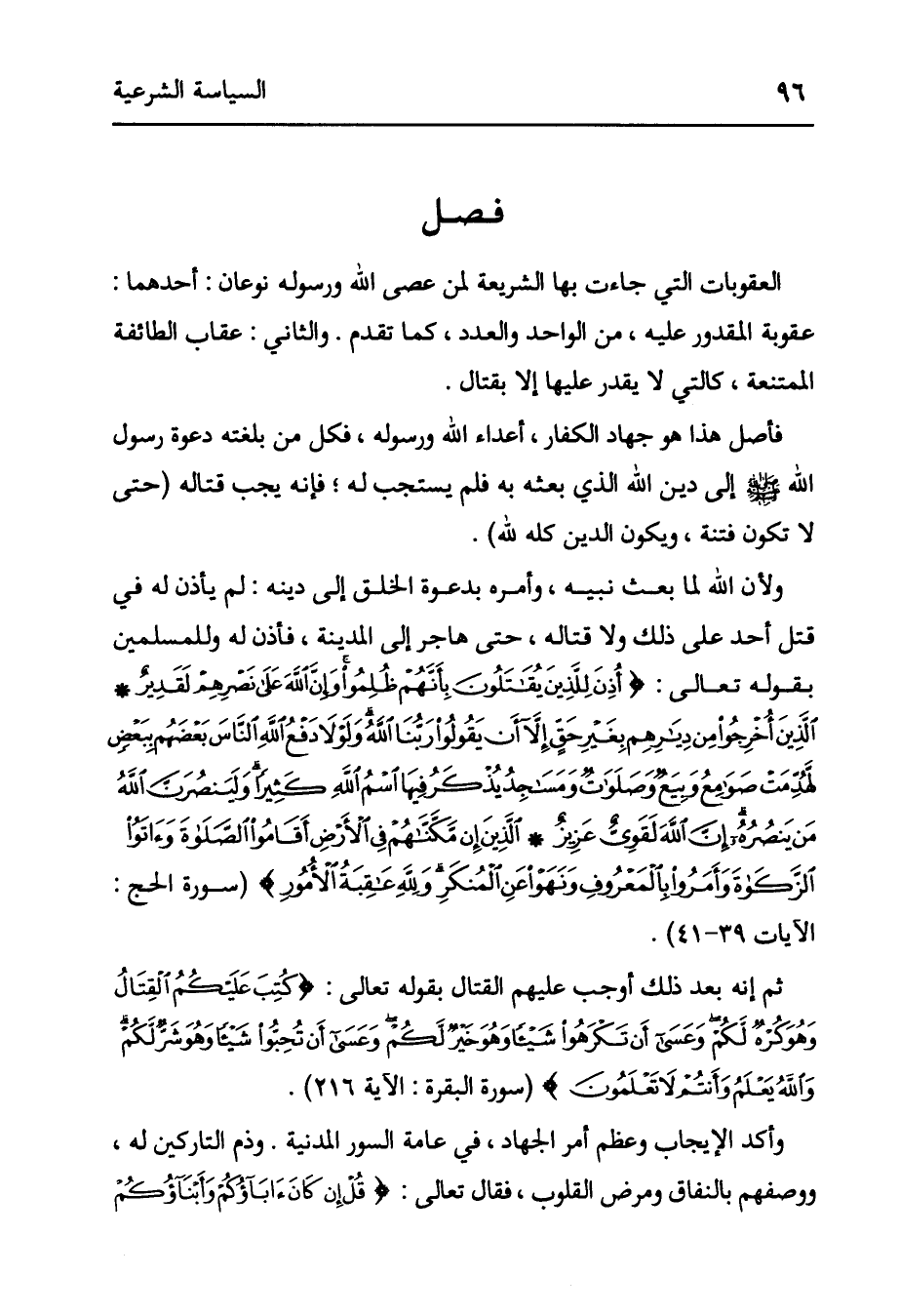 فصل الْعُقُوبَاتُ الَّتِي جَاءَتْ بِهَا الشَّرِيعَةُ لِمَنْ عَصَى الله ورسوله نوعان: أحدهما: عقوبة المقدور عَلَيْهِ، مِنْ الْوَاحِدِ وَالْعَدَدِ، كَمَا تَقَدَّمَ. وَالثَّانِي: عِقَابُ الطَّائِفَةِ الْمُمْتَنِعَةِ، كَاَلَّتِي لَا يُقْدَرُ عَلَيْهَا إلَّا بِقِتَالٍ. فَاصِلٍ هَذَا هُوَ جِهَادُ الْكُفَّارِ، أعداء الله ورسوله، فكل من بلغته دَعْوَةُ رَسُولِ اللَّهِ صَلَّى اللَّهُ عَلَيْهِ وَسَلَّمَ إلَى دِينِ اللَّهِ الَّذِي بَعَثَهُ بِهِ فَلَمْ يَسْتَجِبْ لَهُ؛ فَإِنَّهُ يَجِبُ قِتَالُهُ (حَتَّى لَا تكون فتنة، ويكون الدين كله لله) . ولأن الله لما بعث نبيه، وأمره بدعوة الخلق إلى دينه: لم يأذن له فِي قَتْلِ أَحَدٍ عَلَى ذَلِكَ وَلَا قِتَالِهِ، حَتَّى هَاجَرَ إلَى الْمَدِينَةِ، فَأَذِنَ لَهُ وَلِلْمُسْلِمِينَ بِقَوْلِهِ تَعَالَى: {أُذِنَ لِلَّذِينَ يُقَاتَلُونَ بِأَنَّهُمْ ظُلِمُوا وَإِنَّ اللَّهَ عَلَى نَصْرِهِمْ لَقَدِيرٌ - الَّذِينَ أُخْرِجُوا مِنْ دِيَارِهِمْ بِغَيْرِ حَقٍّ إِلَّا أَنْ يَقُولُوا رَبُّنَا اللَّهُ وَلَوْلَا دَفْعُ اللَّهِ النَّاسَ بَعْضَهُمْ بِبَعْضٍ لَهُدِّمَتْ صَوَامِعُ وَبِيَعٌ وَصَلَوَاتٌ وَمَسَاجِدُ يُذْكَرُ فِيهَا اسْمُ اللَّهِ كَثِيرًا وَلَيَنْصُرَنَّ اللَّهُ مَنْ يَنْصُرُهُ إِنَّ اللَّهَ لَقَوِيٌّ عَزِيزٌ - الَّذِينَ إِنْ مَكَّنَّاهُمْ فِي الْأَرْضِ أَقَامُوا الصَّلَاةَ وَآتَوُا الزَّكَاةَ وَأَمَرُوا بِالْمَعْرُوفِ وَنَهَوْا عَنِ الْمُنْكَرِ وَلِلَّهِ عَاقِبَةُ الْأُمُورِ} [الحج: 39 - 41] (سورة الحج: الآيات 39- 41) . ثُمَّ إنَّهُ بَعْدَ ذَلِكَ أَوْجَبَ عَلَيْهِمْ الْقِتَالَ بقوله تعالى: {كُتِبَ عَلَيْكُمُ الْقِتَالُ وَهُوَ كُرْهٌ لَكُمْ وَعَسَى أَنْ تَكْرَهُوا شَيْئًا وَهُوَ خَيْرٌ لَكُمْ وَعَسَى أَنْ تُحِبُّوا شَيْئًا وَهُوَ شَرٌّ لَكُمْ وَاللَّهُ يَعْلَمُ وَأَنْتُمْ لَا تَعْلَمُونَ} [البقرة: 216] (سورة البقرة: الآية 216) . وَأَكَّدَ الْإِيجَابَ وَعَظَّمَ أَمْرَ الْجِهَادِ، فِي عَامَّةِ السُّوَرِ الْمَدَنِيَّةِ. وَذَمَّ التَّارِكِينَ لَهُ، وَوَصَفَهُمْ بِالنِّفَاقِ ومرض القلوب،