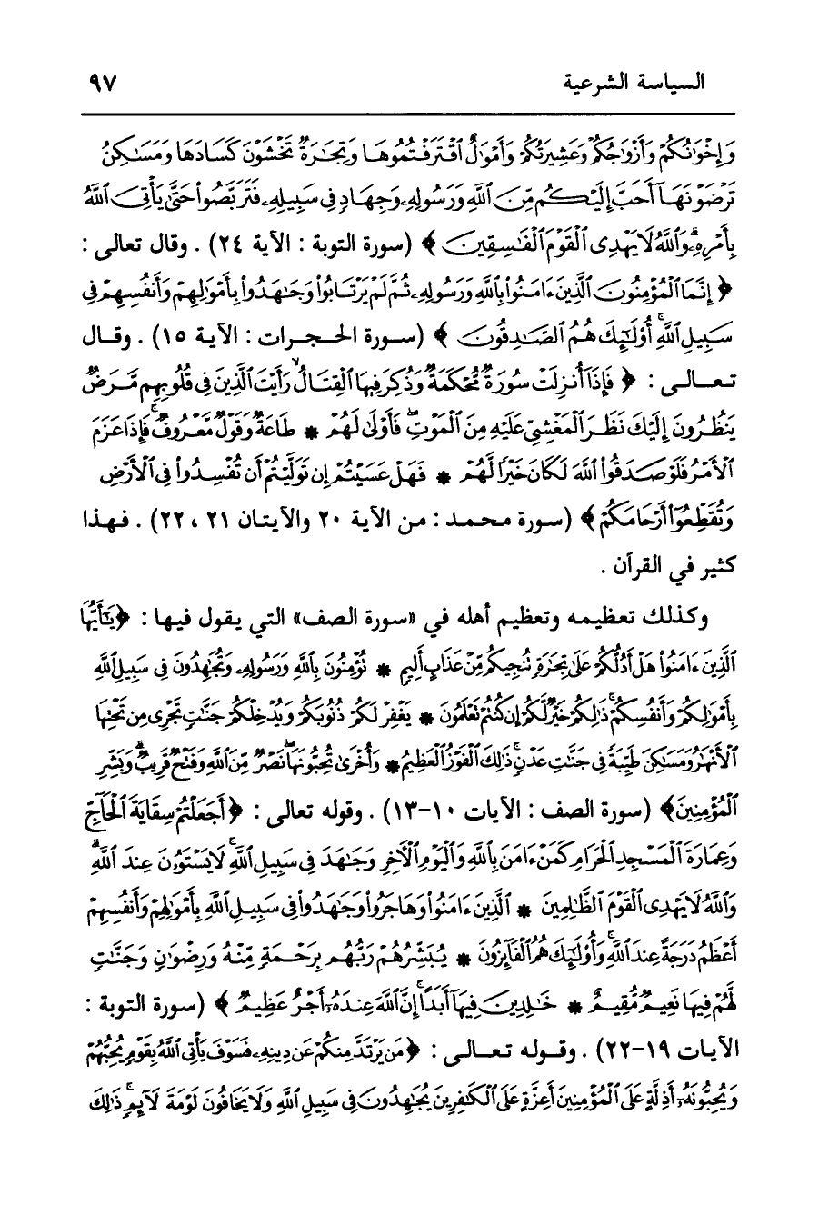 وقال تَعَالَى {قُلْ إِنْ كَانَ آبَاؤُكُمْ وَأَبْنَاؤُكُمْ وَإِخْوَانُكُمْ وَأَزْوَاجُكُمْ وَعَشِيرَتُكُمْ وَأَمْوَالٌ اقْتَرَفْتُمُوهَا وَتِجَارَةٌ تَخْشَوْنَ كَسَادَهَا وَمَسَاكِنُ تَرْضَوْنَهَا أَحَبَّ إِلَيْكُمْ مِنَ اللَّهِ وَرَسُولِهِ وَجِهَادٍ فِي سَبِيلِهِ فَتَرَبَّصُوا حَتَّى يَأْتِيَ اللَّهُ بِأَمْرِهِ وَاللَّهُ لَا يَهْدِي الْقَوْمَ الْفَاسِقِينَ} [التوبة: 24] (سورة التوبة: الآية 15) . وَقَالَ تَعَالَى: {إِنَّمَا الْمُؤْمِنُونَ الَّذِينَ آمَنُوا بِاللَّهِ وَرَسُولِهِ ثُمَّ لَمْ يَرْتَابُوا وَجَاهَدُوا بِأَمْوَالِهِمْ وَأَنْفُسِهِمْ فِي سَبِيلِ اللَّهِ أُولَئِكَ هُمُ الصَّادِقُونَ} [الحجرات: 15] (سورة الحجرات: الآية 15) . وقال تَعَالَى {فَإِذَا أُنْزِلَتْ سُورَةٌ مُحْكَمَةٌ وَذُكِرَ فِيهَا الْقِتَالُ رَأَيْتَ الَّذِينَ فِي قُلُوبِهِمْ مَرَضٌ يَنْظُرُونَ إِلَيْكَ نَظَرَ الْمَغْشِيِّ عَلَيْهِ مِنَ الْمَوْتِ فَأَوْلَى لَهُمْ - طَاعَةٌ وَقَوْلٌ مَعْرُوفٌ فَإِذَا عَزَمَ الْأَمْرُ فَلَوْ صَدَقُوا اللَّهَ لَكَانَ خَيْرًا لَهُمْ - فَهَلْ عَسَيْتُمْ إِنْ تَوَلَّيْتُمْ أَنْ تُفْسِدُوا فِي الْأَرْضِ وَتُقَطِّعُوا أَرْحَامَكُمْ} [محمد: 20 - 22] (سورة محمد: من الآية 20 والآيتان 21، 22) . فهذا كَثِيرٌ فِي الْقُرْآنِ. وَكَذَلِكَ تَعْظِيمُهُ وَتَعْظِيمُ أَهْلِهِ فِي " سُورَةِ الصَّفِّ " الَّتِي يَقُولُ فِيهَا: {يَا أَيُّهَا الَّذِينَ آمَنُوا هَلْ أَدُلُّكُمْ عَلَى تِجَارَةٍ تُنْجِيكُمْ مِنْ عَذَابٍ أَلِيمٍ - تُؤْمِنُونَ بِاللَّهِ وَرَسُولِهِ وَتُجَاهِدُونَ فِي سَبِيلِ اللَّهِ بِأَمْوَالِكُمْ وَأَنْفُسِكُمْ ذَلِكُمْ خَيْرٌ لَكُمْ إِنْ كُنْتُمْ تَعْلَمُونَ - يَغْفِرْ لَكُمْ ذُنُوبَكُمْ وَيُدْخِلْكُمْ جَنَّاتٍ تَجْرِي مِنْ تَحْتِهَا الْأَنْهَارُ وَمَسَاكِنَ طَيِّبَةً فِي جَنَّاتِ عَدْنٍ ذَلِكَ الْفَوْزُ الْعَظِيمُ - وَأُخْرَى تُحِبُّونَهَا نَصْرٌ مِنَ اللَّهِ وَفَتْحٌ قَرِيبٌ وَبَشِّرِ الْمُؤْمِنِينَ} [الصف: 10 - 13] (سورة الصف: الآيات 10-13) . وقوله تَعَالَى: {أَجَعَلْتُمْ سِقَايَةَ الْحَاجِّ وَعِمَارَةَ الْمَسْجِدِ الْحَرَامِ كَمَنْ آمَنَ بِاللَّهِ وَالْيَوْمِ الْآخِرِ وَجَاهَدَ فِي سَبِيلِ اللَّهِ لَا يَسْتَوُونَ عِنْدَ اللَّهِ وَاللَّهُ لَا يَهْدِي الْقَوْمَ الظَّالِمِينَ - الَّذِينَ آمَنُوا وَهَاجَرُوا وَجَاهَدُوا فِي سَبِيلِ اللَّهِ بِأَمْوَالِهِمْ وَأَنْفُسِهِمْ أَعْظَمُ دَرَجَةً عِنْدَ اللَّهِ وَأُولَئِكَ هُمُ الْفَائِزُونَ - يُبَشِّرُهُمْ رَبُّهُمْ بِرَحْمَةٍ مِنْهُ وَرِضْوَانٍ وَجَنَّاتٍ لَهُمْ فِيهَا نَعِيمٌ مُقِيمٌ - خَالِدِينَ فِيهَا أَبَدًا إِنَّ اللَّهَ عِنْدَهُ أَجْرٌ عَظِيمٌ} [التوبة: 19 - 22] (سورة التوبة: الآيات 19-22) . وقَوْله تَعَالَى: {مَنْ يَرْتَدَّ مِنْكُمْ عَنْ دِينِهِ فَسَوْفَ يَأْتِي اللَّهُ بِقَوْمٍ يُحِبُّهُمْ وَيُحِبُّونَهُ أَذِلَّةٍ عَلَى الْمُؤْمِنِينَ أَعِزَّةٍ عَلَى الْكَافِرِينَ يُجَاهِدُونَ فِي سَبِيلِ اللَّهِ وَلَا يَخَافُونَ لَوْمَةَ لَائِمٍ ذَلِكَ فَضْلُ اللَّهِ يُؤْتِيهِ مَنْ يَشَاءُ وَاللَّهُ وَاسِعٌ عَلِيمٌ} [المائدة: 54] (سورة المائدة: من الآية 54) .