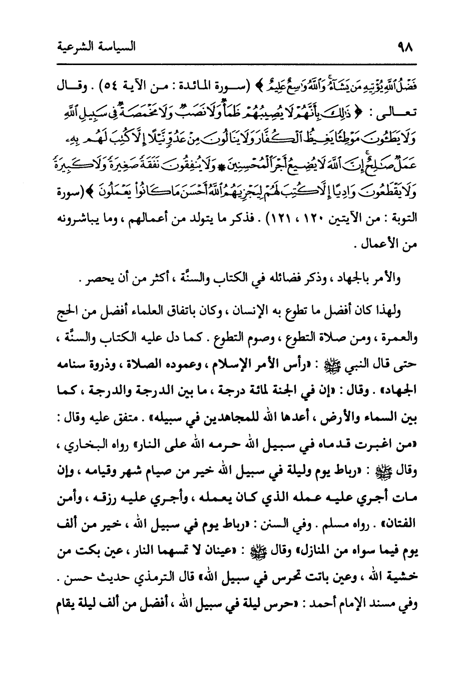 وَقَالَ تَعَالَى: {ذَلِكَ بِأَنَّهُمْ لَا يُصِيبُهُمْ ظَمَأٌ وَلَا نَصَبٌ وَلَا مَخْمَصَةٌ فِي سَبِيلِ اللَّهِ وَلَا يَطَئُونَ مَوْطِئًا يَغِيظُ الْكُفَّارَ وَلَا يَنَالُونَ مِنْ عَدُوٍّ نَيْلًا إِلَّا كُتِبَ لَهُمْ بِهِ عَمَلٌ صَالِحٌ إِنَّ اللَّهَ لَا يُضِيعُ أَجْرَ الْمُحْسِنِينَ - وَلَا يُنْفِقُونَ نَفَقَةً صَغِيرَةً وَلَا كَبِيرَةً وَلَا يَقْطَعُونَ وَادِيًا إِلَّا كُتِبَ لَهُمْ لِيَجْزِيَهُمُ اللَّهُ أَحْسَنَ مَا كَانُوا يَعْمَلُونَ} [التوبة: 120 - 121] (سورة التوبة: من الآيتين 120، 121) . فذكر ما يتولد من أَعْمَالِهِمْ، وَمَا يُبَاشِرُونَهُ مِنْ الْأَعْمَالِ. وَالْأَمْرِ بِالْجِهَادِ، وَذِكْرِ فَضَائِلِهِ فِي الْكِتَابِ وَالسُّنَّةِ، أَكْثَرُ مِنْ أَنْ يُحْصَرَ. وَلِهَذَا كَانَ أَفْضَلَ مَا تَطَوَّعَ بِهِ الْإِنْسَانُ، وَكَانَ بِاتِّفَاقِ الْعُلَمَاءِ أَفْضَلَ مِنْ الحج والعمرة، ومن صلاة التطوع، وصوم التَّطَوُّعِ. كَمَا دَلَّ عَلَيْهِ الْكِتَابُ وَالسُّنَّةُ، حَتَّى قَالَ النَّبِيُّ صَلَّى اللَّهُ عَلَيْهِ وَسَلَّمَ: «رَأْسُ الأمر الإسلام، وعموده الصلاة، وذروة سنامه الجهاد» . وَقَالَ: «إنَّ فِي الْجَنَّةِ لَمِائَةَ دَرَجَةٍ، مَا بَيْنَ الدَّرَجَةِ وَالدَّرَجَةِ، كَمَا بَيْنَ السَّمَاءِ وَالْأَرْضِ، أَعَدَّهَا اللَّهُ لِلْمُجَاهِدِينَ فِي سَبِيلِهِ» . مُتَّفَقٌ عَلَيْهِ وقال: «من اغبرت قَدَمَاهُ فِي سَبِيلِ اللَّهِ حَرَّمَهُ اللَّهُ عَلَى النَّارِ» رَوَاهُ الْبُخَارِيُّ، وَقَالَ صَلَّى اللَّهُ عَلَيْهِ وسلم: «رباط يوم وليلة في سبيل الله خَيْرٌ مِنْ صِيَامِ شَهْرٍ وَقِيَامِهِ، وَإِنْ مَاتَ أُجْرِيَ عَلَيْهِ عَمَلُهُ الَّذِي كَانَ يَعْمَلُهُ، وَأُجْرِيَ عَلَيْهِ رِزْقُهُ، وَأَمِنَ الْفَتَّانَ» . رَوَاهُ مُسْلِمٌ وَفِي السُّنَنِ: «رِبَاطُ يَوْمٍ فِي سَبِيلِ اللَّهِ، خَيْرٌ مِنْ أَلْفِ يَوْمٍ فِيمَا سِوَاهُ مِنْ الْمَنَازِلِ» وَقَالَ صَلَّى اللَّهُ عَلَيْهِ وَسَلَّمَ: «عَيْنَانِ لَا تَمَسُّهُمَا النَّارُ، عَيْنٌ بَكَتْ مِنْ خَشْيَةِ اللَّهِ، وَعَيْنٌ بَاتَتْ تَحْرُسُ فِي سَبِيلِ اللَّهِ» قَالَ التِّرْمِذِيُّ حَدِيثٌ حَسَنٌ. وَفِي مُسْنَدِ الْإِمَامِ أَحْمَدَ: «حَرْسُ لَيْلَةٍ فِي سَبِيلِ اللَّهِ، أَفْضَلُ مِنْ أَلْفِ لَيْلَةٍ يُقَامُ