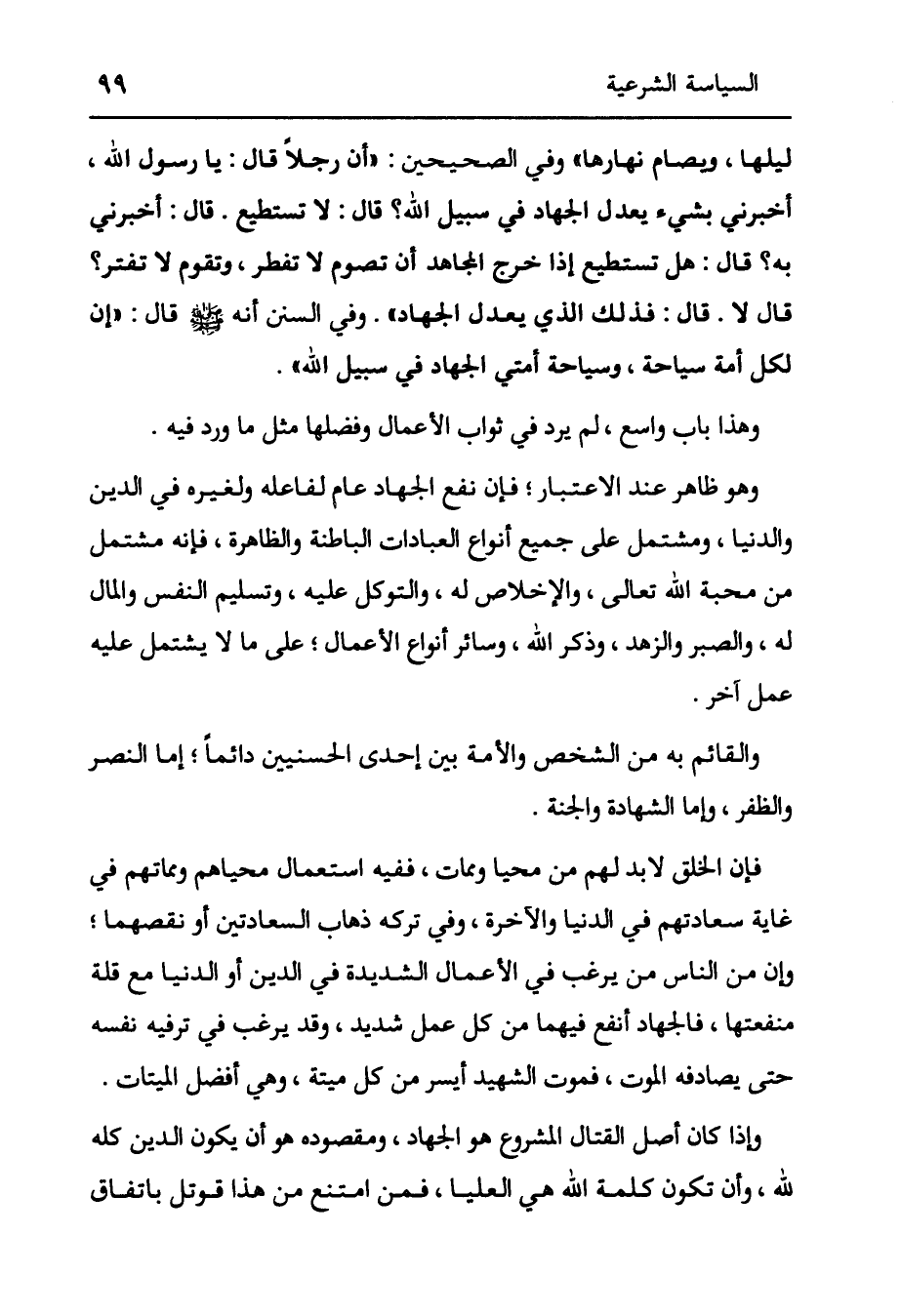 لَيْلُهَا، وَيُصَامُ نَهَارُهَا» وَفِي الصَّحِيحَيْنِ: «أَنَّ رَجُلًا قَالَ: يَا رَسُولَ اللَّهِ، أَخْبِرْنِي بِشَيْءٍ يَعْدِلُ الْجِهَادَ فِي سَبِيلِ اللَّهِ؛ قَالَ: لَا تَسْتَطِيعُ. قَالَ: أَخْبَرَنِي بِهِ؛ قَالَ: هَلْ تَسْتَطِيعُ إذَا خرج المجاهد أن تصوم لا تفطر، وتقوم لا تَفْتُرَ؟ قَالَ لَا. قَالَ: فَذَلِكَ الَّذِي يَعْدِلُ الْجِهَادَ ". وَفِي السُّنَنِ أَنَّهُ صَلَّى اللَّهُ عَلَيْهِ وَسَلَّمَ قَالَ " إنَّ لِكُلِّ أُمَّةٍ سِيَاحَةً، وَسِيَاحَةُ أُمَّتِي الْجِهَادُ فِي سَبِيلِ اللَّهِ» . وَهَذَا بَابٌ وَاسِعٌ، لَمْ يَرِدْ فِي ثَوَابِ الْأَعْمَالِ وَفَضْلِهَا مثل ما ورد فيه. وهو ظَاهِرٌ عِنْدَ الِاعْتِبَارِ؛ فَإِنَّ نَفْعَ الْجِهَادِ عَامٌّ لِفَاعِلِهِ وَلِغَيْرِهِ فِي الدِّينِ وَالدُّنْيَا، وَمُشْتَمِلٌ عَلَى جميع أنواع العبارات الباطنة والطاهرة، فَإِنَّهُ مُشْتَمِلٌ مِنْ مَحَبَّةِ اللَّهِ تَعَالَى، وَالْإِخْلَاصِ لَهُ، وَالتَّوَكُّلِ عَلَيْهِ، وَتَسْلِيمِ النَّفْسِ وَالْمَالِ لَهُ، وَالصَّبْرِ وَالزُّهْدِ، وَذِكْرِ اللَّهِ، وَسَائِرِ أَنْوَاعِ الْأَعْمَالِ؛ عَلَى مَا لَا يَشْتَمِلُ عَلَيْهِ عَمَلٌ آخَرُ. والقائم به من الشخص والأمن أن إحْدَى الْحُسْنَيَيْنِ دَائِمًا؛ إمَّا النَّصْرُ وَالظَّفَرُ، وَإِمَّا الشهادة والجنة. فإن الْخَلْقَ لَا بُدَّ لَهُمْ مِنْ مَحْيَا وَمَمَاتٍ، فَفِيهِ اسْتِعْمَالُ مَحْيَاهُمْ وَمَمَاتِهِمْ فِي غَايَةِ سَعَادَتِهِمْ فِي الدُّنْيَا وَالْآخِرَةِ، وَفِي تَرْكِهِ ذَهَابُ السَّعَادَتَيْنِ أو نقصهما؛ وإن من الناس من يركب فِي الْأَعْمَالِ الشَّدِيدَةِ فِي الدِّينِ أَوْ الدُّنْيَا مَعَ قِلَّةِ مَنْفَعَتِهَا، فَالْجِهَادُ أَنْفَعُ فِيهِمَا مِنْ كل عمل شديد، وقد يرغب في ترفيه نَفْسِهِ حَتَّى يُصَادِفَهُ الْمَوْتُ، فَمَوْتُ الشَّهِيدِ أَيْسَرُ مِنْ كُلِّ مَيْتَةٍ، وَهِيَ أَفْضَلُ الْمَيْتَاتِ. وَإِذَا كَانَ أَصْلُ الْقِتَالِ الْمَشْرُوعِ هُوَ الْجِهَادُ، وَمَقْصُودُهُ هُوَ أَنْ يَكُونَ الدِّينُ كُلُّهُ لِلَّهِ، وَأَنْ تَكون كلمة الله هي العليا، فمن امتنع من هَذَا قُوتِلَ بِاتِّفَاقِ