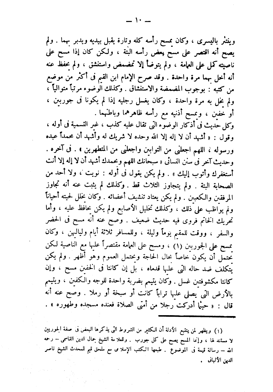 (¬1) ويظهر لمن تتبع الأدلة أن الكثير من الشروط التي يذكرها البعض في صفة الجوربين لا مستند لها، وإنما المسح يصح على كل جورب. وللعلامة الشيخ جمال الدين القاسمي ـ رحمه الله ـ رسالة قيمة في الموضوع. طبعها المكتب الإسلامي مع ملحق قيم للمحدث الشيخ ناصر الدين الألباني.