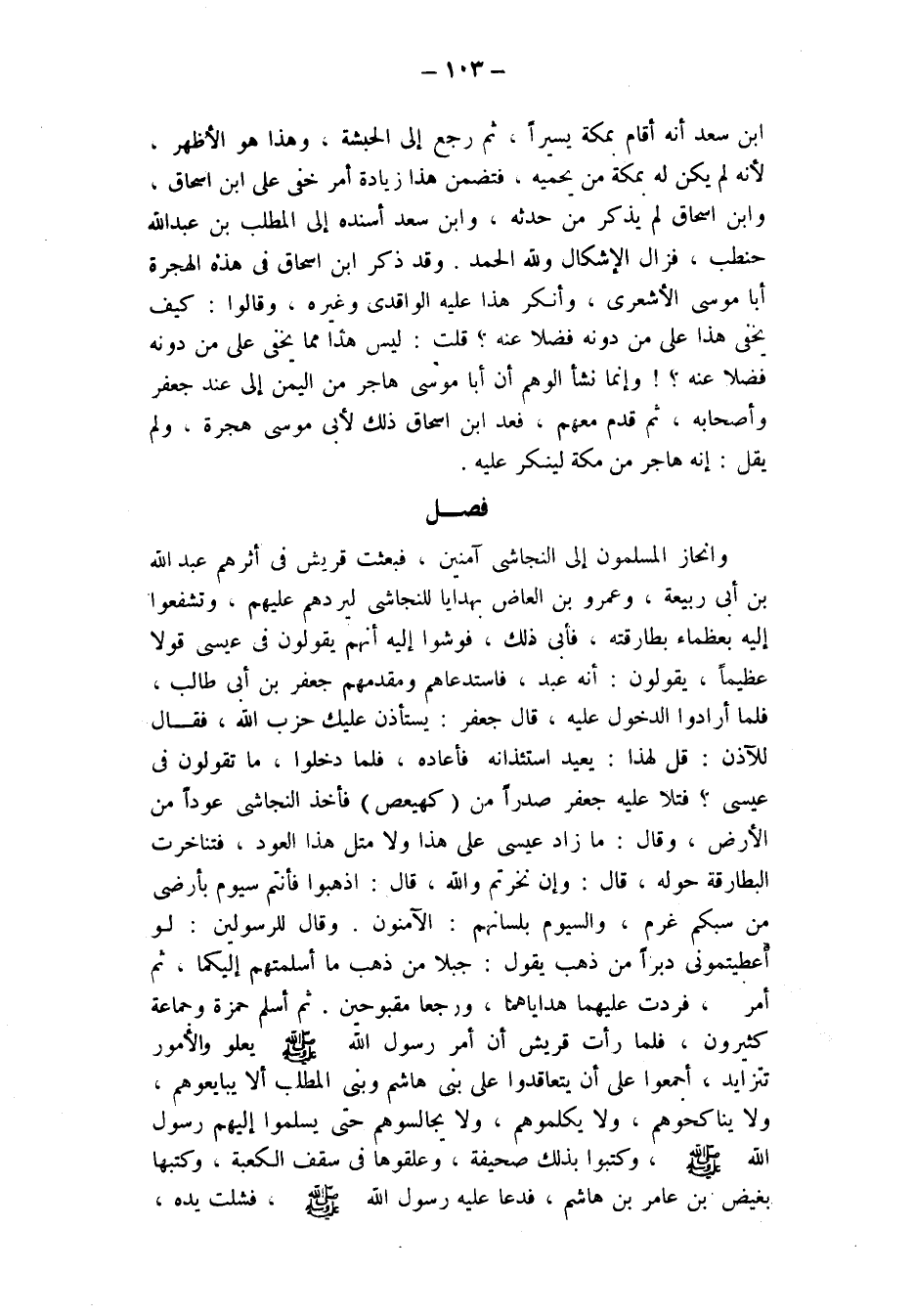 فصل وانحاز المسلمون إلى النجاشي آمنين، فبعثت قريش فِي أَثَرِهِمْ عبد الله بن أبي ربيعة وعمرو بن العاص بهدايا للنجاشي ليردهم عليهم، وتشفعوا إليه بعظماء بطارقته، فأبى ذلك، فوشوا إليه أنهم يَقُولُونَ فِي عِيسَى قَوْلًا عَظِيمًا، يَقُولُونَ: إِنَّهُ عبد، فاستدعاهم وَمُقَدَّمُهُمْ جَعْفَرُ بْنُ أَبِي طَالِبٍ، فَلَمَّا أَرَادُوا الدُّخُولَ عَلَيْهِ، قَالَ جعفر: يَسْتَأْذِنُ عَلَيْكَ حِزْبُ الله، فقال للآذن: قل لهذا يعيد استئذانه، فأعاده. فلما دخلوا، قَالَ: مَا تَقُولُونَ فِي عِيسَى؟ فَتَلَا عَلَيْهِ جعفر صدرا من (كهيعص) ، فأخذ النجاشي عودا من الأرض، وقال: ما زاد عيسى على هذا، ولا مثل هذا العود، فتناخرت البطارقة حوله، قال: وإن نخرتم والله، قَالَ: اذْهَبُوا فَأَنْتُمْ سُيُومٌ بِأَرْضِي، مَنْ سَبَّكُمْ غرم - والسيوم بلسانهم: الآمنون - وقال لِلرَّسُولَيْنِ: لَوْ أَعْطَيْتُمُونِي دَبَرًا مِنْ ذَهَبٍ - يَقُولُ: جَبَلًا مِنْ ذَهَبٍ - مَا أَسْلَمْتُهُمْ إِلَيْكُمَا، ثُمَّ أمر فردت عليهما هداياهما، ورجعا مقبوحين. ثم أسلم حمزة وجماعة كثيرون، فلما رأت قريش أن أمر رسول الله صلى الله عليه وسلم يَعْلُو وَالْأُمُورُ تَتَزَايَدُ، أَجْمَعُوا عَلَى أَنْ يَتَعَاقَدُوا على بني هاشم وبني المطلب ألا يُبَايِعُوهُمْ، وَلَا يُنَاكِحُوهُمْ، وَلَا يُكَلِّمُوهُمْ، وَلَا يُجَالِسُوهُمْ، حَتَّى يُسَلِّمُوا إِلَيْهِمْ رَسُولَ اللَّهِ صَلَّى اللَّهُ عَلَيْهِ وَسَلَّمَ، وَكَتَبُوا بِذَلِكَ صَحِيفَةً، وَعَلَّقُوهَا فِي سقف الكعبة، وكتبها بغيض بن عامر بن هاشم، فَدَعَا عَلَيْهِ رَسُولُ اللَّهِ صَلَّى اللَّهُ عَلَيْهِ وَسَلَّمَ، فَشُلَّتْ يده،