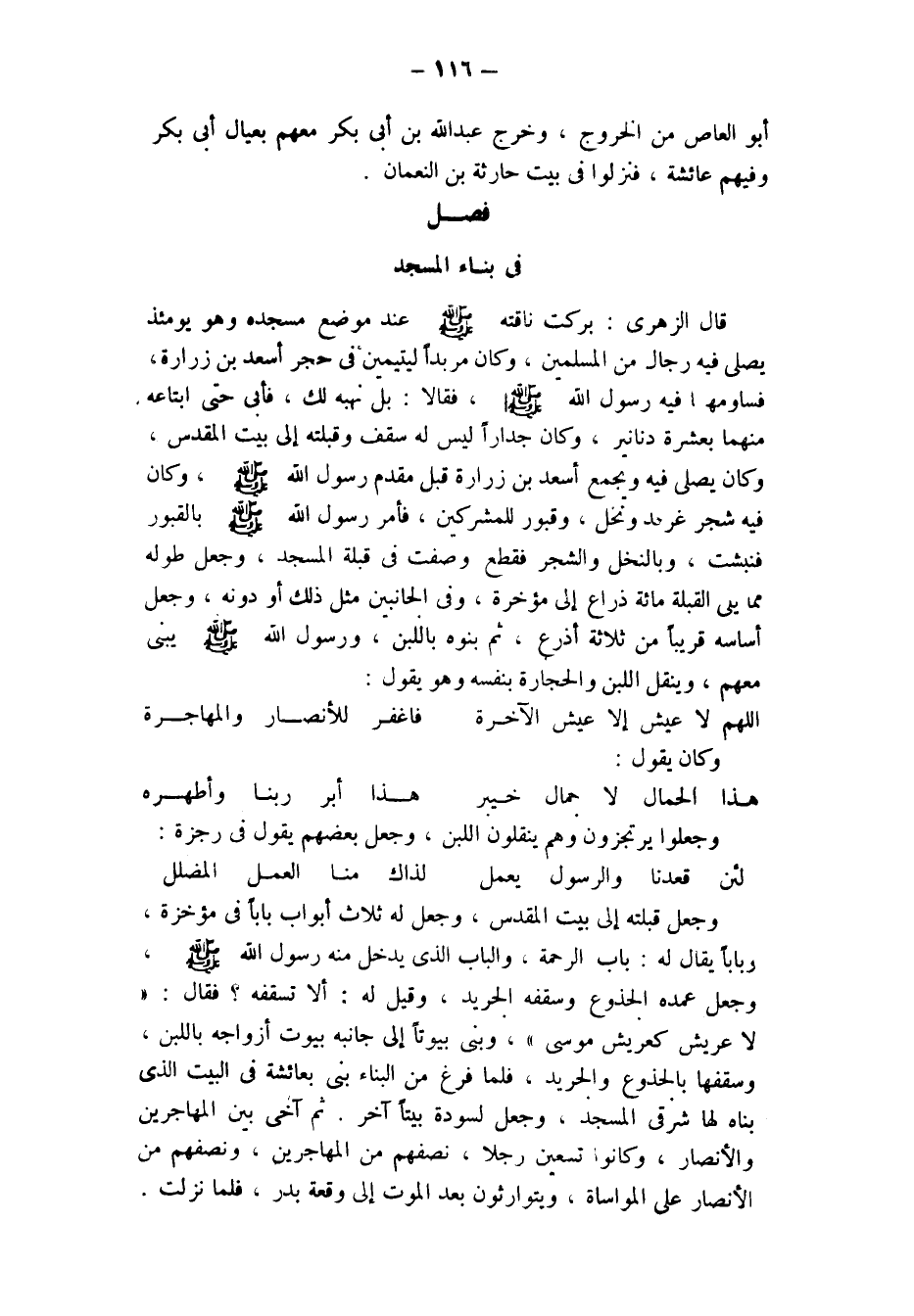 فِي بِنَاءِ المسجد قال الزهري: بركت ناقته - صلى الله عليه وسلم - عند مَوْضِعَ مَسْجِدِهِ وَهُوَ يَوْمَئِذٍ يُصَلِّي فِيهِ رِجَالٌ من المسلمين، وكان مربدا ليتيمين في حجر أسعد بن زرارة، فساومهما فِيهِ رَسُولُ اللَّهِ - صَلَّى اللَّهُ عَلَيْهِ وَسَلَّمَ - فقالا: بل نهبه لك، فأبى حتى ابتاعه مِنْهُمَا بِعَشَرَةِ دَنَانِيرَ، وَكَانَ جِدَارًا لَيْسَ لَهُ سَقْفٌ وَقِبْلَتُهُ إِلَى بَيْتِ الْمَقْدِسِ، وَكَانَ يُصَلِّي فِيهِ وَيُجَمِّعُ أَسْعَدُ بْنُ زُرَارَةَ قَبْلَ مَقْدَمِ رَسُولِ اللَّهِ - صَلَّى اللَّهُ عَلَيْهِ وَسَلَّمَ - وَكَانَ فيه شجر غرقد وَنَخْلٌ، وَقُبُورٌ لِلْمُشْرِكِينَ، فَأَمَرَ رَسُولُ اللَّهِ - صَلَّى اللَّهُ عَلَيْهِ وَسَلَّمَ - بالقبور فنبشت، وبالنخل والشجر فقطع، وَصُفَّتْ فِي قِبْلَةِ الْمَسْجِدِ، وَجَعَلَ طُولَهُ مِمَّا يلي القبلة مائة ذراع إلى مؤخره، وفي الجانبين مِثْلَ ذَلِكَ أَوْ دُونَهُ، وَجَعَلَ أَسَاسَهُ قَرِيبًا من ثلاثة أذرع، ثم بنوه باللبن، ورسول اللَّهِ - صَلَّى اللَّهُ عَلَيْهِ وَسَلَّمَ - يَبْنِي مَعَهُمْ، وينقل اللبن والحجارة بنفسه وهو يقول: