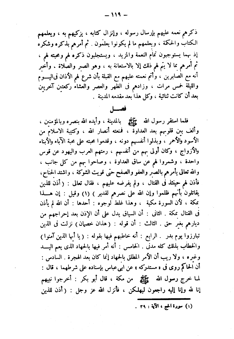 فَصْلٌ فَلَمَّا اسْتَقَرَّ رَسُولُ اللَّهِ - صَلَّى اللَّهُ عَلَيْهِ وَسَلَّمَ - بِالْمَدِينَةِ، وأيده الله بنصره وبالمؤمنين، وألف بين قلوبهم بعد العداوة، فَمَنَعَتْهُ أَنْصَارُ اللَّهِ، وَكَتِيبَةُ الْإِسْلَامِ مِنَ الْأَسْوَدِ والأحمر، وبذلوا أنفسهم دُونَهُ، وَقَدَّمُوا مَحَبَّتَهُ عَلَى مَحَبَّةِ الْآبَاءِ وَالْأَبْنَاءِ وَالْأَزْوَاجِ، وَكَانَ أَوْلَى بِهِمْ مِنْ أَنْفُسِهِمْ، رَمَتْهُمُ الْعَرَبُ وَالْيَهُودُ عَنْ قَوْسٍ وَاحِدَةٍ، وَشَمَّرُوا لَهُمْ عن ساق العداوة، وصاحوا بهم من كل جانب، والله تعالى يَأْمُرُهُمْ بِالصَّبْرِ وَالْعَفْوِ وَالصَّفْحِ حَتَّى قَوِيَتِ الشَّوْكَةُ، وَاشْتَدَّ الْجَنَاحُ، فَأُذِنَ لَهُمْ حِينَئِذٍ فِي الْقِتَالِ، وَلَمْ يَفْرِضْهُ عَلَيْهِمْ، فَقَالَ تَعَالَى: {أُذِنَ لِلَّذِينَ يُقَاتَلُونَ بِأَنَّهُمْ ظُلِمُوا وَإِنَّ اللَّهَ عَلَى نَصْرِهِمْ لَقَدِيرٌ} [الحج: 39] (¬1) وقيل: إن هذا بمكة، لأن السورة مَكِّيَّةٌ، وَهَذَا غَلَطٌ لِوُجُوهٍ: