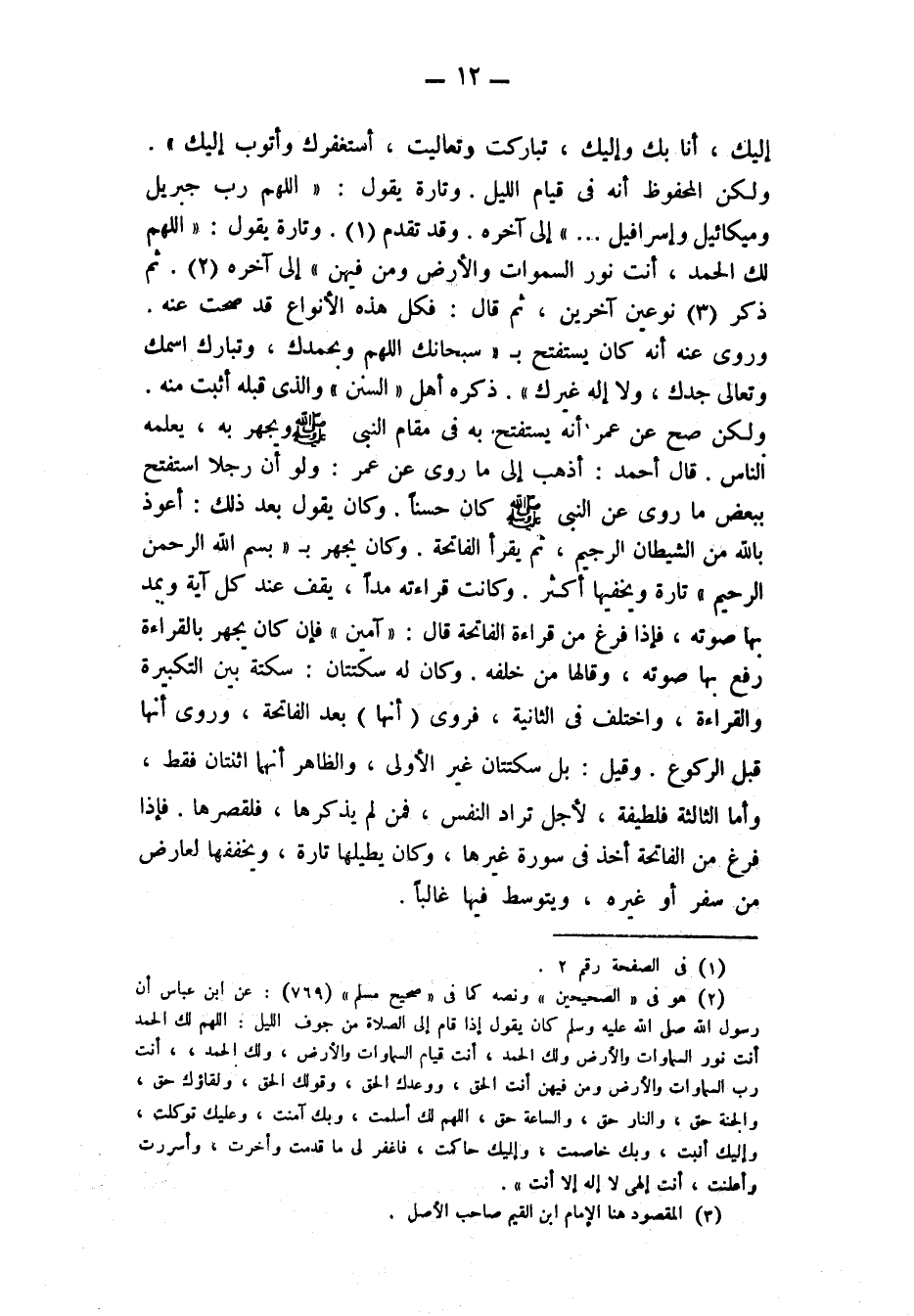 (¬2) هو في " الصحيحين " ونصه كما في " صَحِيحِ مسلم " (769) : عَنِ ابْنِ عَبَّاسٍ أَنَّ رَسُولَ اللَّهِ صَلَّى اللَّهُ عَلَيْهِ وَسَلَّمَ كَانَ يَقُولُ إذا قام إلى الصلاة في جوف الليل: اللَّهُمَّ لَكَ الْحَمْدُ أَنْتَ نُورُ السَّمَاوَاتِ وَالْأَرْضِ ولك الحمد، أنت قيام السماوات والأرض، ولك الحمد أنت رب السماوات والأرض ومن فيهن أَنْتَ الْحَقُّ، وَوَعْدُكَ الْحَقُّ، وَقَوْلُكَ الْحَقُّ، وَلِقَاؤُكَ حق، والجنة حق، والنار حَقٌّ، وَالسَّاعَةُ حَقٌّ، اللَّهُمَّ لَكَ أَسْلَمْتُ، وَبِكَ آمَنْتُ، وَعَلَيْكَ تَوَكَّلْتُ، وَإِلَيْكَ أَنَبْتُ، وَبِكَ خَاصَمْتُ، وإليك حاكمت، فاغفر لي ما قدمت وأخرت، وأسررت وأعلنت، أنت إلهي لا إله إلا أنت ".