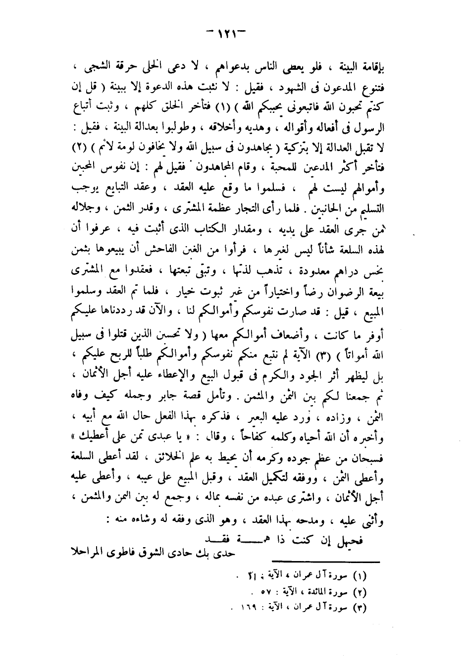 بإقامة البينة، فلو يعطى الناس بدعواهم، لادعى الخلي حرقة الشَّجِيِّ، فَتَنَوَّعَ الْمُدَّعُونَ فِي الشُّهُودِ، فَقِيلَ: لَا نثبت هذه الدعوة إِلَّا بِبَيِّنَةٍ {قُلْ إِنْ كُنْتُمْ تُحِبُّونَ اللَّهَ فَاتَّبِعُونِي يُحْبِبْكُمُ اللَّهُ} [آلِ عِمْرَانَ: 31] (¬1) فَتَأَخَّرَ الْخَلْقُ كُلُّهُمْ، وَثَبَتَ أَتْبَاعُ الرسول في أفعاله وأقواله، وهديه وأخلاقه، وطولبوا بعدالة البينة، فقيل: لَا تُقْبَلُ الْعَدَالَةُ إِلَّا بِتَزْكِيَةٍ {يُجَاهِدُونَ فِي سَبِيلِ اللَّهِ وَلَا يَخَافُونَ لَوْمَةَ لَائِمٍ} [المائدة: 54] (¬2) فَتَأَخَّرَ أَكْثَرُ الْمُدَّعِينَ لِلْمَحَبَّةِ، وَقَامَ الْمُجَاهِدُونَ، فَقِيلَ لَهُمْ: إِنَّ نُفُوسَ الْمُحِبِّينَ وَأَمْوَالَهُمْ لَيْسَتْ لَهُمْ، فسلموا ما وقع عليه العقد، وَعَقْدُ التَّبَايُعِ يُوجِبُ التَّسْلِيمَ مِنَ الْجَانِبَيْنِ.