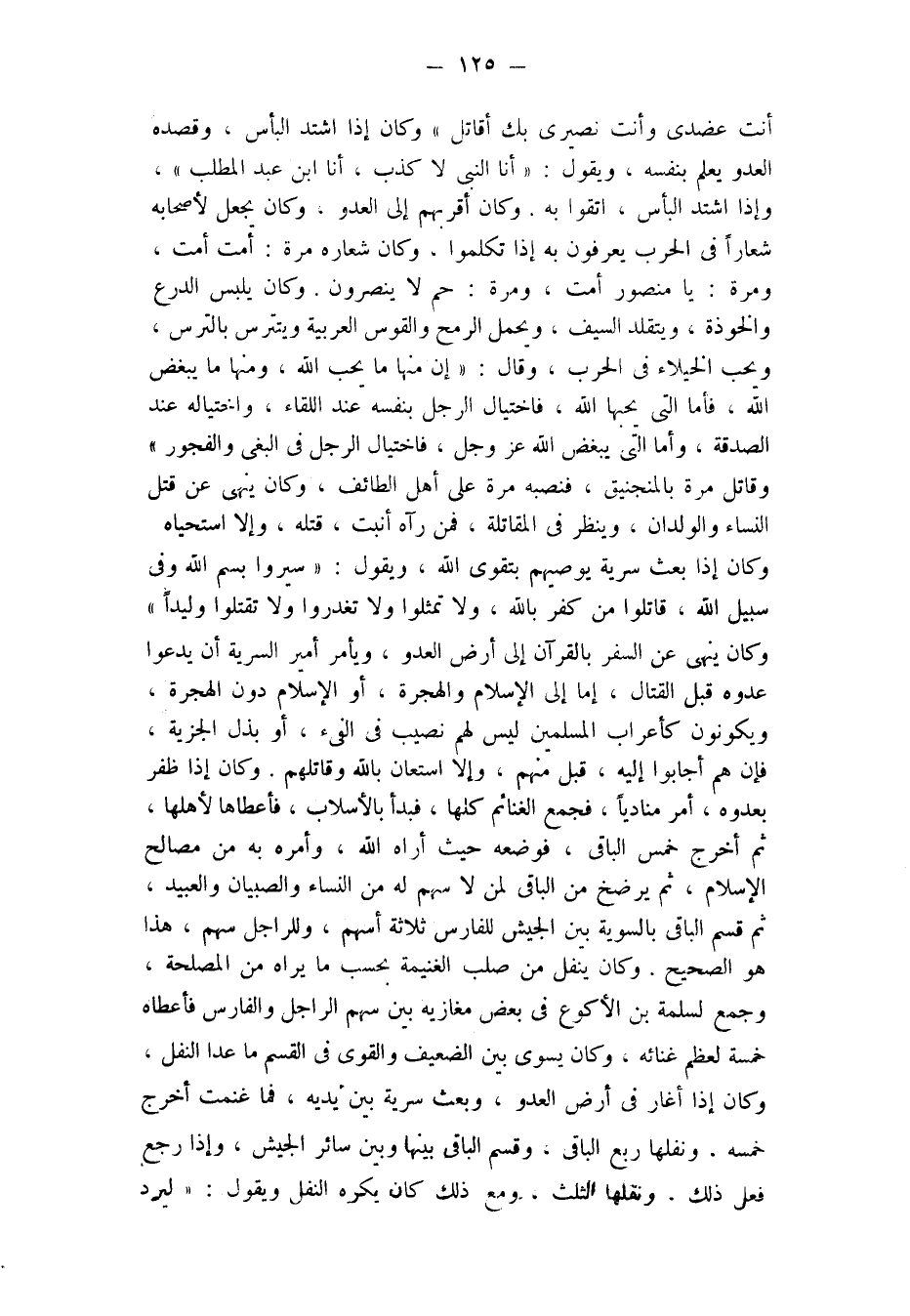 أنت عضدي وأنت نصيري، بك أقاتل» وكان إذا اشتد البأس وَقَصَدَهُ الْعَدُوُّ يُعْلِمُ بِنَفْسِهِ، وَيَقُولُ: «أَنَا النَّبِيُّ لَا كَذِبَ، أَنَا ابْنُ عَبْدِ المطلب» ، وإذا اشتد البأس، اتقوا به.