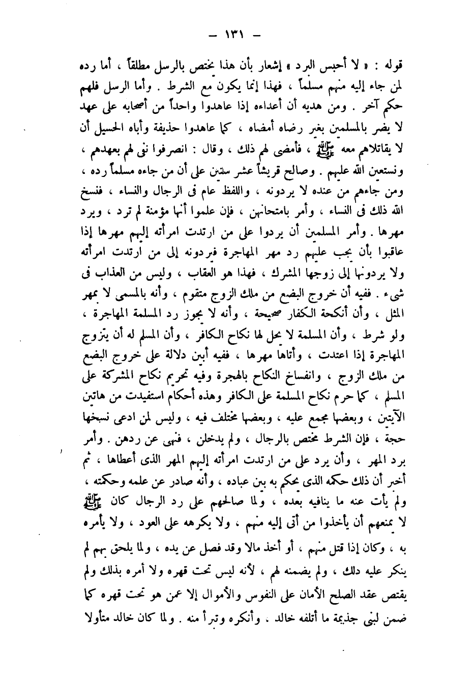 وأمر برد المهر، وأن يرد منه على من ارتدت امرأته إليهم الْمَهْرَ الَّذِي أَعْطَاهَا، ثُمَّ أَخْبَرَ أَنَّ ذَلِكَ حُكْمَهُ الَّذِي يَحْكُمُ بِهِ بَيْنَ عِبَادِهِ، وَأَنَّهُ صَادِرٌ عَنْ عِلْمِهِ وَحِكْمَتِهِ، وَلَمْ يَأْتِ عَنْهُ ما ينافيه بعده، ولما صالحهم على رد الرجال كان - صلى الله عليه وسلم - لا يمنعهم أَنْ يَأْخُذُوا مَنْ أَتَى إِلَيْهِ مِنْهُمْ، وَلَا يُكْرِهُهُ عَلَى الْعَوْدِ، وَلَا يَأْمُرُهُ بِهِ، وَكَانَ إِذَا قَتَلَ مِنْهُمْ، أَوْ أَخَذَ مَالًا وَقَدْ فَصَلَ عَنْ يَدِهِ، وَلَمَّا يَلْحَقْ بِهِمْ لَمْ يُنْكِرْ عَلَيْهِ ذَلِكَ، وَلَمْ يَضْمَنْهُ لَهُمْ، لِأَنَّهُ ليس تحت قهره وَلَا أَمَرَهُ بِذَلِكَ وَلَمْ يَقْتَضِ عَقْدُ الصُّلْحِ الْأَمَانَ عَلَى النُّفُوسِ وَالْأَمْوَالِ إِلَّا عَمَّنْ هُوَ تحت قهره، كما ضمن لبني جذيمة ما أتلفه خالد، وأنكره وتبرأ منه.