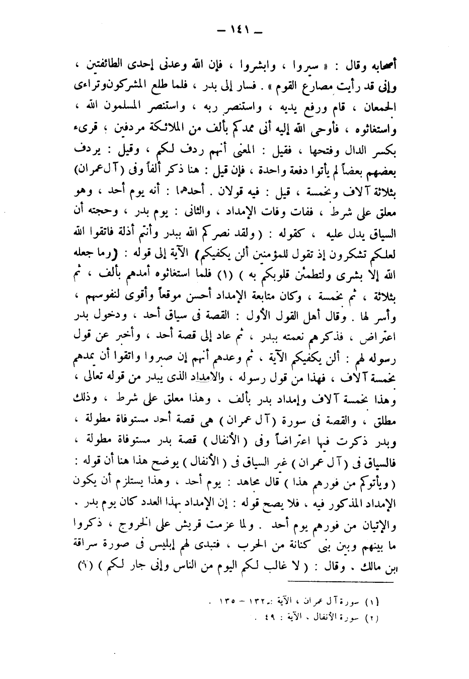 وقال أهل القول الأول: القصة في سياق أُحد، ودخول بدر اعتراض، فذكرهم نعمته ببدر، ثُمَّ عَادَ إِلَى قِصَّةِ أُحد، وَأَخْبَرَ عَنْ قول رسوله لهم: {أَلَنْ يَكْفِيَكُمْ} [آل عمران: 124] الآية، ثم وعدهم أنهم إن صبروا واتقوا أن يمدهم بِخَمْسَةِ آلَافٍ، فَهَذَا مِنْ قَوْلِ رَسُولِهِ، وَالْإِمْدَادُ الَّذِي بِبَدْرٍ مِنْ قَوْلِهِ تَعَالَى، وَهَذَا بِخَمْسَةِ آلَافٍ، وَإِمْدَادُ بَدْرٍ بِأَلْفٍ، وَهَذَا مُعَلَّقٌ عَلَى شَرْطٍ، وَذَلِكَ مُطْلَقٌ، وَالْقِصَّةُ فِي سُورَةِ (آلِ عِمْرَانَ) هِيَ قِصَّةُ أُحد مُسْتَوْفَاةٌ مُطَوَّلَةٌ، وَبَدْرٌ ذكرت فيها اعتراضا، وفي (الْأَنْفَالِ) قِصَّةُ بَدْرٍ مُسْتَوْفَاةٌ مُطَوَّلَةٌ، فَالسِّيَاقُ فِي (آلِ عِمْرَانَ) غَيْرُ السِّيَاقِ فِي (الْأَنْفَالِ) يُوَضِّحُ هذا هنا أَنَّ قَوْلَهُ: {وَيَأْتُوكُمْ مِنْ فَوْرِهِمْ هَذَا} [آل عمران: 125] قال مجاهد: يَوْمُ أُحد، وَهَذَا يَسْتَلْزِمُ أَنْ يَكُونَ الْإِمْدَادُ الْمَذْكُورُ فِيهِ، فَلَا يَصِحُّ قَوْلُهُ: إِنَّ الْإِمْدَادَ بهذا العدد كان يوم بدر، والإتيان من فورهم يوم أحد.