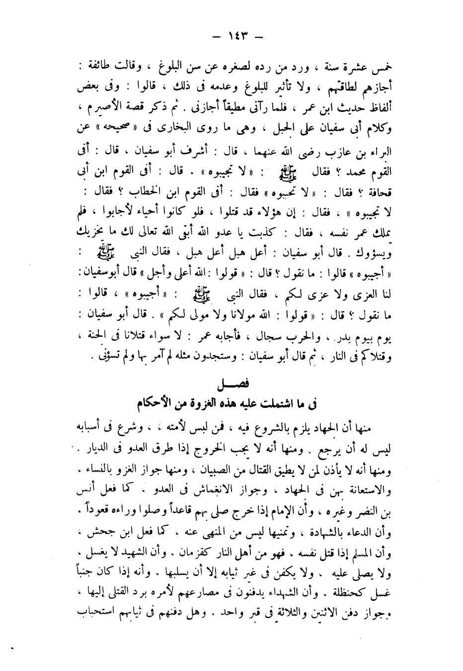 وَمِنْهَا جَوَازُ الْغَزْوِ بِالنِّسَاءِ، وَالِاسْتِعَانَةِ بِهِنَّ فِي الجهاد، وجواز الانغماس في العدو، كما فعل أنس بن النضر وغيره، وأن الإمام إذا خرج صلى بهم قاعدا وصلوا وراءه قعودا، وأن الدعاء بالشهادة، وتمنيها ليس من المنهي عنه كما فعل ابن جَحْشٍ، وأن الْمُسْلِمَ إِذَا قَتَلَ نَفْسَهُ، فَهُوَ مِنْ أَهْلِ النار كقزمان، وأن الشهيد لَا يُغَسَّلُ، وَلَا يُصَلَّى عَلَيْهِ، وَلَا يُكَفَّنُ في غير ثيابه إلا أن يسلبها، وأنه إذا كان جنبا غُسِّل كحنظلة، وأن الشهداء يدفنون في مصارعهم لأمره بردّ القتلى إليها، وجواز دفن الاثنين والثلاثة في قبر واحد، وهل دفنهم في ثيابهم استحباب