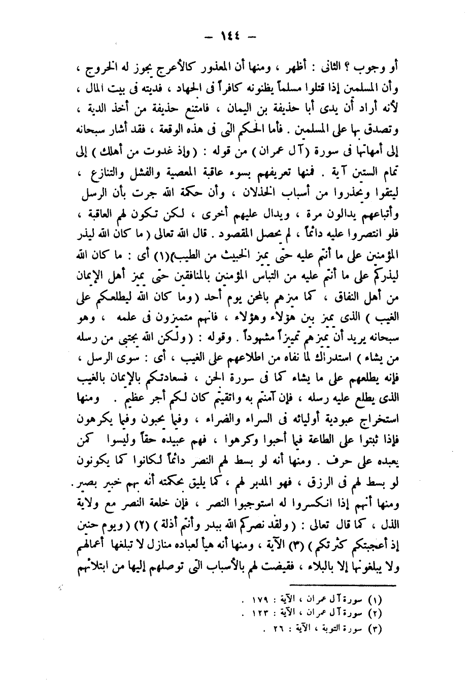 أو وجوب؟ الثاني: أظهر، ومنها أن المعذور كالأعرج يجوز له الخروج، وأن المسلمين إذا قتلوا مسلما يظنونه كافرا في الجهاد، فديتُه في بيت المال، لأنه أراد أن يدي أبا حذيفة بن اليمان، فَامْتَنَعَ حذيفة مِنْ أَخْذِ الدِّيَةِ، وَتَصَدَّقَ بِهَا على المسلمين.