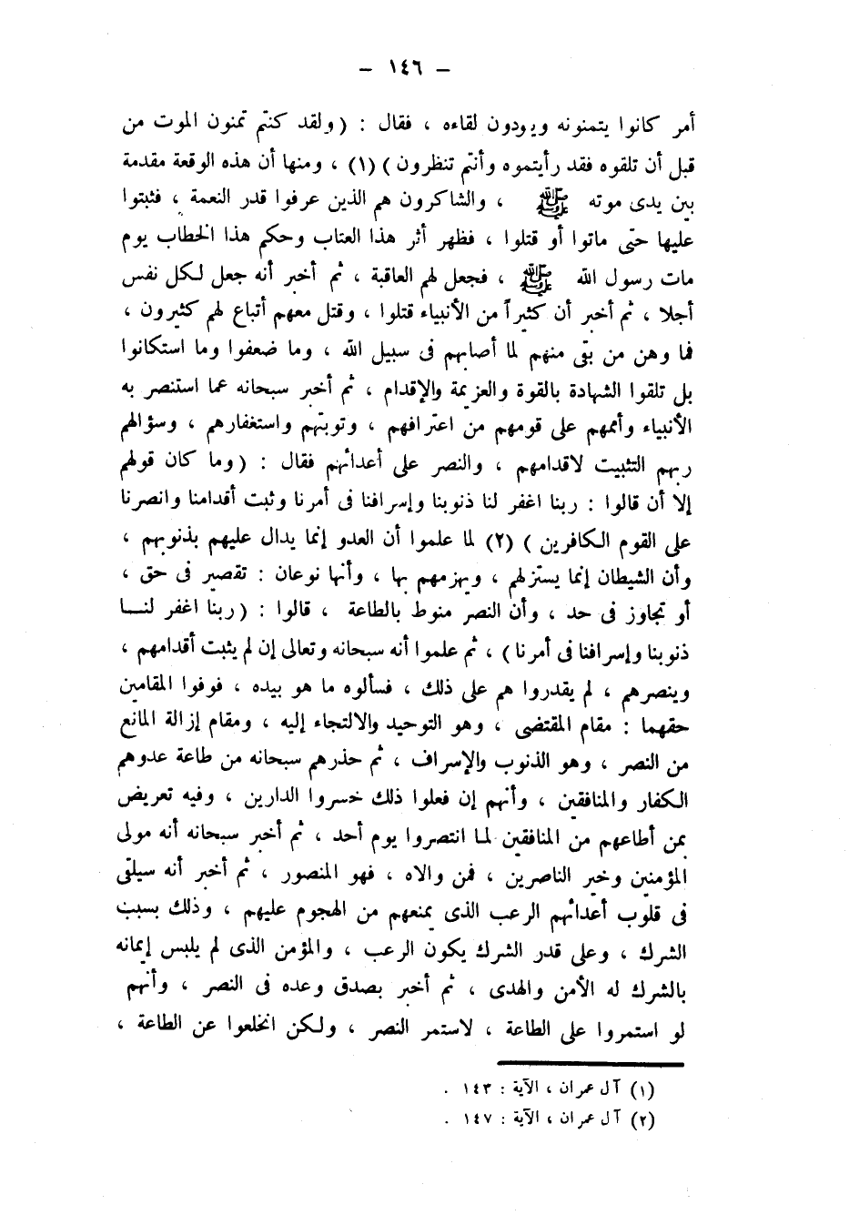 أَمْرٍ كَانُوا يَتَمَنَّوْنَهُ، وَيَوَدُّونَ لِقَاءَهُ، فَقَالَ: {وَلَقَدْ كُنْتُمْ تَمَنَّوْنَ الْمَوْتَ مِنْ قَبْلِ أَنْ تَلْقَوْهُ فَقَدْ رَأَيْتُمُوهُ وَأَنْتُمْ تَنْظُرُونَ} [آل عمران: 143] (¬1) وَمِنْهَا أن هذه الوقعة مقدمة بين يدي موته - صلى الله عليه وسلم - وَالشَّاكِرُونَ هُمُ الَّذِينَ عَرَفُوا قَدْرَ النِّعْمَةِ، فَثَبَتُوا عَلَيْهَا حَتَّى مَاتُوا أَوْ قُتِلُوا، فَظَهَرَ أَثَرُ هَذَا الْعِتَابِ وَحُكْمُ هَذَا الْخِطَابِ يَوْمَ مَاتَ رسول الله - صلى الله عليه وسلم - فجعل لهم العاقبة، ثم أخبر أنه جعل لكل نفس أجلا، ثم أخبر أن كثيرا من الأنبياء قُتلوا، وَقُتِلَ مَعَهُمْ أَتْبَاعٌ لَهُمْ كَثِيرُونَ، فَمَا وَهَنَ مَن بَقِيَ مِنْهُمْ لِمَا أَصَابَهُمْ فِي سبيل الله، وما ضعفوا وما اسْتَكَانُوا بَلْ تَلَقَّوُا الشَّهَادَةَ بِالْقُوَّةِ وَالْعَزِيمَةِ وَالْإِقْدَامِ، ثم أخبر سبحانه عما استنصر بِهِ الْأَنْبِيَاءُ وَأُمَمُهُمْ عَلَى قَوْمِهِمْ مِنَ اعْتِرَافِهِمْ، وتوبتهم واستغفارهم، وسؤالهم ربهم التثبيت لأقدامهم، والنصر عَلَى أَعْدَائِهِمْ فَقَالَ: {وَمَا كَانَ قَوْلَهُمْ إِلَّا أَنْ قَالُوا رَبَّنَا اغْفِرْ لَنَا ذُنُوبَنَا وَإِسْرَافَنَا فِي أَمْرِنَا وَثَبِّتْ أَقْدَامَنَا وَانْصُرْنَا عَلَى الْقَوْمِ الْكَافِرِينَ} [آل عمران: 147] (¬2) لما علموا أَنَّ الْعَدُوَّ إنَّمَا يُدال عَلَيْهِمْ بِذُنُوبِهِمْ، وَأَنَّ الشّيْطَانَ إنَّمَا يَسْتَزِلُّهُمْ، وَيَهْزِمُهُمْ بِهَا، وَأَنَّهَا نَوْعَانِ: تقصير في حق، أو تجاوز في حد، وأن النصر منوط بِالطَّاعَةِ قَالُوا: {رَبَّنَا اغْفِرْ لَنَا ذُنُوبَنَا وَإِسْرَافَنَا فِي أَمْرِنَا} [آل عمران: 147] ثم علموا أنه سبحانه وَتَعَالَى إنْ لَمْ يُثَبِّتْ أَقْدَامَهُمْ، وَيَنْصُرْهُمْ، لَمْ يقدروا على ذلك، فسألوه ما هو بيده، فَوَفَّوُا الْمَقَامَيْنِ حَقَّهُمَا: مَقَامَ الْمُقْتَضِي، وَهُوَ التَّوْحِيدُ والالتجاء إليه، ومقام إزالة المانع من النصر، وَهُوَ الذُّنُوبُ وَالْإِسْرَافُ، ثُمَّ حَذَّرَهُمْ سُبْحَانَهُ مِنْ طاعة عدوهم الكفار والمنافقين، وأنهم إن فعلوا ذلك خسروا الدارين، وفيه تعريض بمن أطاعهم من المنافقين لما انتصروا يَوْمَ أُحد، ثُمَّ أَخْبَرَ سُبْحَانَهُ أَنَّهُ مَوْلَى المؤمنين وخير الناصرين، فمن والاه، فهو المنصور، ثم أخبر أَنَّهُ سَيُلْقِي فِي قُلُوبِ أَعْدَائِهِمُ الرُّعْبَ الَّذِي يمنعهم من الهجوم عليهم، وذلك بسب الشرك، وعلى قدر الشرك يكون الرعب، والمؤمن الذي لم يلبس إيمانه بالشرك، له الأمن والهدى.