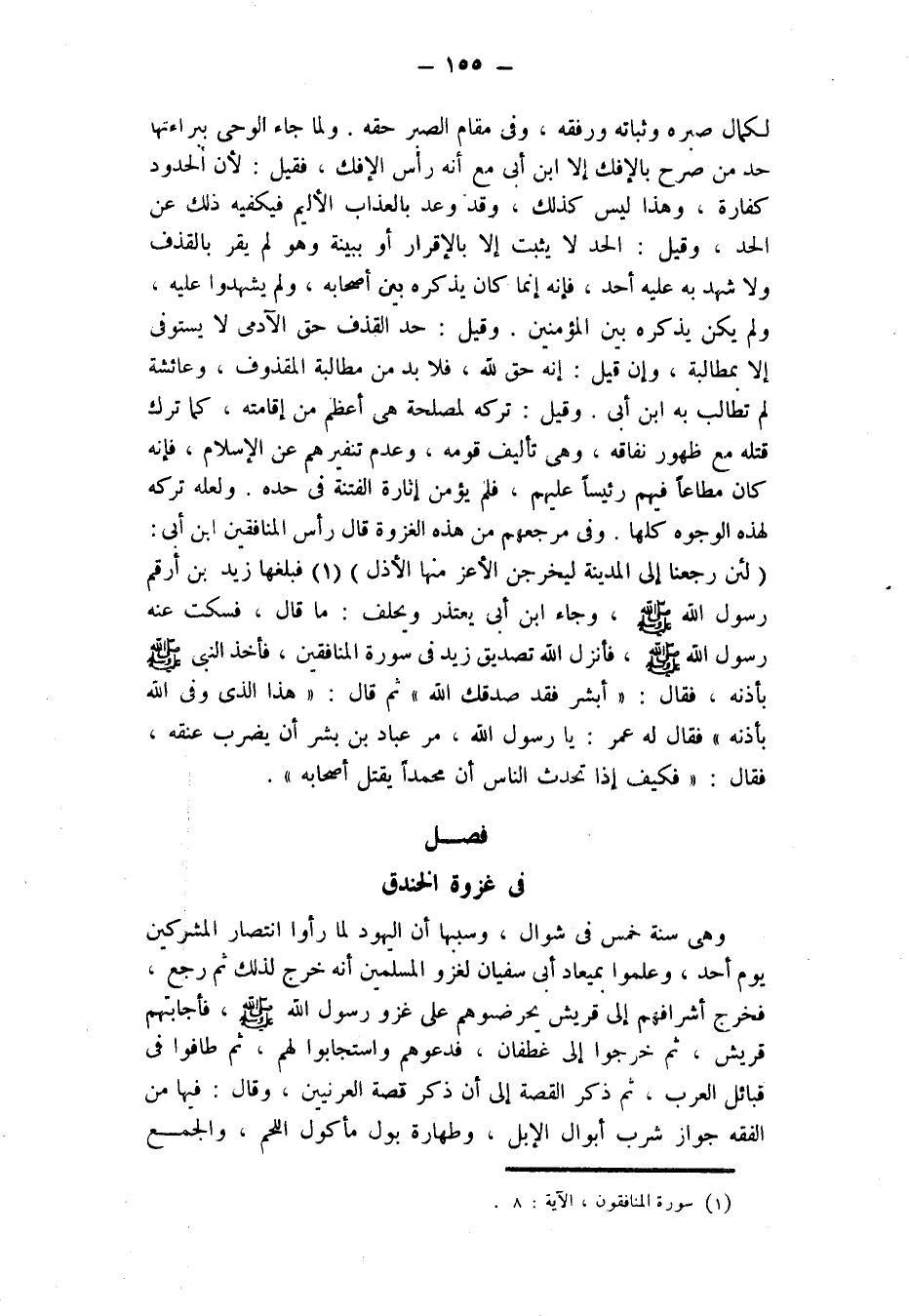 وَفِي مَرْجِعِهِمْ مِنْ هَذِهِ الْغَزْوَةِ قَالَ رَأْسُ الْمُنَافِقِينَ ابن أُبيّ: {لَئِنْ رَجَعْنَا إِلَى الْمَدِينَةِ لَيُخْرِجَنَّ الْأَعَزُّ مِنْهَا الْأَذَلَّ} [المنافقون: 8] (¬1) فَبَلَّغَهَا زَيْدُ بْنُ أَرْقَمَ رَسُولَ اللَّهِ - صَلَّى اللَّهُ عَلَيْهِ وَسَلَّمَ - وَجَاءَ ابن أبي يَعْتَذِرُ وَيَحْلِفُ: مَا قَالَ، فَسَكَتَ عَنْهُ رَسُولُ اللَّهِ - صَلَّى اللَّهُ عَلَيْهِ وَسَلَّمَ - فَأَنْزَلَ اللَّهُ تَصْدِيقَ زيد فِي سُورَةِ الْمُنَافِقِينَ، فَأَخَذَ النَّبِيُّ - صَلَّى اللَّهُ عَلَيْهِ وَسَلَّمَ - بِأُذُنِهِ، فَقَالَ: " أَبْشِرْ فَقَدْ صَدَقَكَ اللَّهُ "، ثمَّ قَالَ: " هَذَا الَّذِي وَفَّى الله بِأُذُنِهِ "، فَقَالَ لَهُ عمر: يَا رَسُولَ اللَّهِ، مر عباد بن بشر أن يضرب عُنُقَهُ، فَقَالَ: " فَكَيْفَ إذَا تَحَدَّثَ النَّاسُ أَنَّ مُحَمَّدًا يَقْتُلُ أَصْحَابَهُ ".