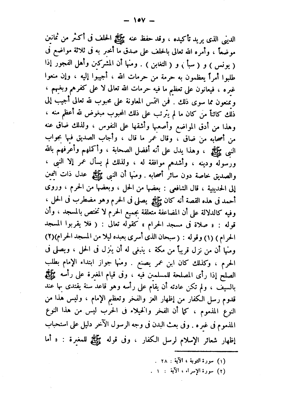 وَمِنْهَا أَنَّ النَّبِيَّ - صَلَّى اللَّهُ عَلَيْهِ وَسَلَّمَ - عَدَلَ ذَاتَ الْيَمِينِ إِلَى الْحُدَيْبِيَةِ، قَالَ الشَّافِعِيُّ: بَعْضُهَا مِنَ الْحِلِّ، وبعضها من الحرم، وروى أحمد في هذه القصة أنه كان - صلى الله عليه وسلم - يُصَلِّي فِي الْحَرَمِ وَهُوَ مُضْطَرِبٌ فِي الحِل، وفيه كالدلالة على أن المضاعفة متعلقة بجميع الحرم لا تختص بالمسجد، وأن قوله: صلاة في مسجد الحرام، كَقَوْلِهِ تَعَالَى: {فَلَا يَقْرَبُوا الْمَسْجِدَ الْحَرَامَ} [التوبة: 28] (¬1) وقوله: {سُبْحَانَ الَّذِي أَسْرَى بِعَبْدِهِ لَيْلًا مِنَ الْمَسْجِدِ الْحَرَامِ} [الإسراء: 1] (¬2) .
