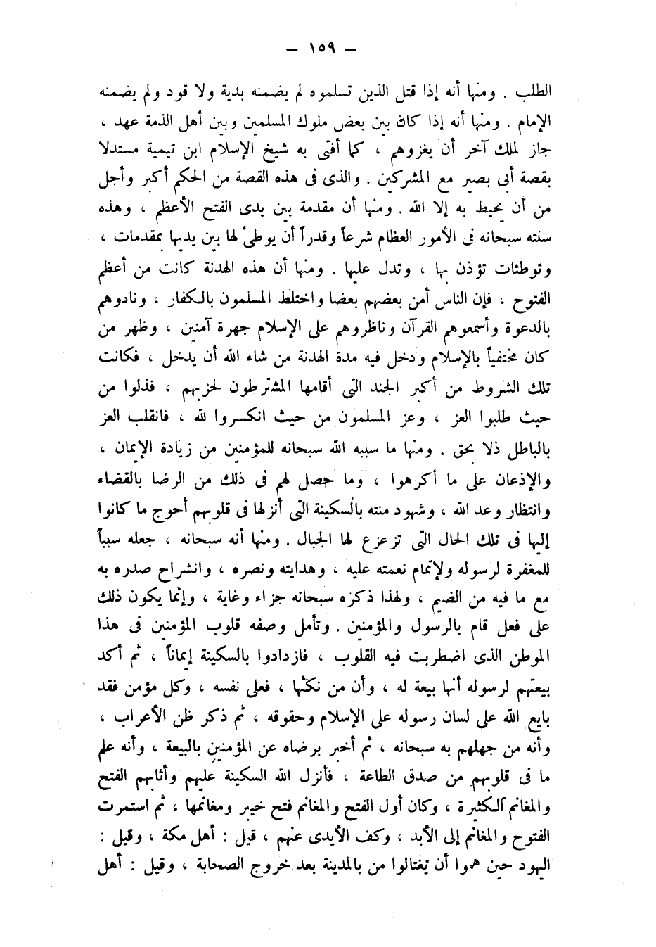 وَمِنْهَا أَنَّ هذه الهدنة مِنْ أَعْظَمِ الْفُتُوحِ، فَإِنَّ النَّاسَ أَمِنَ بَعْضُهُمْ بعضا واختلط المسلمون بالكفار، ونادوهم بِالدَّعْوَةِ وَأَسْمَعُوهُمُ الْقُرْآنَ وَنَاظَرُوهُمْ عَلَى الْإِسْلَامِ جَهْرَةً آمِنِينَ، وَظَهَرَ مَنْ كَانَ مُخْتَفِيًا بِالْإِسْلَامِ وَدَخَلَ فيه مُدَّةَ الْهُدْنَةِ مَنْ شَاءَ اللَّهُ أَنْ يَدْخُلَ، فكانت تلك الشروط من أكبر الجند التي أقامها المشترطون لحزبهم، فذلوا من حيث طلبوا العز، وعز المسلمون من حيث انكسروا لله، فانقلب العز بالباطل ذلا بحق.