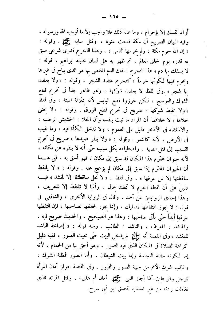 وفيه البيان الصريح أن مكة فتحت عنوة، وقتل سابه صلى الله عليه وسلم، وقوله: «إن الله حرم مكة، ولم يحرمها الناس» ، وهذا التحريم قدري شرعي سبق به قدره يوم خلق الْعَالَمَ، ثُمَّ ظَهَرَ بِهِ عَلَى لِسَانِ خَلِيلِهِ إبراهيم، قوله: «لا يُسفك بها دم» هذا التحريم لسفك الدم المختص بها هو الَّذِي يُبَاحُ فِي غَيْرِهَا، وَيَحْرُمُ فِيهَا لِكَوْنِهَا حرما كتحريم عضد الشجر، وقوله: «ولا يعضد بها شجر» ، وفي لفظ: «لا يعضد شوكها» ، وهو ظَاهِرٌ جِدًّا فِي تَحْرِيمِ قَطْعِ الشَّوْكِ وَالْعَوْسَجِ، لكن جوزوا قطع اليابس لأنه بمنزلة الميتة، وفي لفظ: «ولا يخبط شوكها» صريح في تحريم قطع الورق.