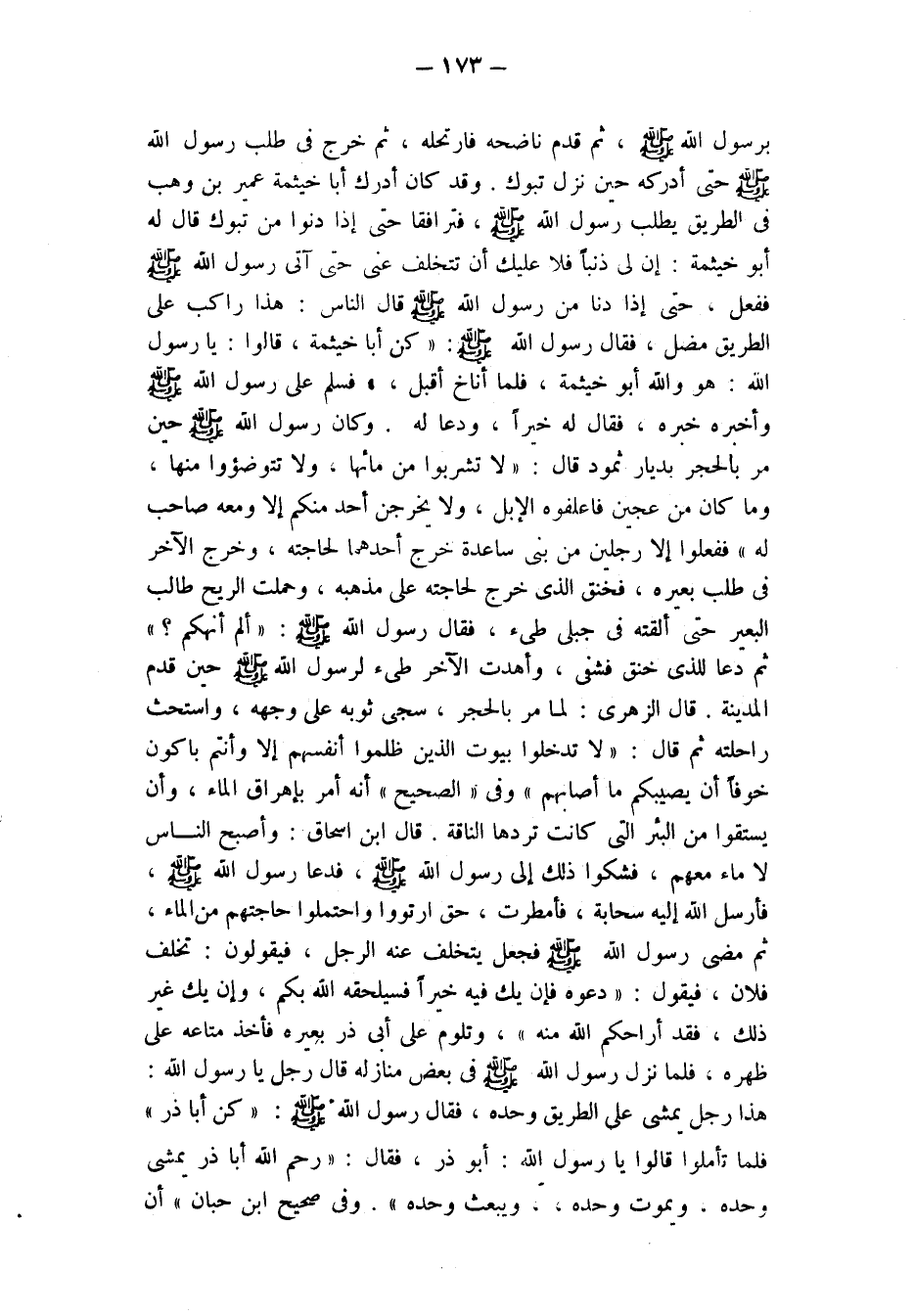 برسول الله صلى الله عليه وسلم، ثُمَّ قَدَّمَ نَاضِحَهُ فَارْتَحَلَهُ، ثُمَّ خَرَجَ فِي طَلَبِ رَسُولِ اللَّهِ صَلَّى اللَّهُ عَلَيْهِ وَسَلَّمَ حَتَّى أَدْرَكَهُ حِينَ نَزَلَ تَبُوكَ.