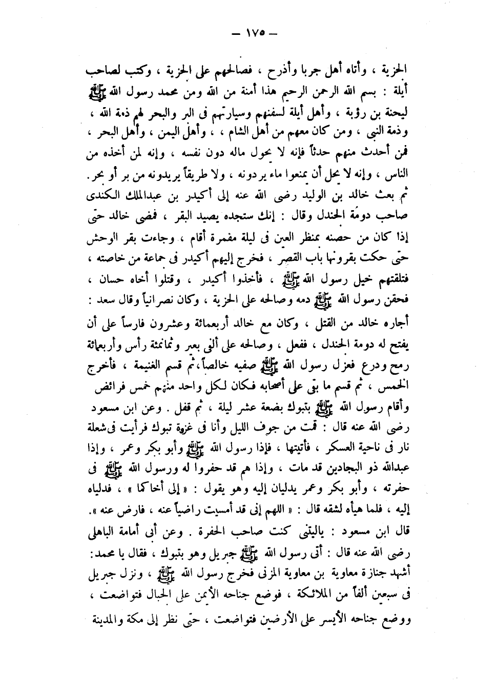 الجزية، وأتاه أهل جربا وأذرح، فصالحهم على الجزية، وَكَتَبَ لِصَاحِبِ أَيْلَةَ: «بِسْمِ اللَّهِ الرَّحْمَنِ الرَّحِيمِ: هذا أمنة من الله ومن مُحَمَّدٍ رَسُولِ اللَّهِ صَلَّى اللَّهُ عَلَيْهِ وَسَلَّمَ ليحنة بن رؤبة، وأهل أيلة لسفنهم وَسَيَّارَتِهِمْ فِي الْبَرِّ وَالْبَحْرِ لَهُمْ ذِمَّةُ اللَّهِ، وذمة النَّبِيِّ، وَمَنْ كَانَ مَعَهُمْ مِنْ أَهْلِ الشَّامِ وَأَهْلِ الْيَمَنِ وَأَهْلِ الْبَحْرِ، فَمَنْ أَحْدَثَ مِنْهُمْ حَدَثًا فَإِنَّهُ لَا يَحُولُ مَالُهُ دُونَ نَفْسِهِ، وَإِنَّهُ لِمَنْ أَخَذَهُ مِنَ النَّاسِ، وَإِنَّهُ لَا يَحِلُّ أَنْ يَمْنَعُوا مَاءً يَرِدُونَهُ، وَلَا طَرِيقًا يريدونه من بر أو بحر» .