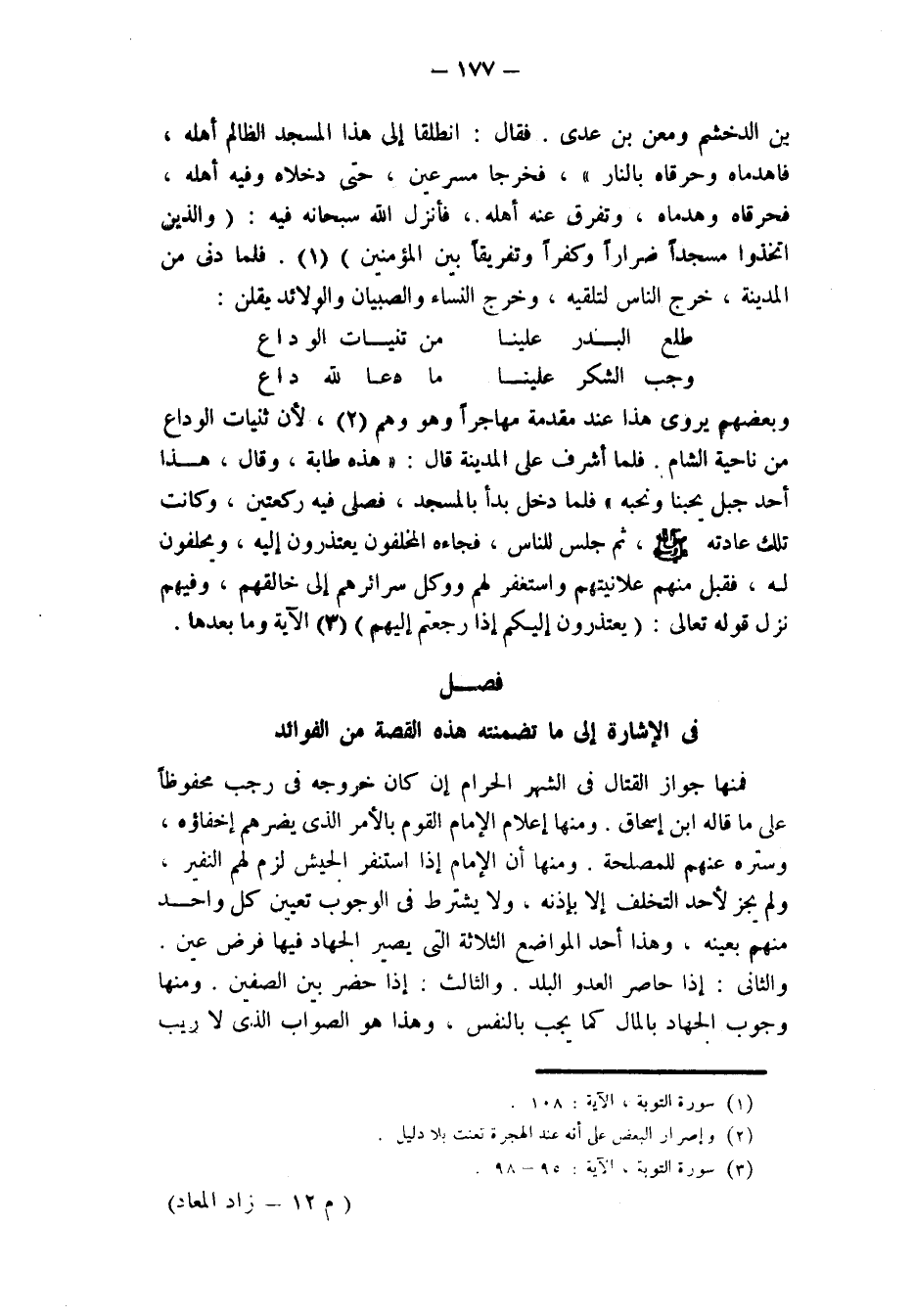 بن الدخشم ومعن بن عدي فَقَالَ: «انْطَلِقَا إِلَى هَذَا الْمَسْجِدِ الظَّالِمِ أَهْلُهُ، فاهدماه وحرقاه بالنار» ، فخرجا مسرعين، حتى دخلاه وفيه أهله، فحرقاه وهدماه، وتفرق عنه أهله، فأنزل الله سبحانه فِيهِ: {وَالَّذِينَ اتَّخَذُوا مَسْجِدًا ضِرَارًا وَكُفْرًا وَتَفْرِيقًا بَيْنَ الْمُؤْمِنِينَ} [التوبة: 107] (¬1) فلما دنا مِنَ الْمَدِينَةِ خَرَجَ النَّاسُ لِتَلَقِّيهِ، وَخَرَجَ النِّسَاءُ وَالصِّبْيَانُ وَالْوَلَائِدُ يَقُلْنَ: