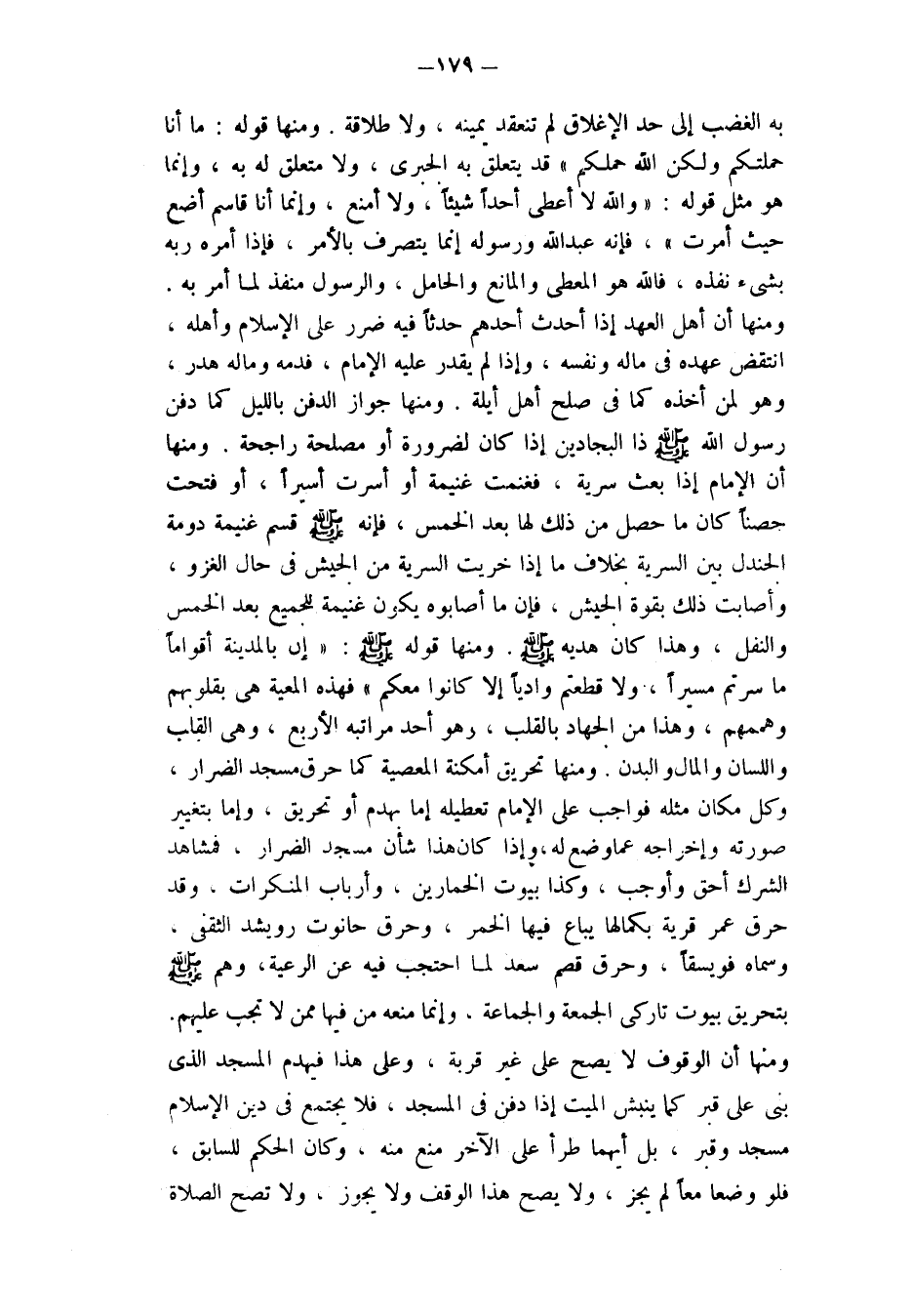 ومنها تحريق أمكنة المعصية كما حرق مسجد الضرار، وكل مكان مثله فواجب على الإمام تعطيله إما بهدم أو تحريق، وَإِمَّا بِتَغْيِيرِ صُورَتِهِ وَإِخْرَاجِهِ عَمَّا وُضع لَهُ، وَإِذَا كَانَ هَذَا شَأْنَ مَسْجِدِ الضِّرَارِ، فَمَشَاهِدُ الشرك أحق وأوجب، وكذا بيوت الخمارين، وأرباب المنكرات، وقد حرق عمر قَرْيَةً بِكَمَالِهَا يُبَاعُ فِيهَا الْخَمْرُ، وَحَرَقَ حَانُوتَ رويشد الثقفي وَسَمَّاهُ فُوَيْسِقًا، وَحَرَقَ قَصْرَ سعد لما احتجب فيه عن الرعية، وهمَّ صَلَّى اللَّهُ عَلَيْهِ وَسَلَّمَ بِتَحْرِيقِ بُيُوتِ تَارِكِي الجمعة والجماعة، وإنما منعه من فيها ممن لا تجب عليهم.