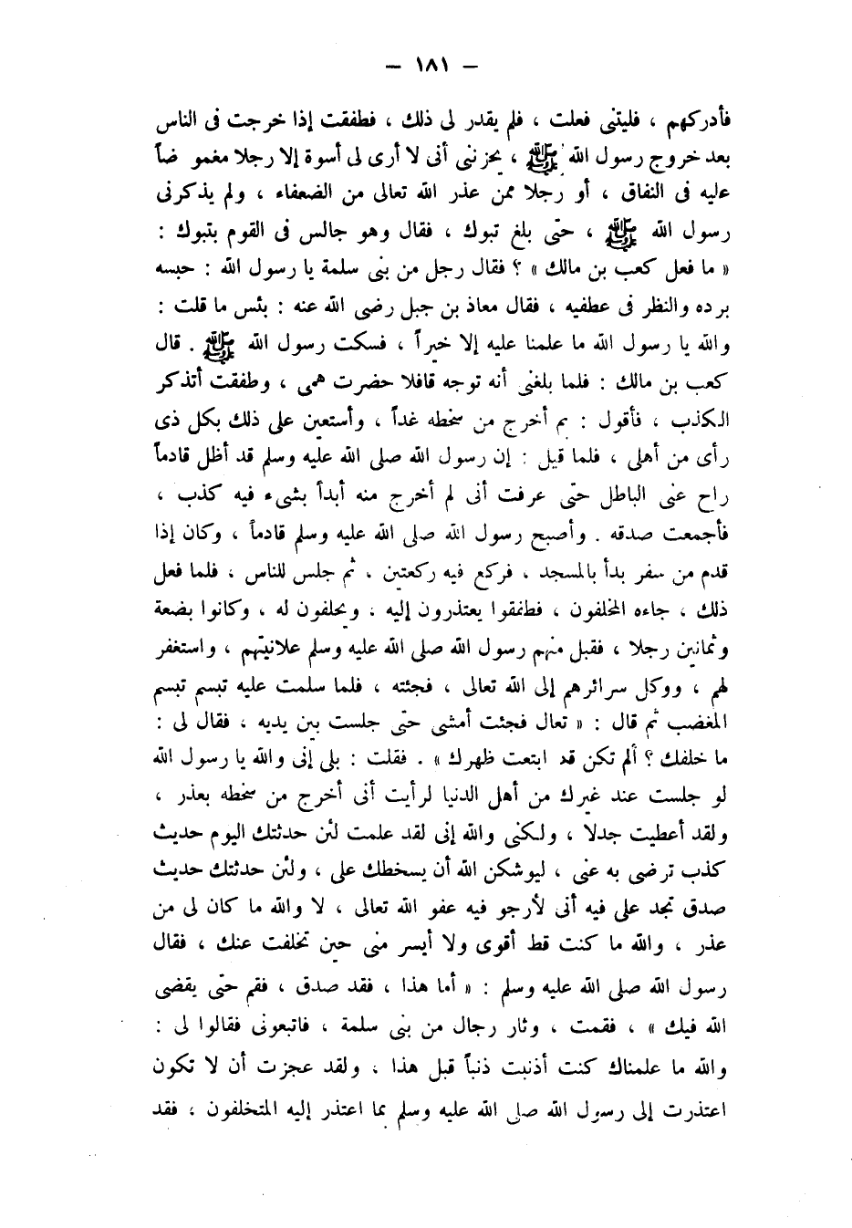 وأصبح رسول الله صلى الله عليه وسلم قادما، وَكَانَ إِذَا قَدِمَ مِنْ سَفَرٍ بَدَأَ بِالْمَسْجِدِ، فركع فيه ركعتين، ثم جلس للناس، فلما فعل ذلك، جاءه الْمُخَلَّفُونَ، فَطَفِقُوا يَعْتَذِرُونَ إِلَيْهِ، وَيَحْلِفُونَ لَهُ، وَكَانُوا بِضْعَةً وَثَمَانِينَ رَجُلًا، فَقَبِلَ مِنْهُمْ رَسُولُ اللَّهِ صلى الله عليه وسلم علانيتهم، واستغفر لهم، ووكّل سرائرهم إلى الله تعالى، فجئته، فلما سلّمت عليه تبسَّمَ تبسُّم المغضب ثم قال: " تعال " فَجِئْتُ أَمْشِي حَتَّى جَلَسْتُ بَيْنَ يَدَيْهِ، فَقَالَ لِي: " مَا خَلَّفَكَ؟ أَلَمْ تَكُنْ قَدِ ابْتَعْتَ ظهرك " فقلت: بلى إني والله يا رسول الله لَوْ جَلَسْتُ عِنْدَ غَيْرِكَ مِنْ أَهْلِ الدُّنْيَا لرأيت أني أَخْرُجَ مِنْ سَخَطِهِ بِعُذْرٍ، وَلَقَدْ أُعْطِيتُ جَدَلًا، ولكني والله إني لقد علمت لئن حدثتك اليوم حديث كذب ترضى به عني، لَيُوشِكَنَّ اللَّهُ أَنْ يُسْخِطَكَ عليَّ، وَلَئِنْ حَدَّثْتُكَ حَدِيثَ صِدْقٍ تَجِدُ عَلَيَّ فِيهِ إِنِّي لَأَرْجُو فيه عفو الله تعالى، لا وَاللَّهِ مَا كَانَ لِي مِنْ عُذر، وَاللَّهِ مَا كُنْتُ قَطُّ أَقْوَى وَلَا أَيْسَرَ مِنِّي حِينَ تَخَلَّفْتُ عَنْكَ، فَقَالَ رَسُولُ اللَّهِ صَلَّى اللَّهُ عَلَيْهِ وَسَلَّمَ: " أَمَّا هَذَا، فَقَدْ صَدَقَ، فَقُمْ حَتَّى يَقْضِيَ اللَّهُ فِيكَ "، فَقُمْتُ، وَثَارَ رجال من بني سلمة، فاتبعوني فَقَالُوا لِي: وَاللَّهِ مَا عَلِمْنَاكَ كُنْتَ أَذْنَبْتَ ذنبا قبل هذا، ولقد عجزت أن لا تَكُونَ اعْتَذَرْتَ إِلَى رَسُولِ اللَّهِ صَلَّى اللَّهُ عليه وسلم بما اعتذر إليه المتخلفون، فقد
