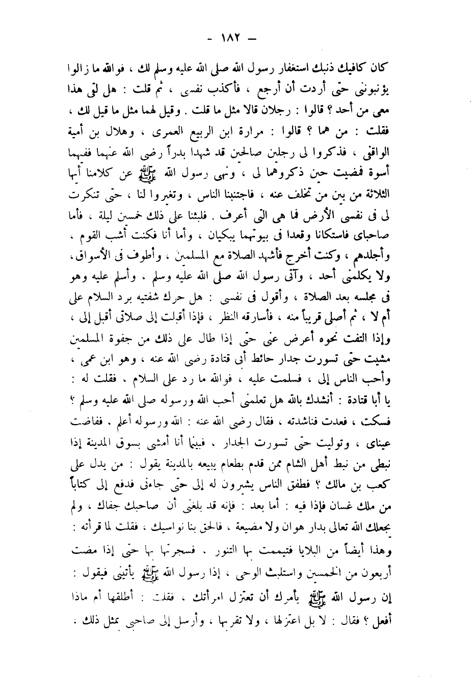كَانَ كَافِيَكَ ذَنْبَكَ استغفارُ رَسُولِ اللَّهِ صَلَّى الله عليه وسلم لك. فوالله ما زالوا يؤنبونني حَتَّى أَرَدْتُ أَنْ أَرْجِعَ، فَأُكَذِّبَ نَفْسِي، ثُمَّ قلت: هل لقي هذا معي من أحد؟ قالوا: رَجُلَانِ قَالَا مِثْلَ مَا قُلْتَ، فَقِيلَ لَهُمَا مِثْلَ مَا قِيلَ لَكَ، فَقُلْتُ: مَنْ هُمَا؟ قالوا: مرارة بن الربيع العمري، وهلال بن أمية الواقفي. فَذَكَرُوا لِي رَجُلَيْنِ صالحين قد شهدا بدرا رضي الله عنهما ففيهما أُسْوَةٌ فَمَضَيْتُ حِينَ ذَكَرُوهُمَا لِي، وَنَهَى رَسُولُ اللَّهِ صَلَّى اللَّهُ عَلَيْهِ وَسَلَّمَ عَنْ كَلَامِنَا أَيُّهَا الثَّلَاثَةُ مِنْ بَيْنِ مَنْ تَخَلَّفَ عَنْهُ، فَاجْتَنَبَنَا النَّاسُ وَتَغَيَّرُوا لَنَا، حَتَّى تَنَكَّرَتْ لِيَ في نفسي الأرض فما هي التي أَعْرِفُ.