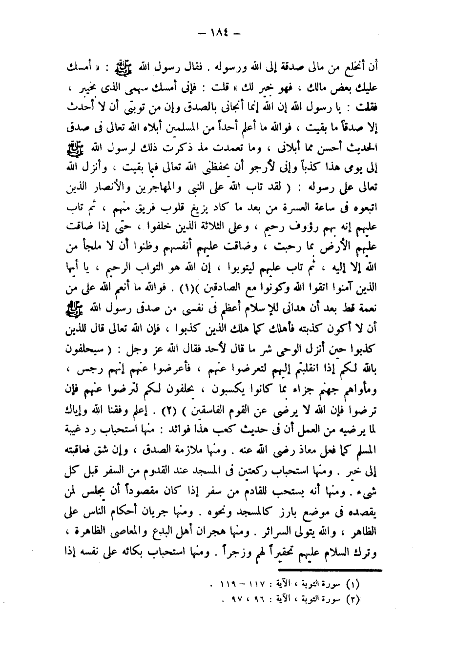 فَقَالَ رَسُولُ اللَّهِ صَلَّى اللَّهُ عَلَيْهِ وَسَلَّمَ: " أَمْسِكْ عَلَيْكَ بَعْضَ مَالِكَ، فَهُوَ خَيْرٌ لَكَ " قُلْتُ: فَإِنِّي أُمْسِكُ سَهْمِيَ الَّذِي بِخَيْبَرَ، فَقُلْتُ: يَا رَسُولَ اللَّهِ إِنَّ اللَّهَ إِنَّمَا أنجاني بالصدق وإن من توبتي أن لا أحدِّث إِلَّا صِدْقًا مَا بَقِيتُ، فَوَاللَّهِ مَا أعلم أحدا من المسلمين أبلاه الله تعالى في صدق الحديث أحسن مما أبلاني، وما تعمدت مذ ذَكَرْتُ ذَلِكَ لِرَسُولِ اللَّهِ صَلَّى اللَّهُ عَلَيْهِ وَسَلَّمَ إِلَى يَوْمِي هَذَا كَذِبًا وَإِنِّي لَأَرْجُوُ أَنْ يحفظني الله تعالى فيما بقيت، وأنزل اللَّهُ تَعَالَى عَلَى رَسُولِهِ: {لَقَدْ تَابَ اللَّهُ عَلَى النَّبِيِّ وَالْمُهَاجِرِينَ وَالْأَنْصَارِ الَّذِينَ اتَّبَعُوهُ فِي سَاعَةِ الْعُسْرَةِ مِنْ بَعْدِ مَا كَادَ يَزِيغُ قُلُوبُ فَرِيقٍ مِنْهُمْ ثُمَّ تَابَ عَلَيْهِمْ إِنَّهُ بِهِمْ رَءُوفٌ رَحِيمٌ - وَعَلَى الثَّلَاثَةِ الَّذِينَ خُلِّفُوا حَتَّى إِذَا ضَاقَتْ عَلَيْهِمُ الْأَرْضُ بِمَا رَحُبَتْ وَضَاقَتْ عَلَيْهِمْ أَنْفُسُهُمْ وَظَنُّوا أَنْ لَا مَلْجَأَ مِنَ اللَّهِ إِلَّا إِلَيْهِ ثُمَّ تَابَ عَلَيْهِمْ لِيَتُوبُوا إِنَّ اللَّهَ هُوَ التَّوَّابُ الرَّحِيمُ - يَا أَيُّهَا الَّذِينَ آمَنُوا اتَّقُوا اللَّهَ وَكُونُوا مَعَ الصَّادِقِينَ} [التوبة: 117 - 119] (¬1) .