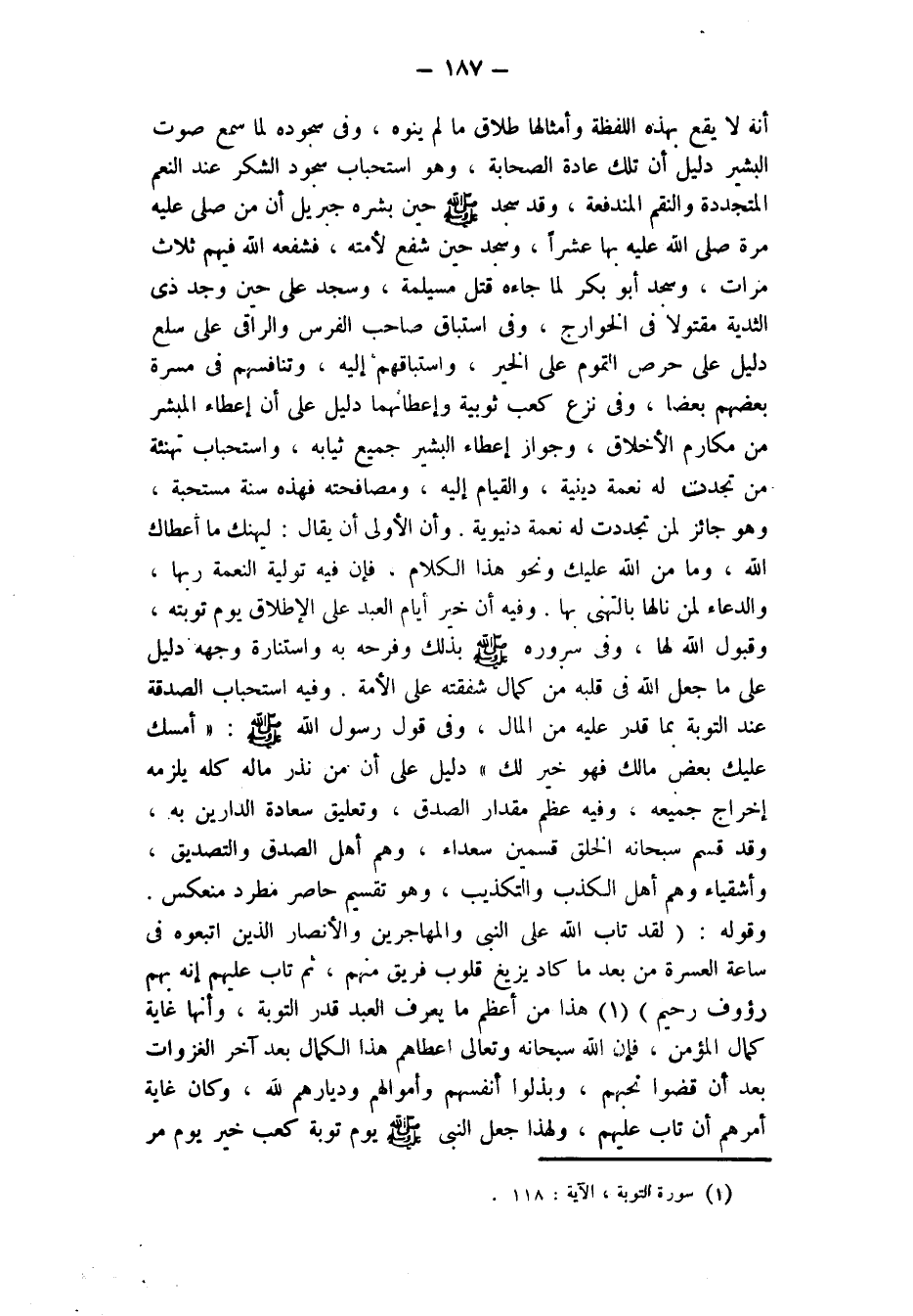 وقوله: {لَقَدْ تَابَ اللَّهُ عَلَى النَّبِيِّ وَالْمُهَاجِرِينَ وَالْأَنْصَارِ الَّذِينَ اتَّبَعُوهُ فِي سَاعَةِ الْعُسْرَةِ مِنْ بَعْدِ مَا كَادَ يَزِيغُ قُلُوبُ فَرِيقٍ مِنْهُمْ ثُمَّ تَابَ عَلَيْهِمْ إِنَّهُ بِهِمْ رَءُوفٌ رَحِيمٌ} [التوبة: 117] (¬1) هَذَا مِنْ أَعْظَمِ مَا يُعَرِّفُ الْعَبْدَ قَدْرَ التوبة، وأنها غاية كمال المؤمن، فإن الله سبحانه وتعالى أَعْطَاهُمْ هَذَا الْكَمَالَ بَعْدَ آخِرِ الْغَزَوَاتِ بَعْدَ أن قضوا نحبهم، وبذلوا أنفسهم وَأَمْوَالَهُمْ وَدِيَارَهُمْ لِلَّهِ، وَكَانَ غَايَةَ أَمْرِهِمْ أَنْ تَابَ عَلَيْهِمْ، وَلِهَذَا جَعَلَ النَّبِيُّ صَلَّى اللَّهُ عَلَيْهِ وَسَلَّمَ يَوْمَ تَوْبَةِ كَعْبٍ خَيْرَ يَوْمٍ مر