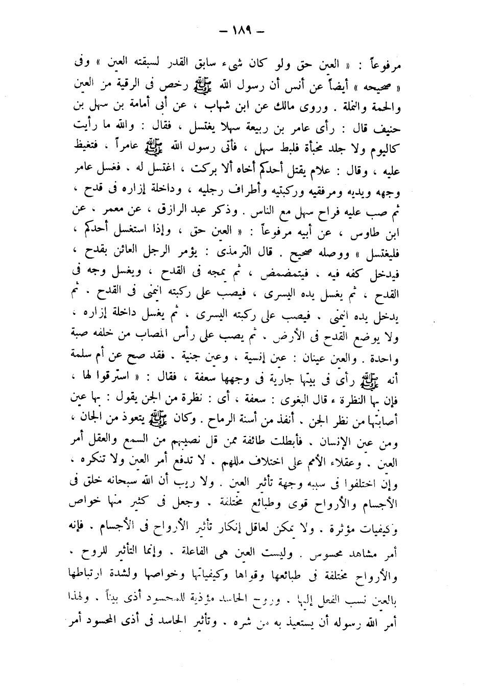 وليست العين هِيَ الْفَاعِلَةَ، وَإِنَّمَا التَّأْثِيرُ لِلرُّوحِ، وَالْأَرْوَاحُ مُخْتَلِفَةٌ في طبائعها وقواها وكيفياتها وخواصها ولشدة ارتباطها بالعين نسب الفعل إليها، وروح الْحَاسِدِ مُؤْذِيَةٌ لِلْمَحْسُودِ أَذًى بيِّنًا، وَلِهَذَا أَمَرَ الله رَسُولَهُ أَنْ يَسْتَعِيذَ بِهِ مِنْ شَرِّهِ، وَتَأْثِيرُ الْحَاسِدِ فِي أَذَى الْمَحْسُودِ أَمْرٌ